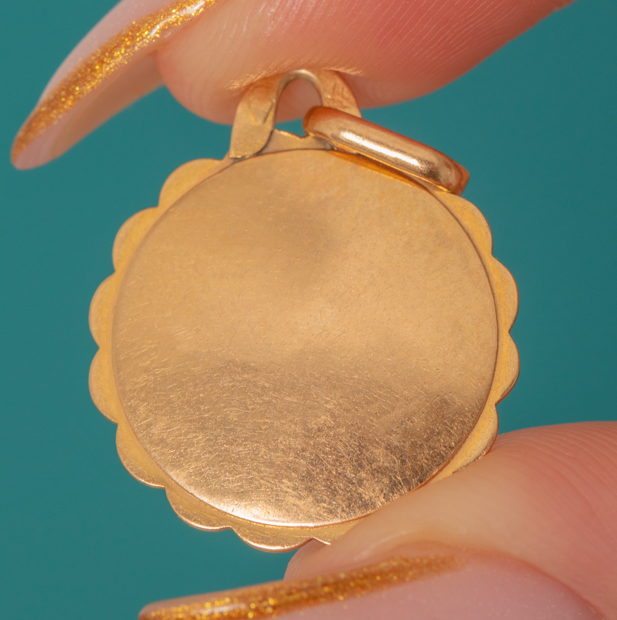Three Rubies are set within the design to symbolise passion and enduring love — a romantic detail unique to these cherished tokens. With crisp French stamps and a softly domed reverse that feels silky against the skin, this is a superb example of early 20th-century sentimental jewellery.