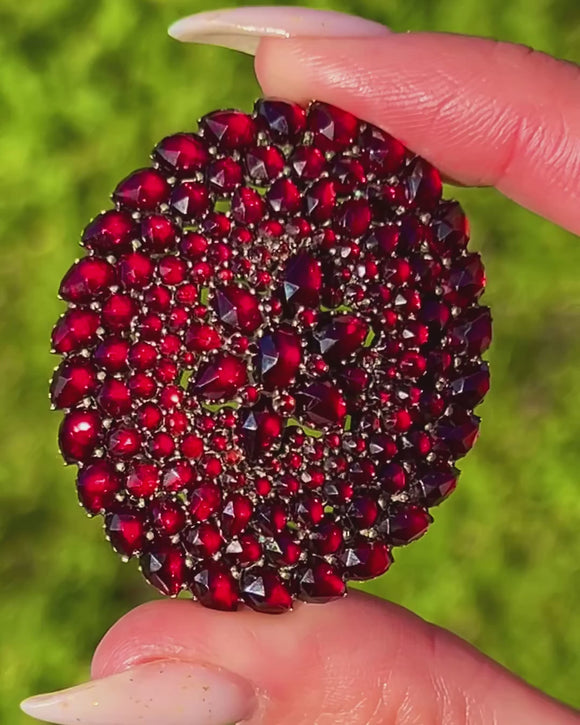 Glowing with saturated pomegranate-red light, this dramatic Victorian brooch pendant is a triumph of pavé-set Garnets. The domed cluster is arranged in concentric rosette tiers with a star-like centre, culminating in a scalloped fringe of pear-shaped stones—an opulent Victorian statement that shimmers beautifully on the neckline or lapel.