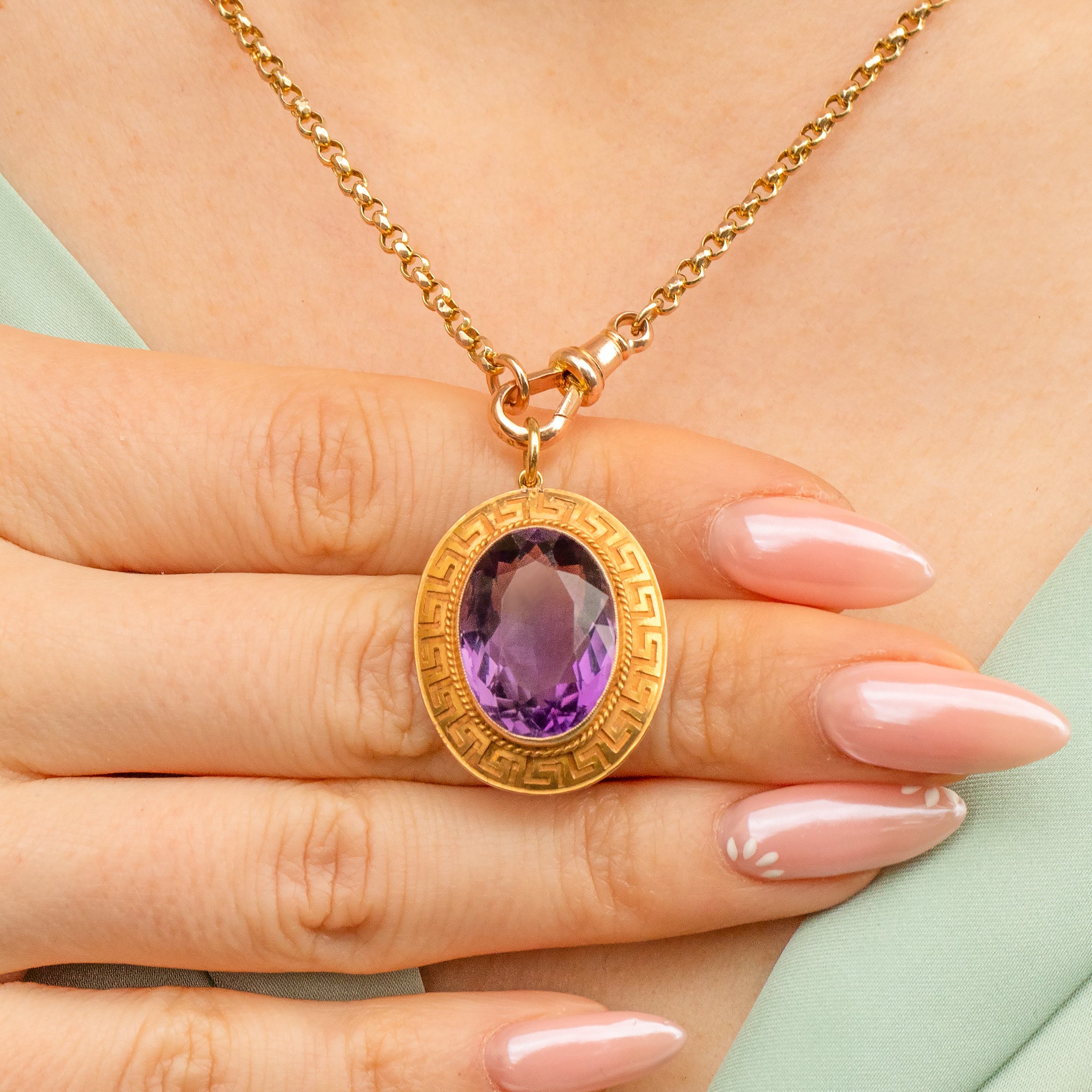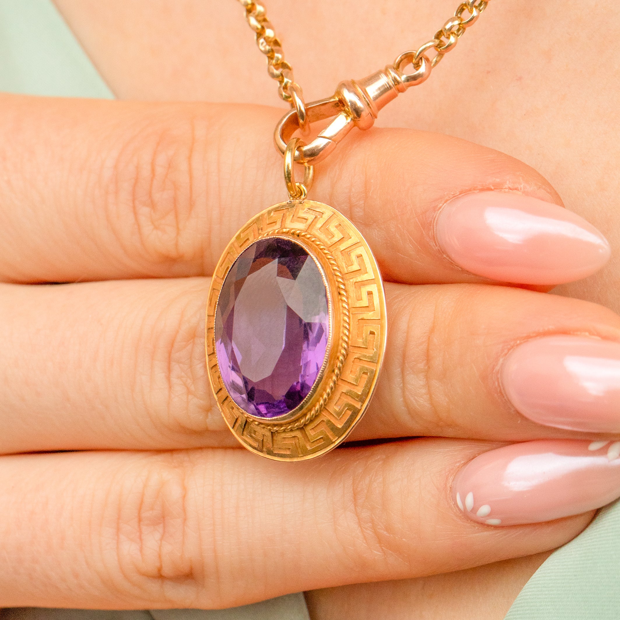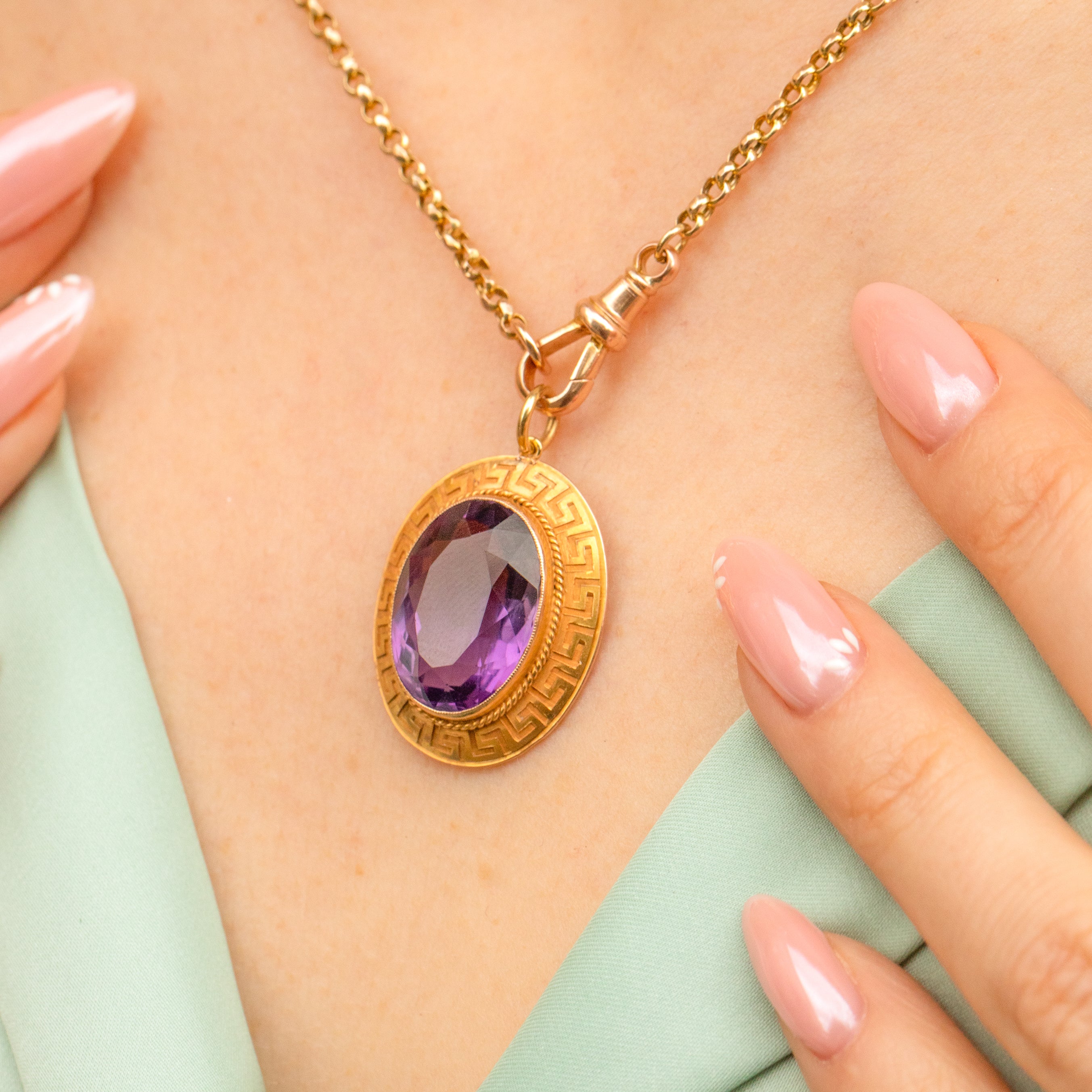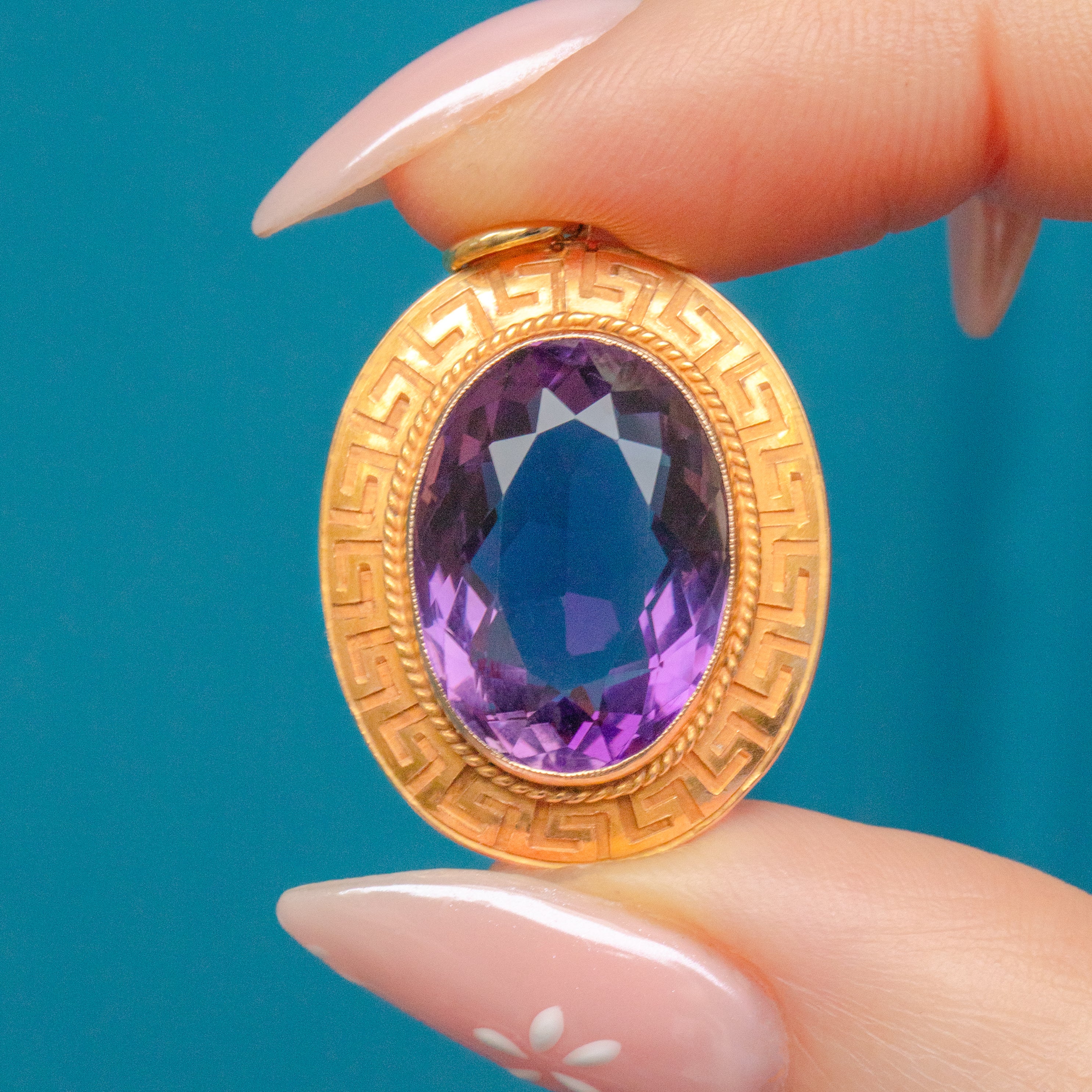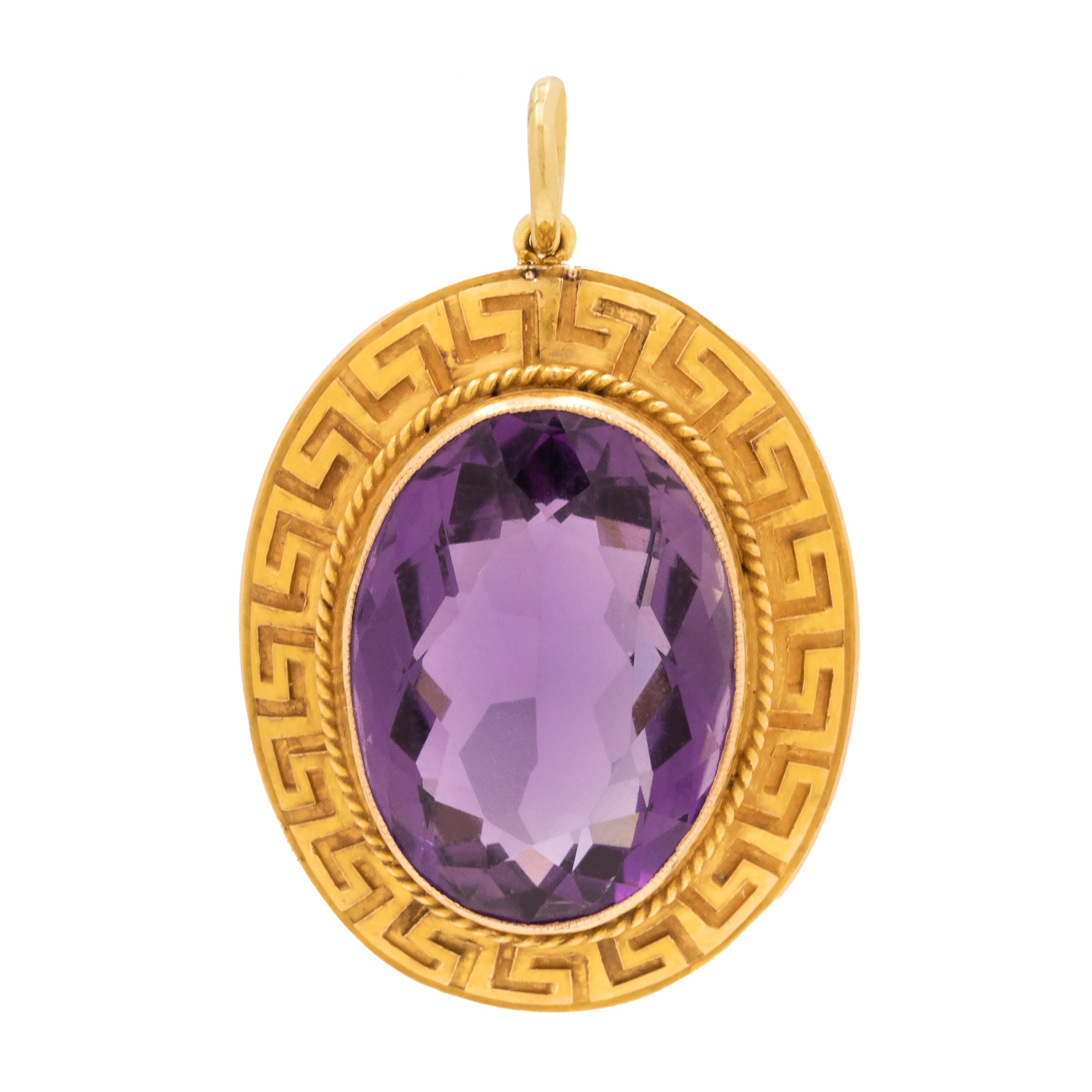 Antique Gold Amethyst Oval Pendant, 8.50ct, Greek Key Design