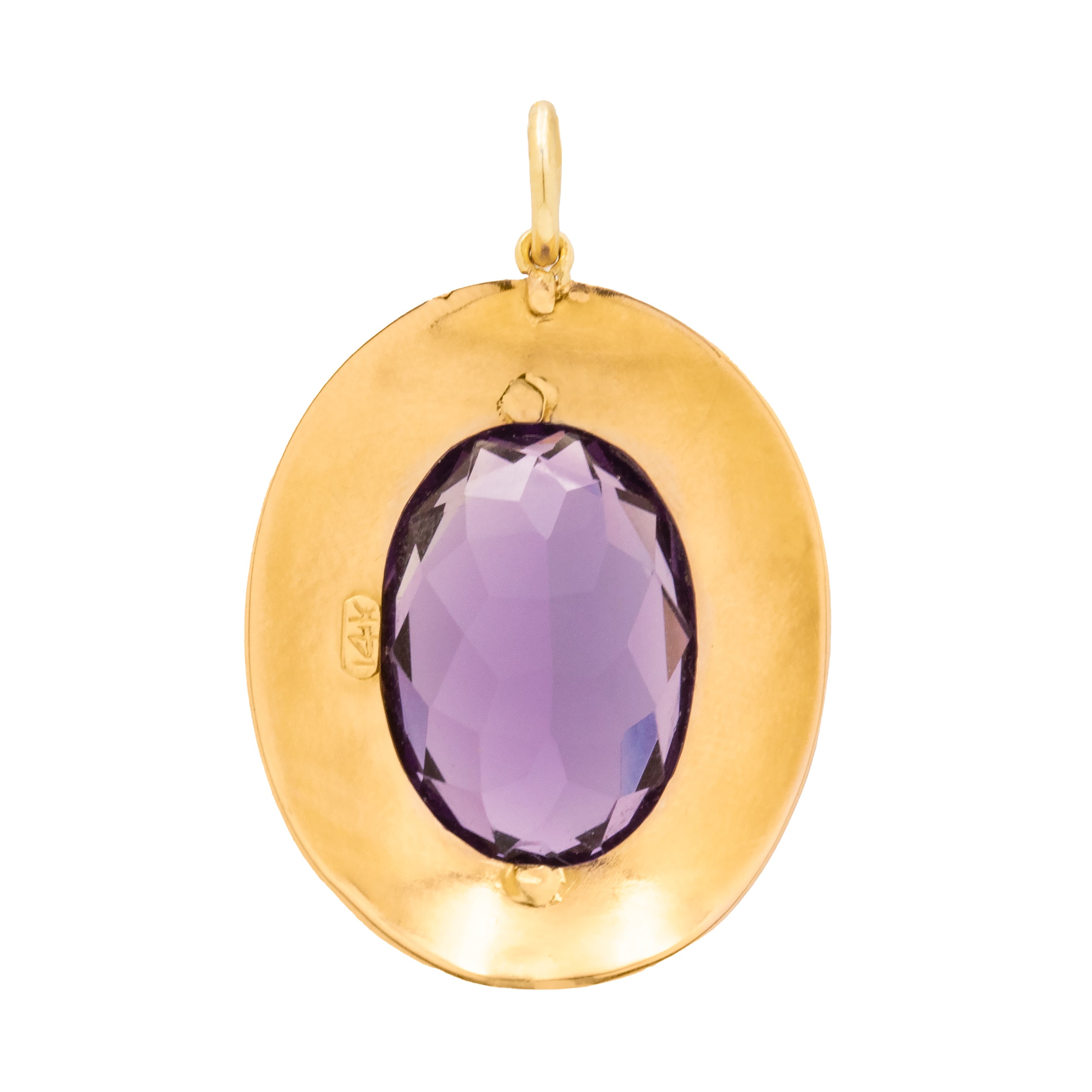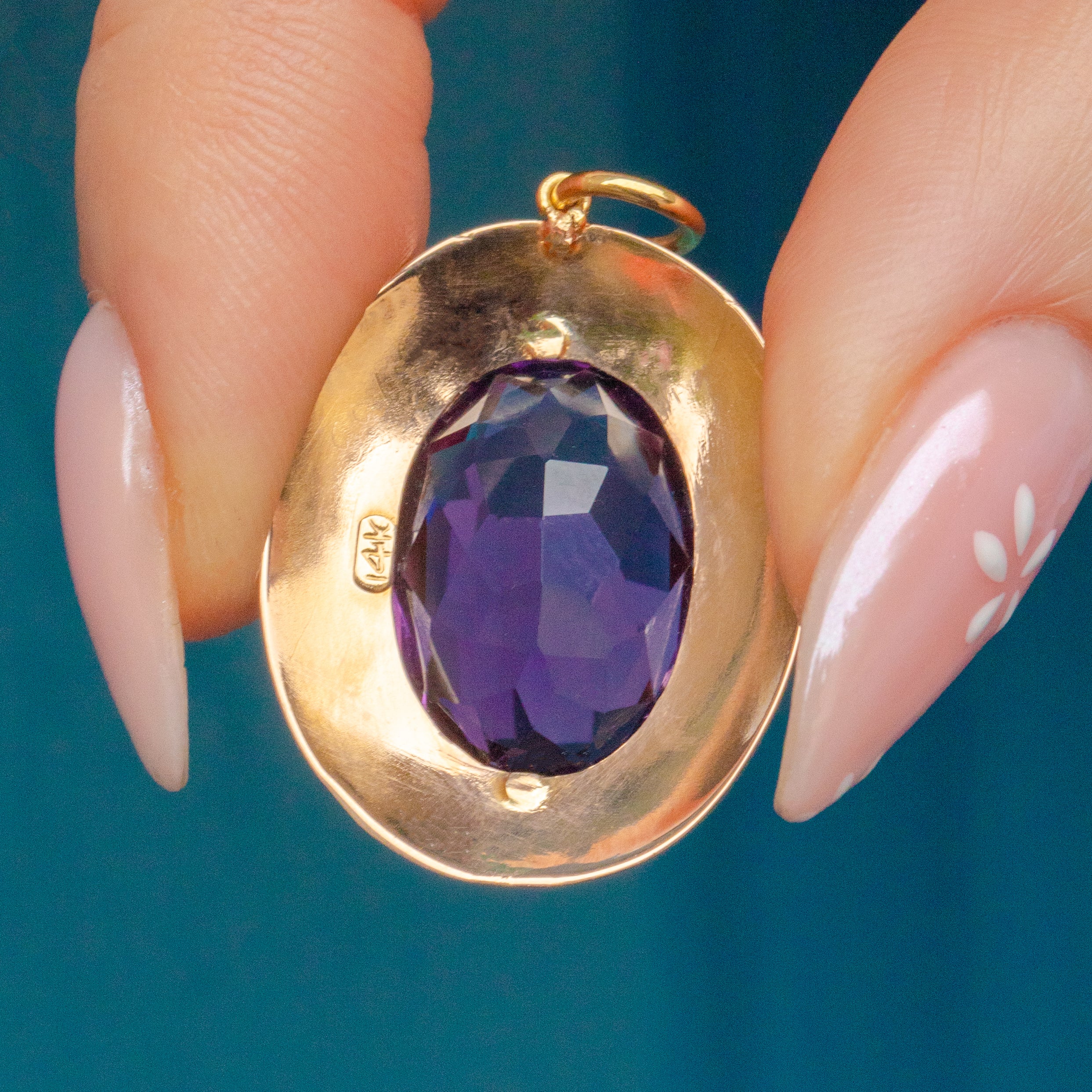 This antique Gold Amethyst oval pendant is divine! Lose yourself in the rich royal purple hues of the oval-cut Amethyst, perfectly cut and faceted to perfection, allowing the light to dance across beautifully.