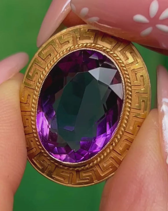 VERY GOOD. This antique Gold Amethyst oval pendant is in very good condition! The central Amethyst is securely set in its bezel, with facets aplenty and a gorgeous hue. The Greek key design is gorgeous and the Gold has a lovely warm hue. The back of the pendant has a sign of conversion from where it was a brooch, but the back is smooth and wears comfortably!