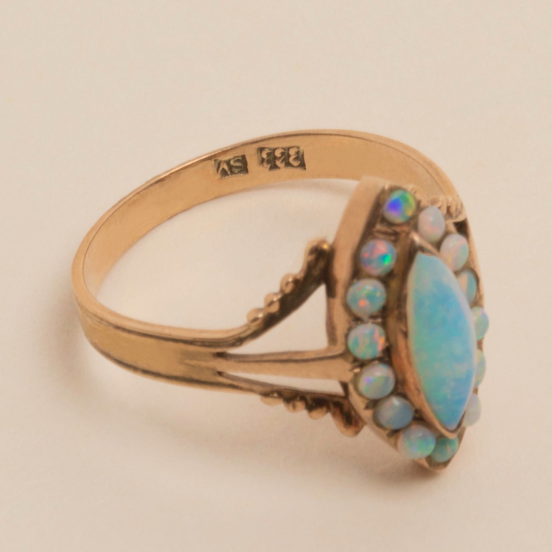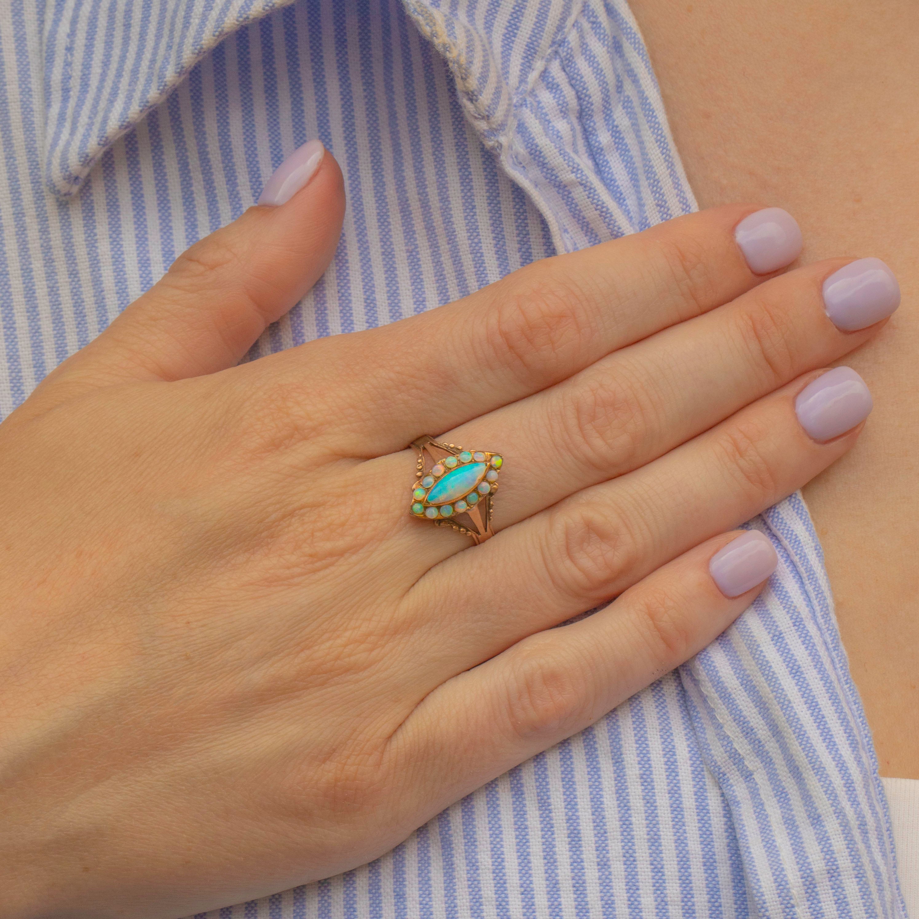 VERY GOOD. This antique Gold Opal marquise cluster ring is in very good condition! Each Opal is secure, smooth to the touch, with rich glacial hues running throughout. The Gold has a rich saturation throughout with only minimal signs of a resize on the back of the band that cannot be seen when worn. The tapered shoulders are symmetrical and perfectly shape the marquise centre piece!