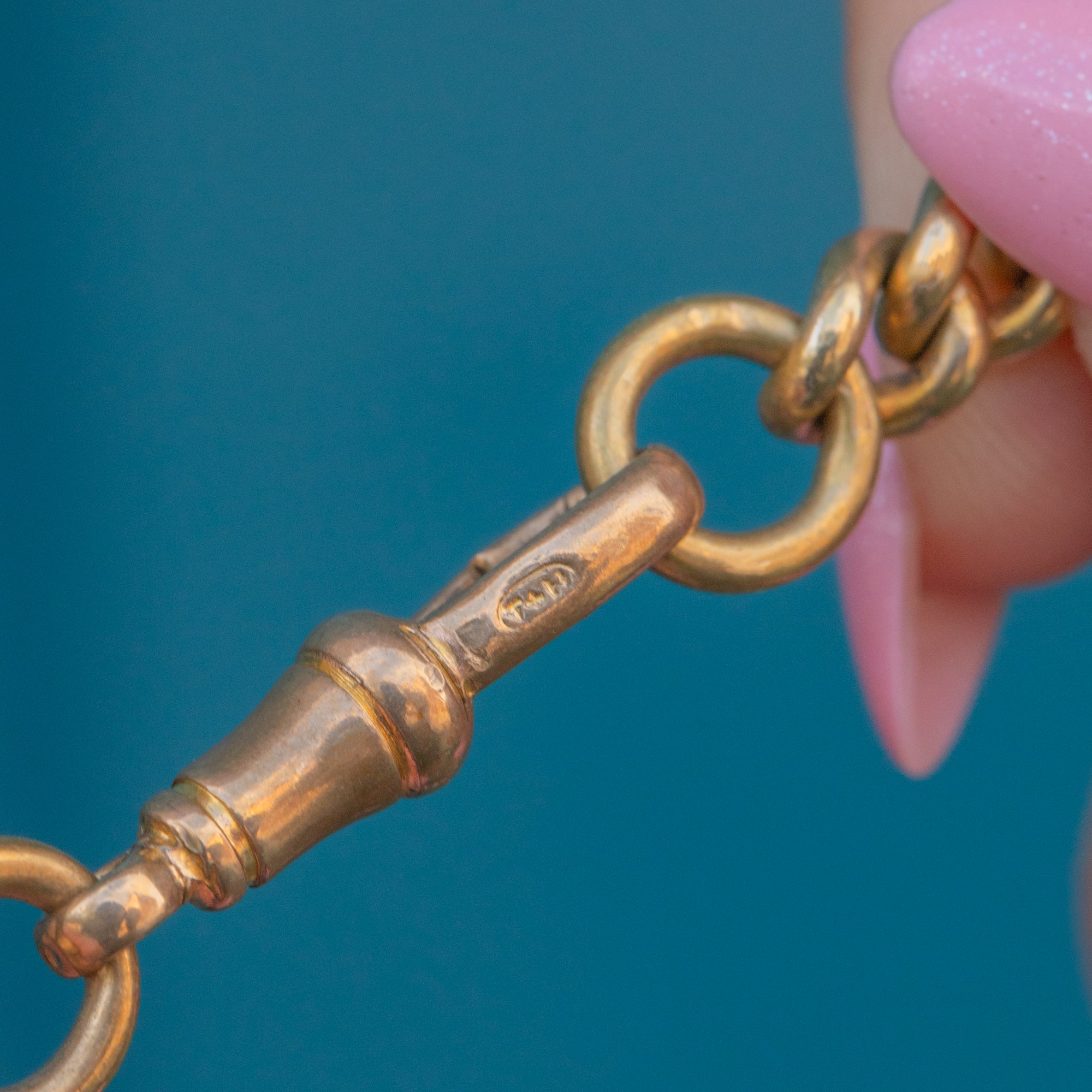 VERY GOOD. This antique Gold toned curb link bracelet is in very good condition! The links are secure, the dog-clip is in perfect working order and you can wear the bracelet confidently. The Gold tone has lasted very well, only the dog-clip has some surface wear commensurate with age.