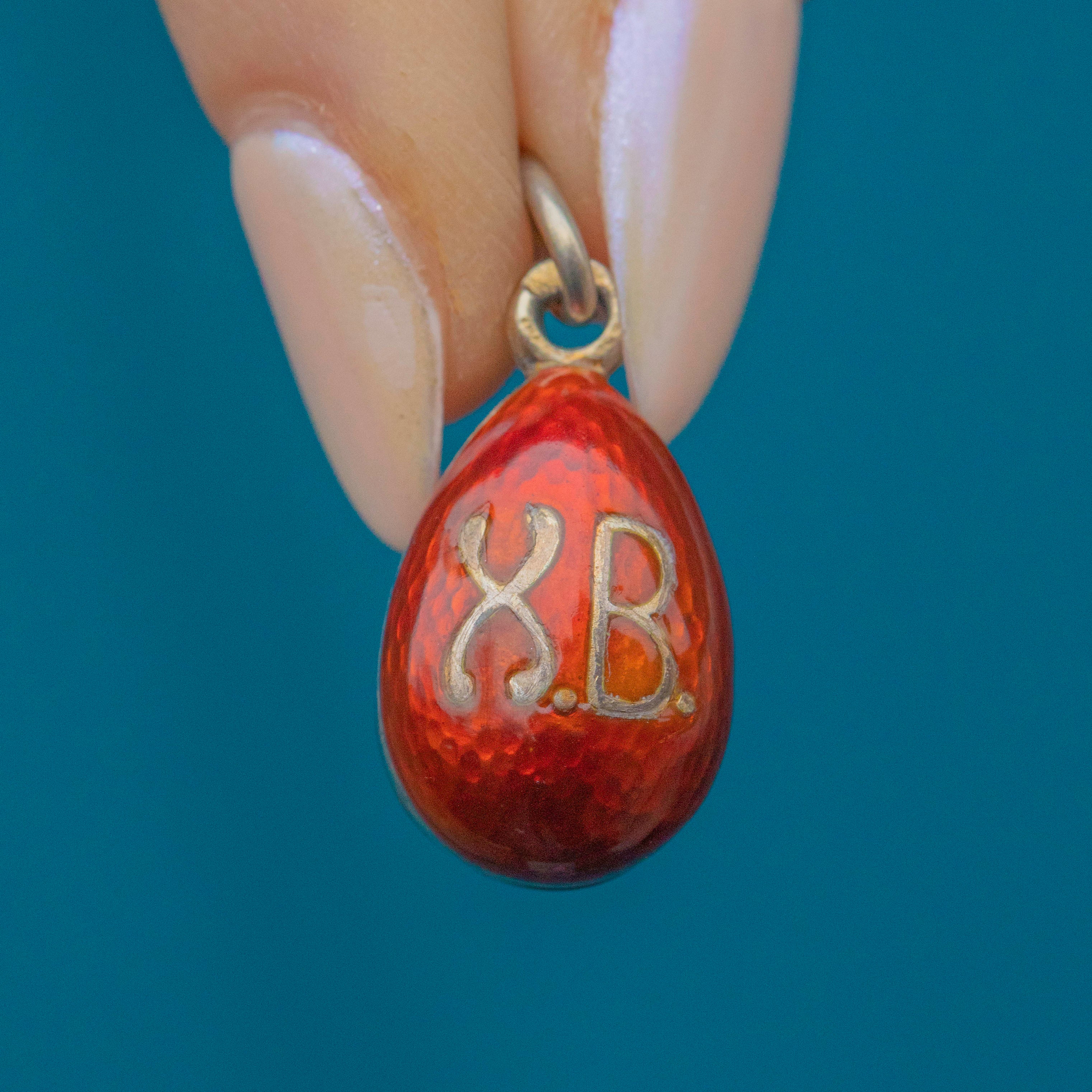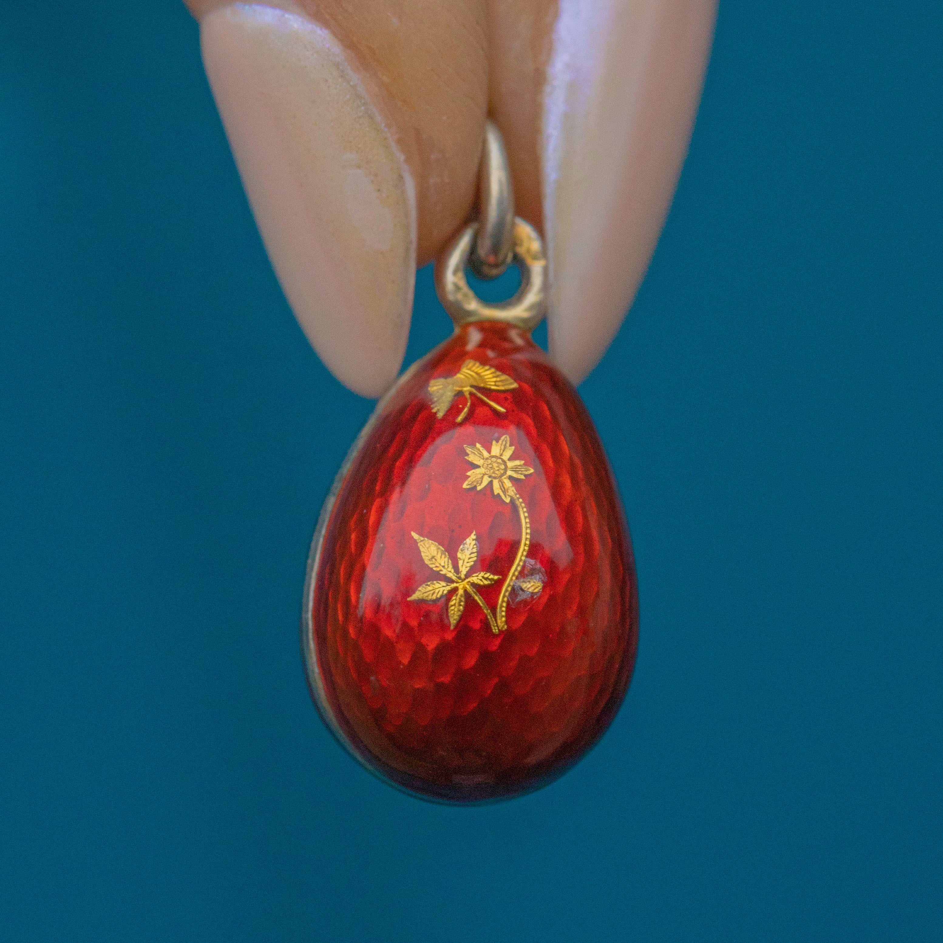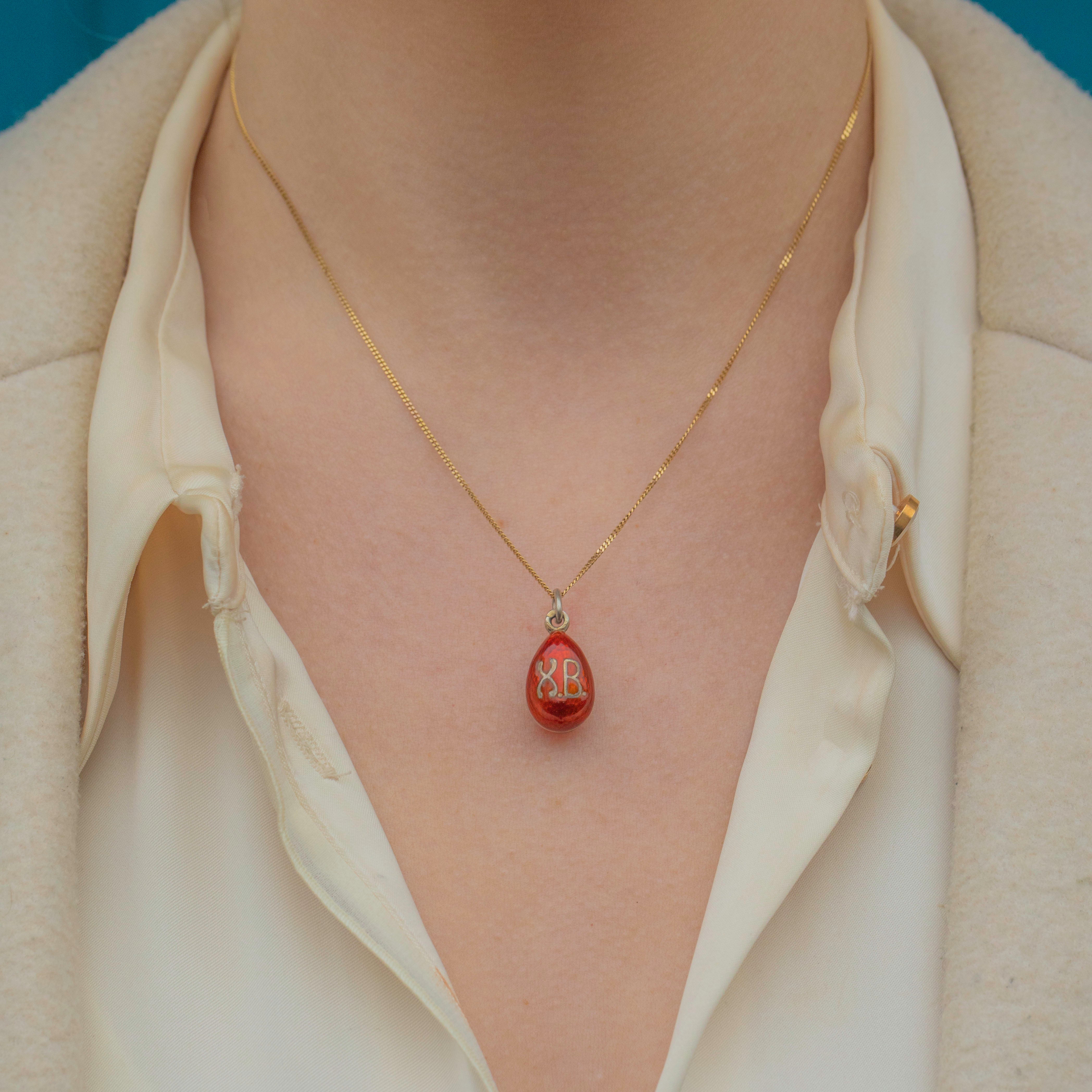 EXCELLENT. This antique red Enamel egg pendant is in beautiful condition overall! The Enamel is absolutely stunning and free from wear. This antique Enamel charm has kept gorgeously and promises many more years of wear and enjoyment!