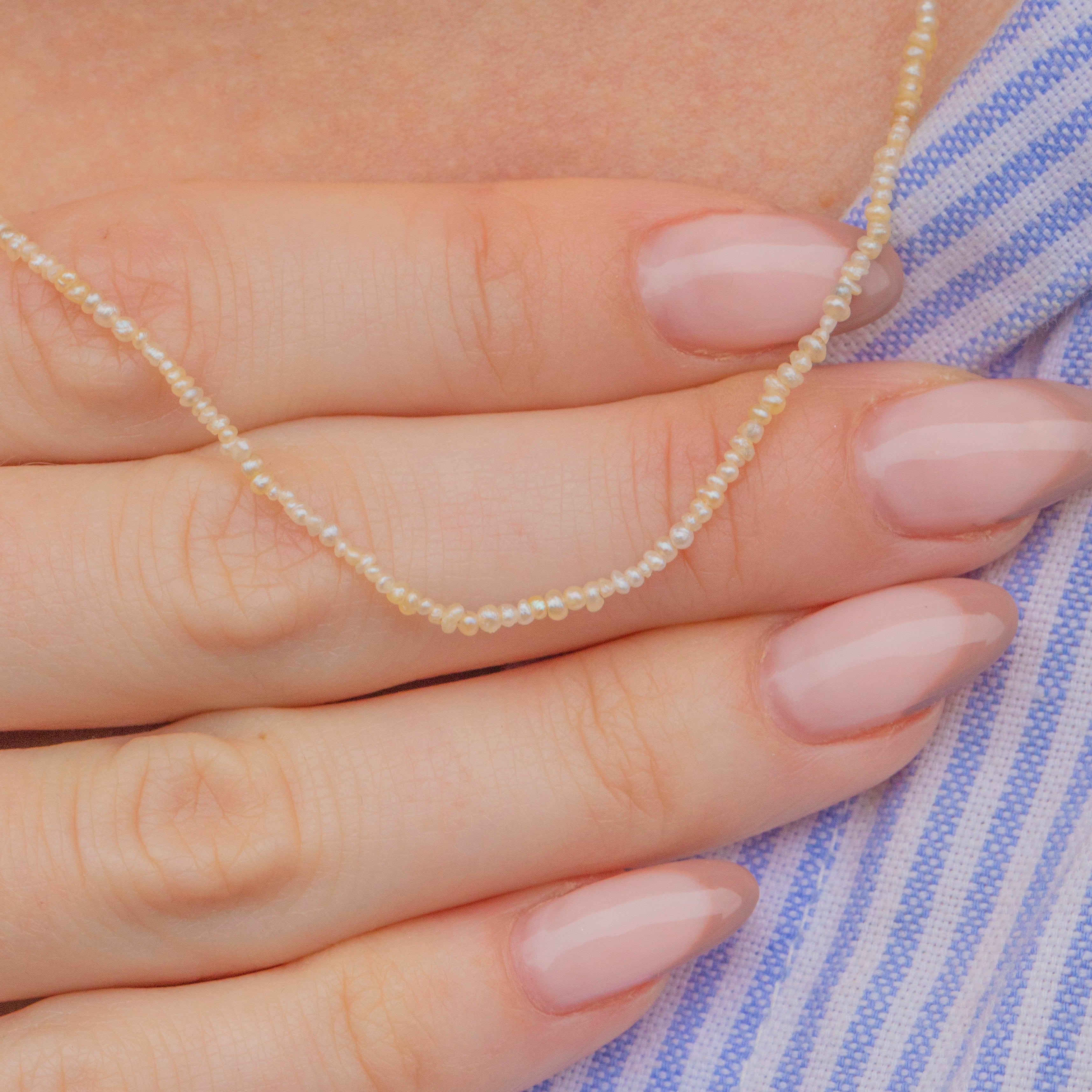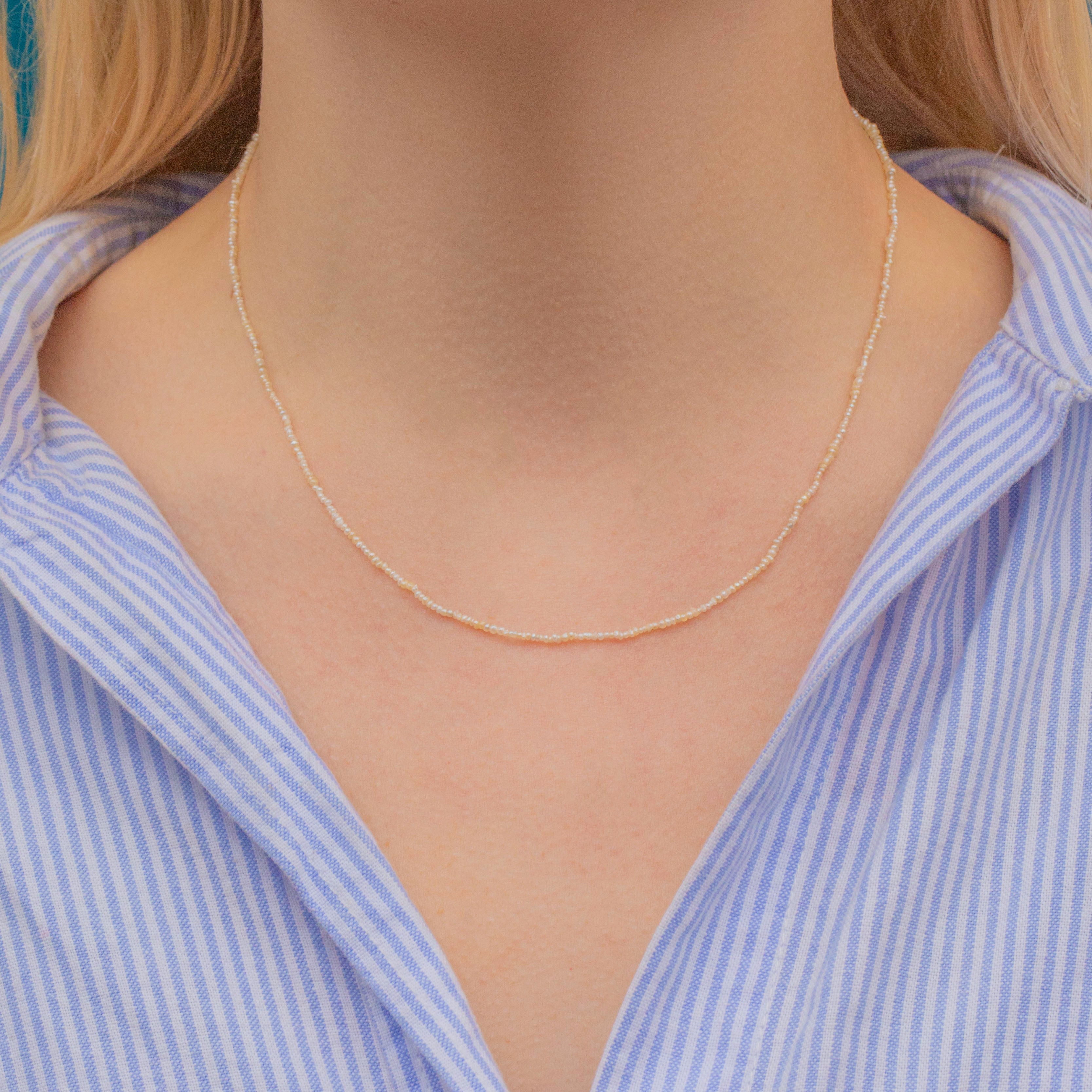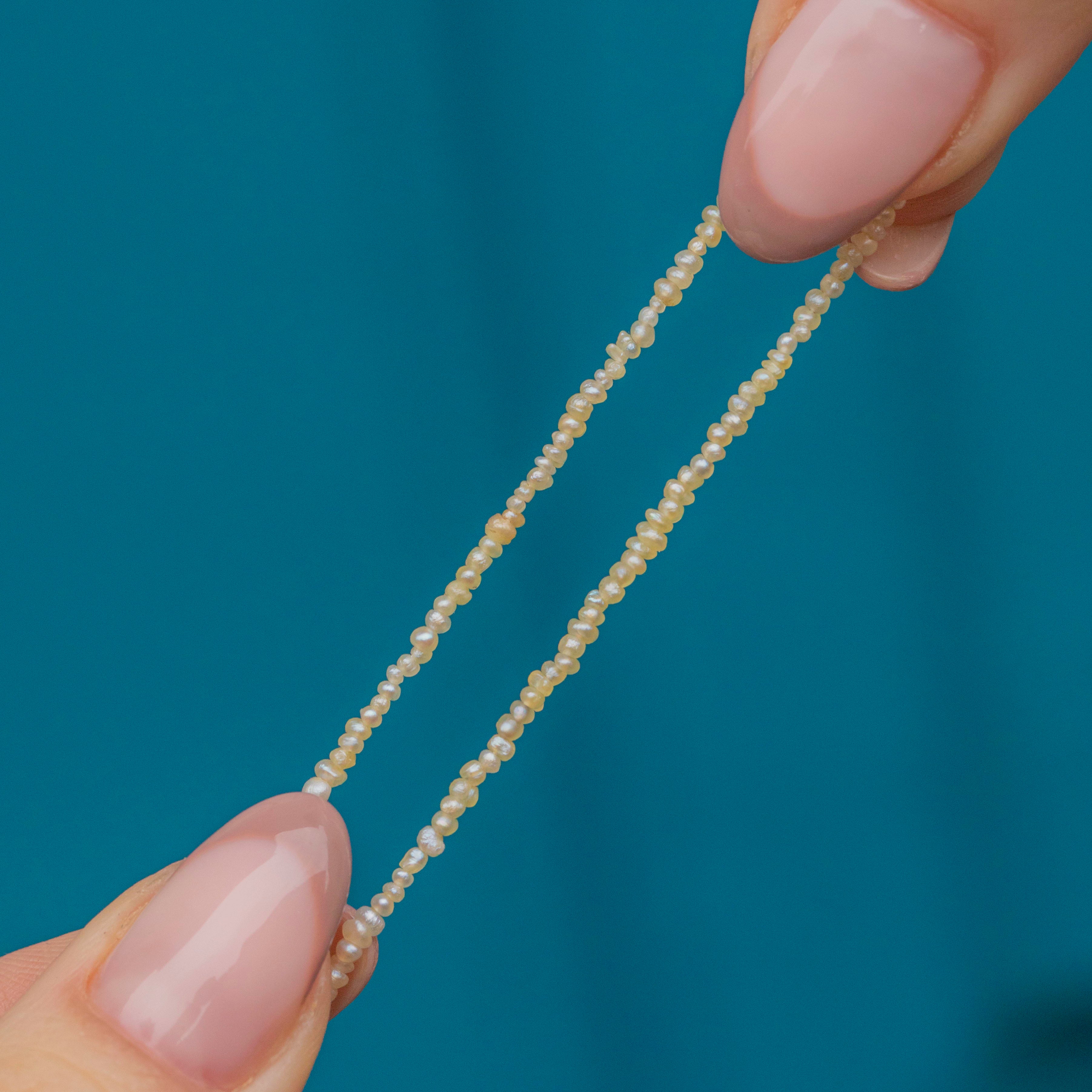VERY GOOD. This antique Seed Pearl strand necklace is in very good condition overall. This piece is delicate in nature, and like most antique pieces, should be worn with care. The Seed Pearls have all been delicately strung, and the necklace closes with a 9ct barrel clasp, which shuts securely. The Seed Pearls have a gorgeous shine and only near the metal wire ends is there some slight discolouration!