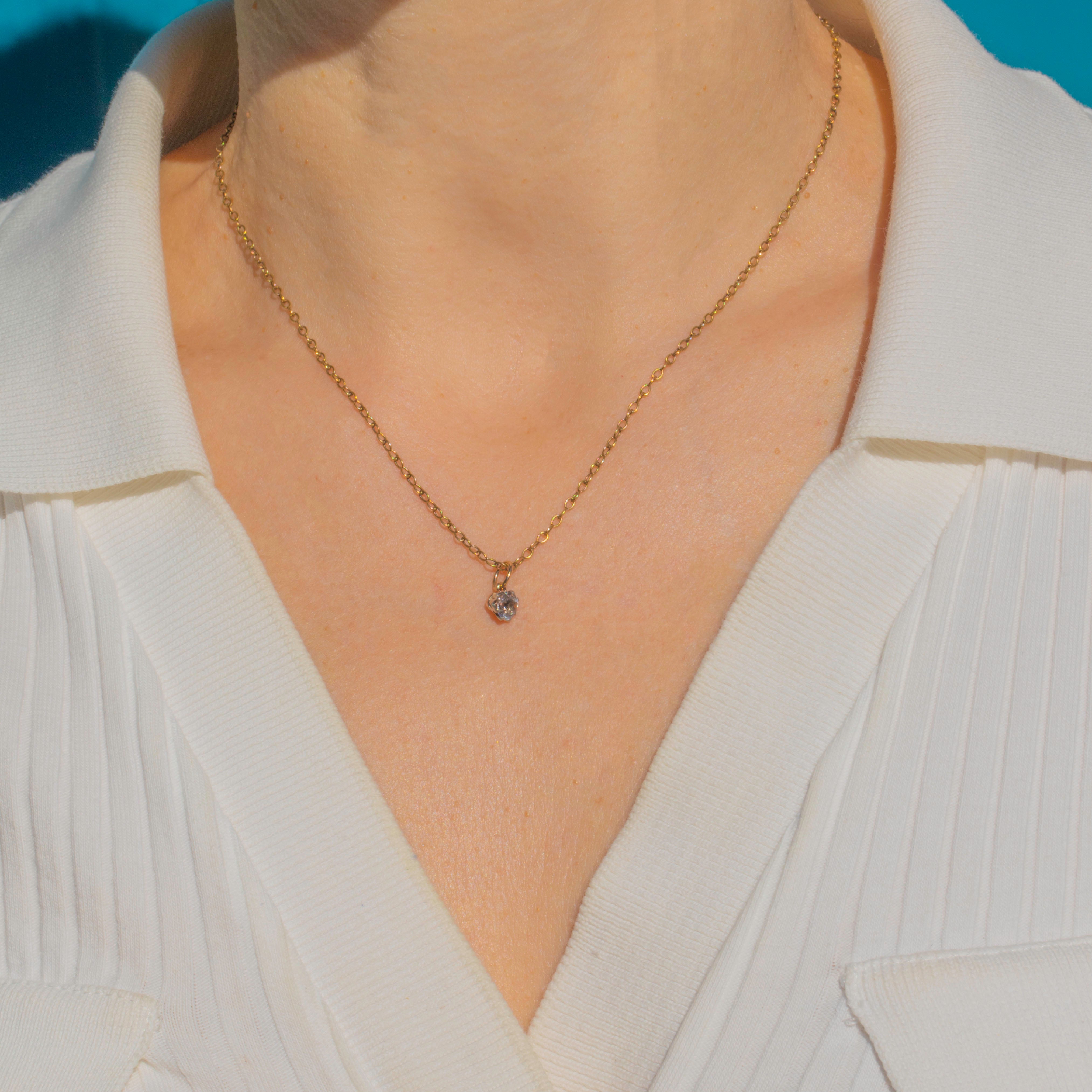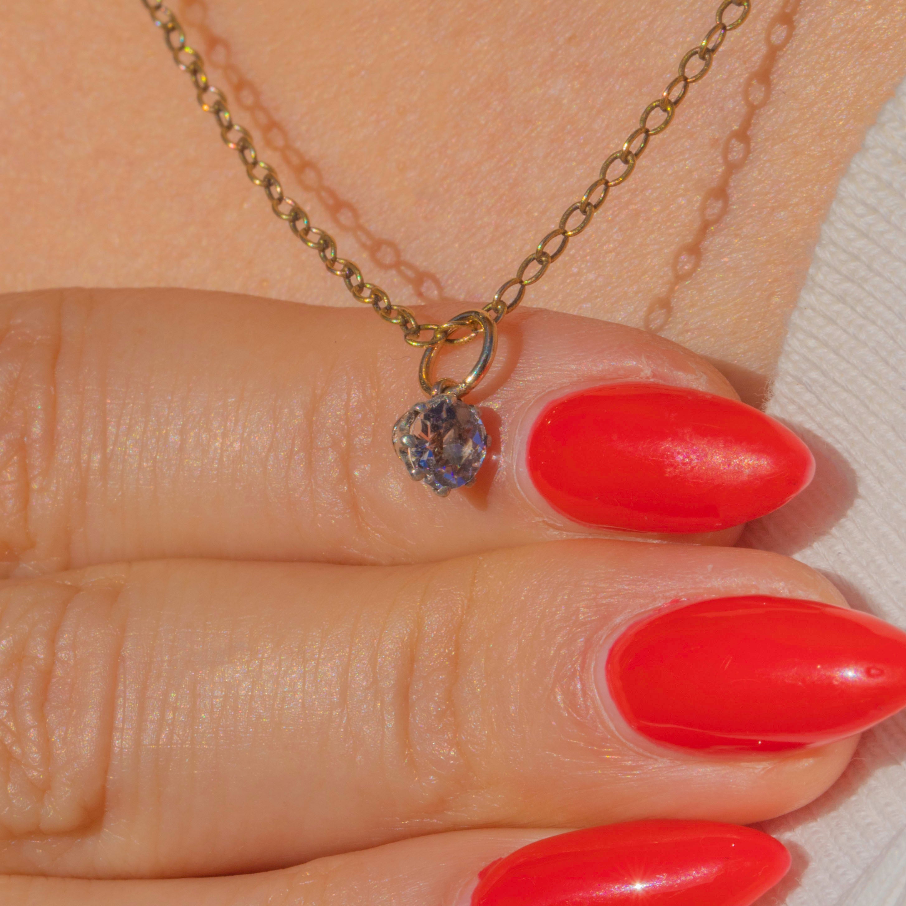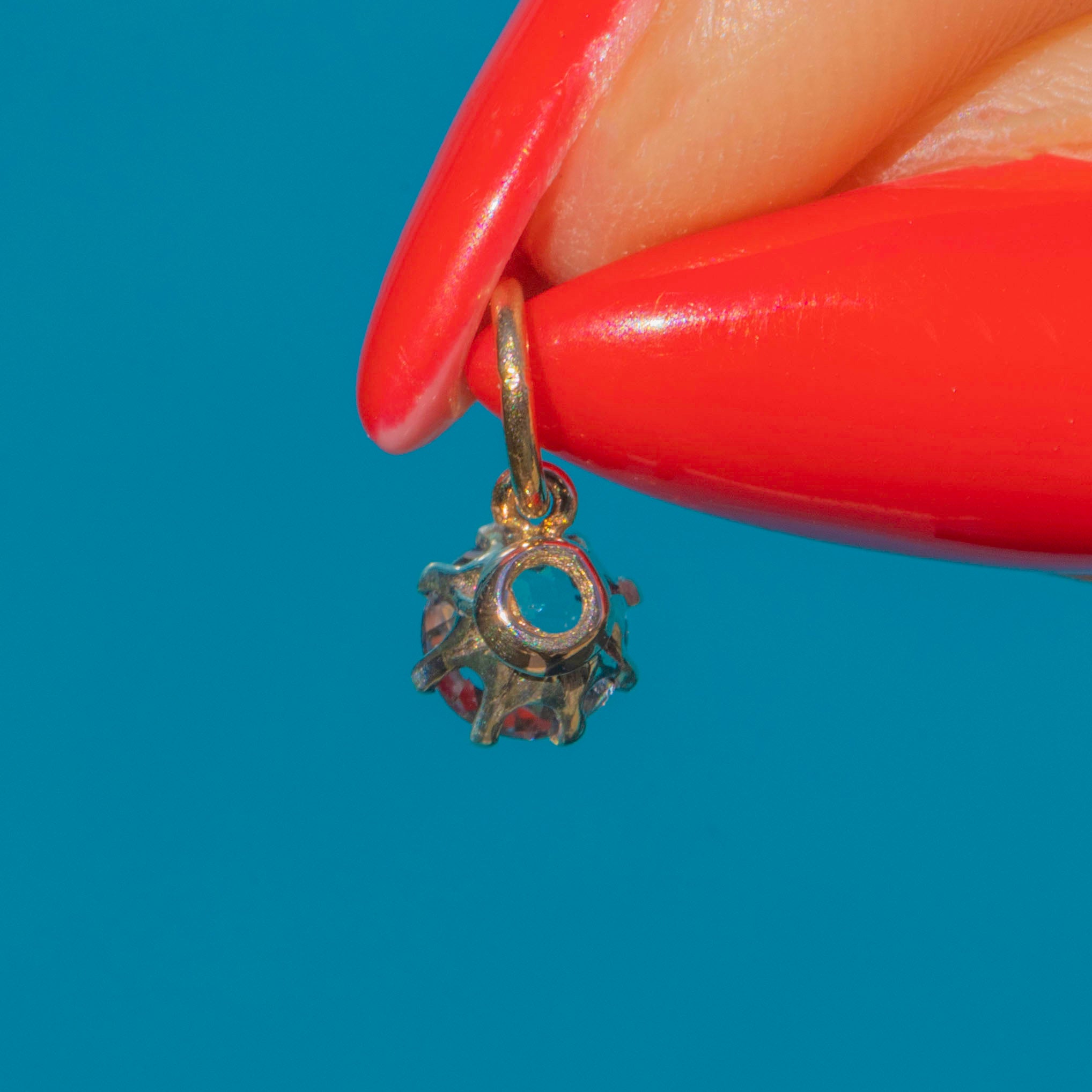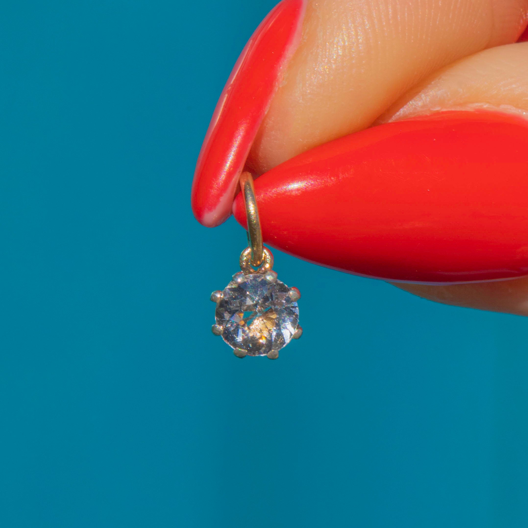 This dainty Victorian charm is set with a sparkling 5mm Paste stone in a Silver mount, finished with a 9ct Gold jump ring for easy wear. Paste was a highly popular choice in the 19th century, admired for its brilliance and ability to mimic the look of Diamonds.