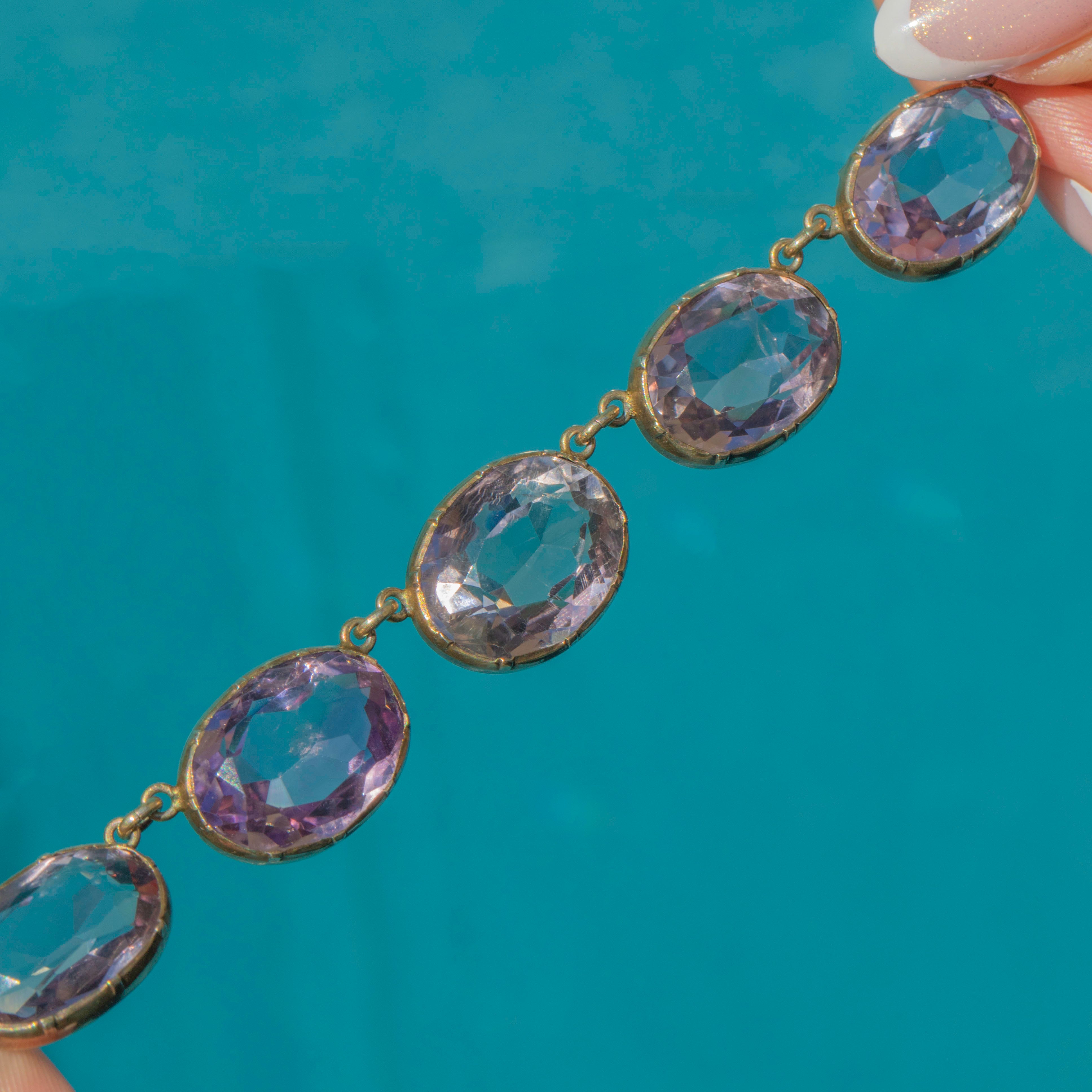 VERY GOOD TO EXCELLENT. This antique Silver Amethyst rivière necklace is in wonderful condition. The Amethysts all have their own pretty lilac hue, and they are all securely set. The necklace likely once had a bright 9ct Gold gilded finish, but this has slowly faded over the years to something more subtle. The necklace closes with a bolt ring so you can wear it securely.