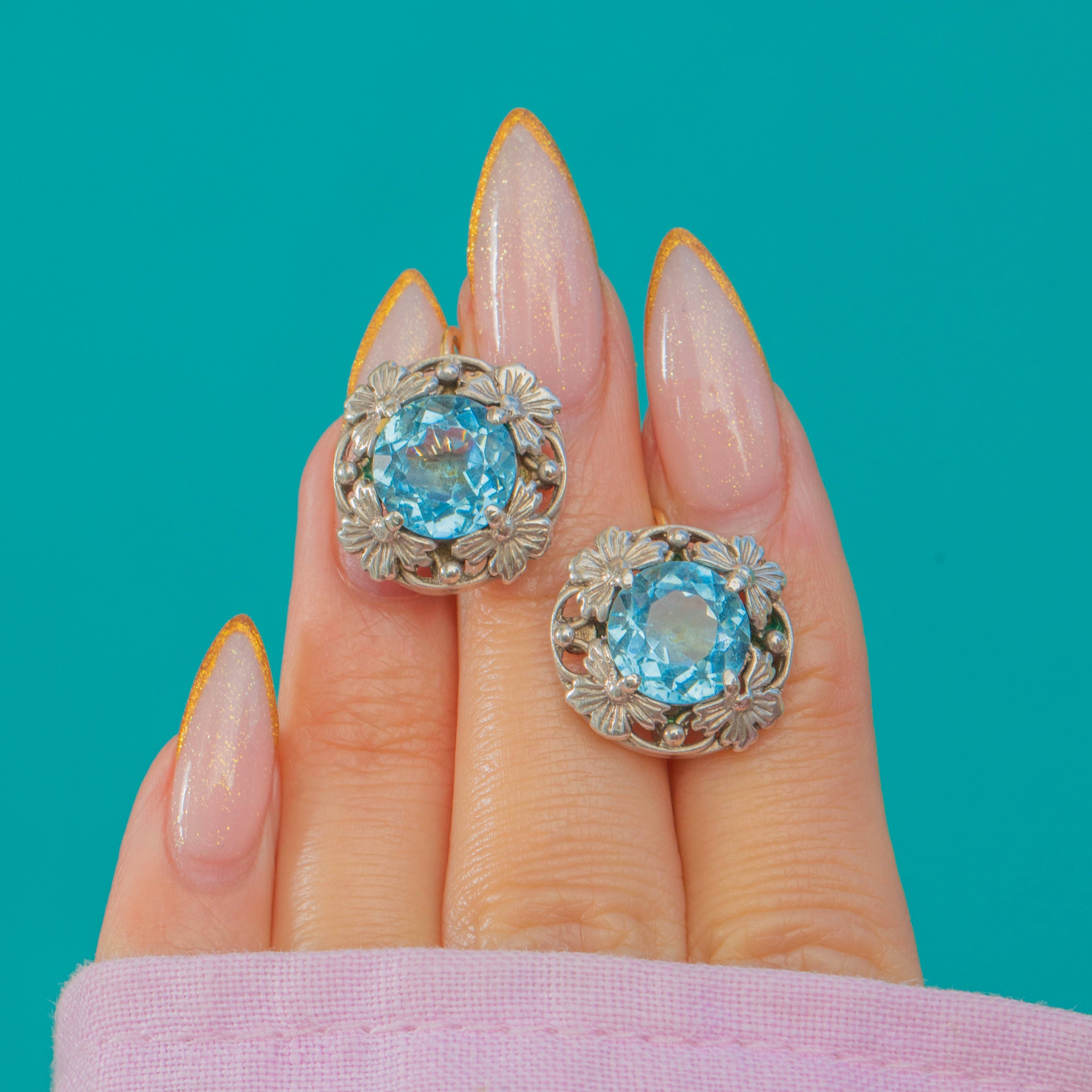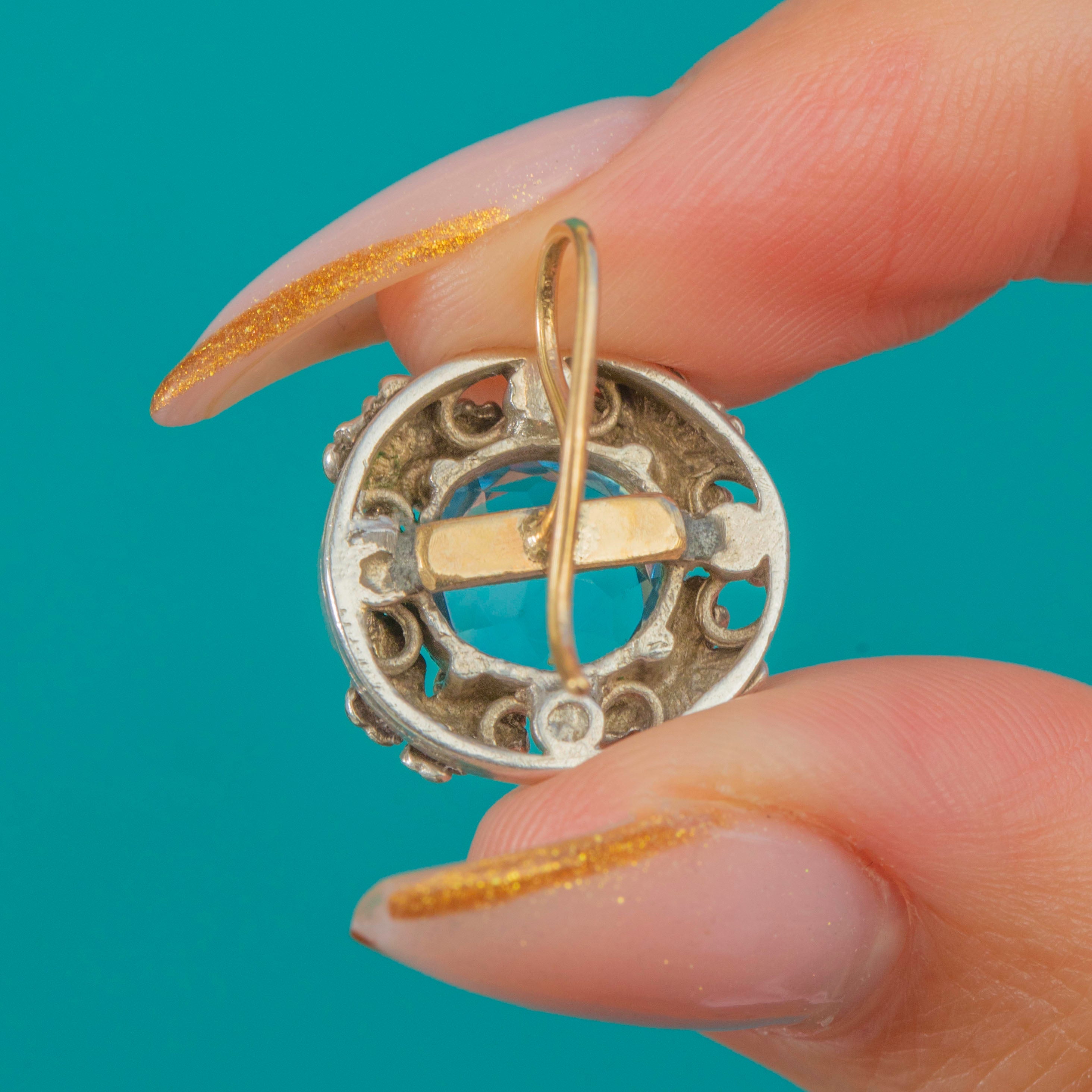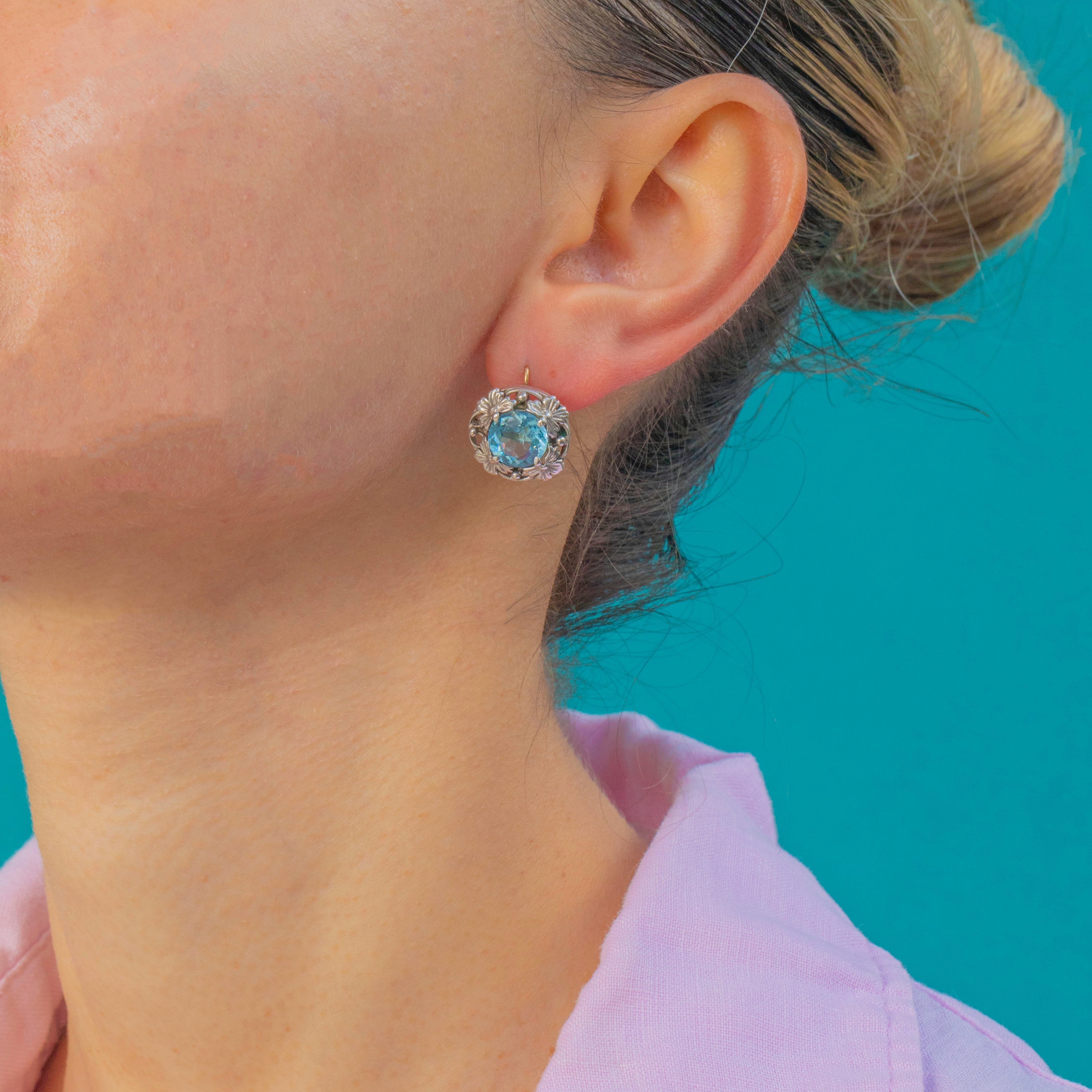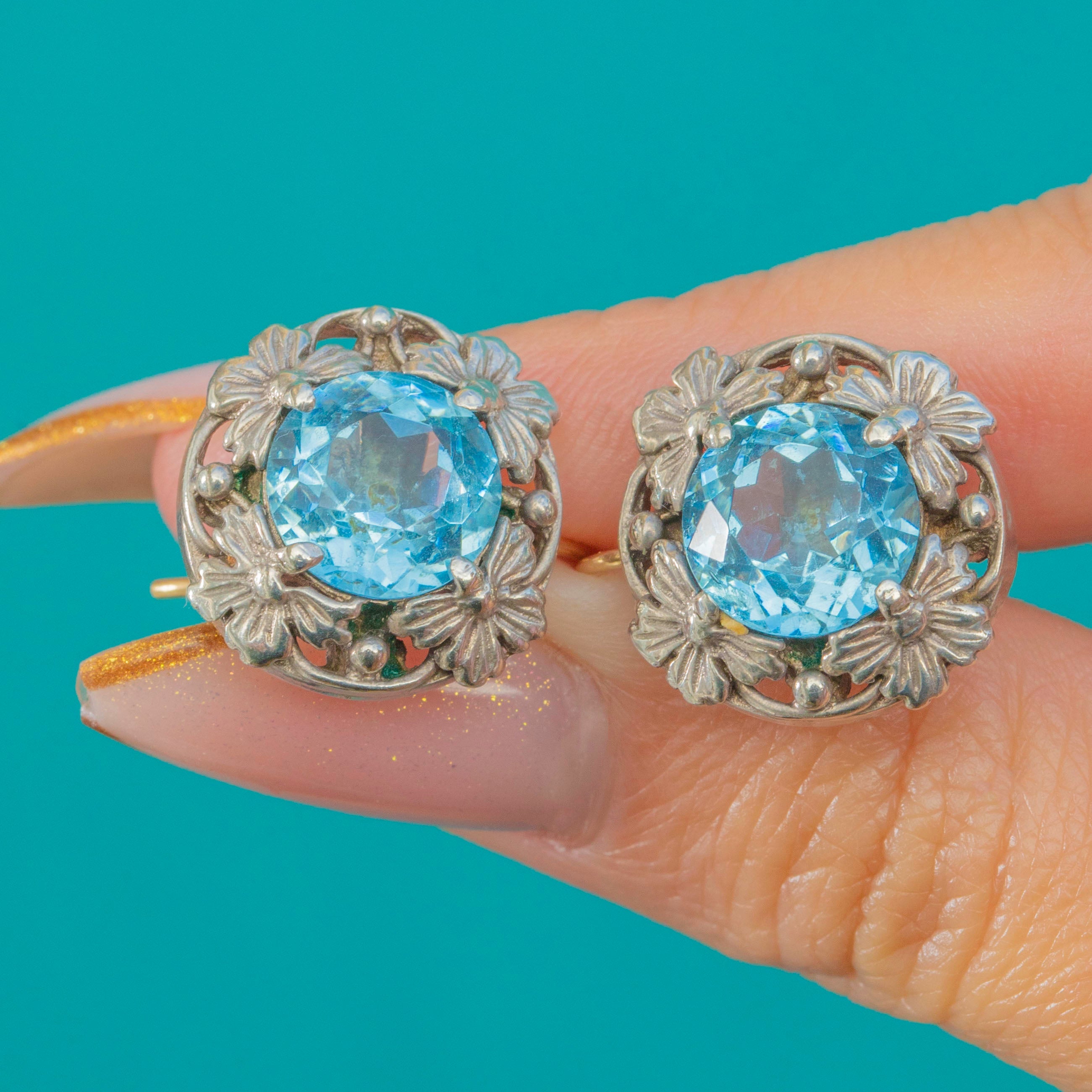 These Edwardian Silver earrings feature sparkling Blue Paste stones framed by a beautifully detailed openwork floral surround. The vivid blue stones capture the light beautifully, giving them the appearance of bright Aquamarines and adding an elegant pop of colour.