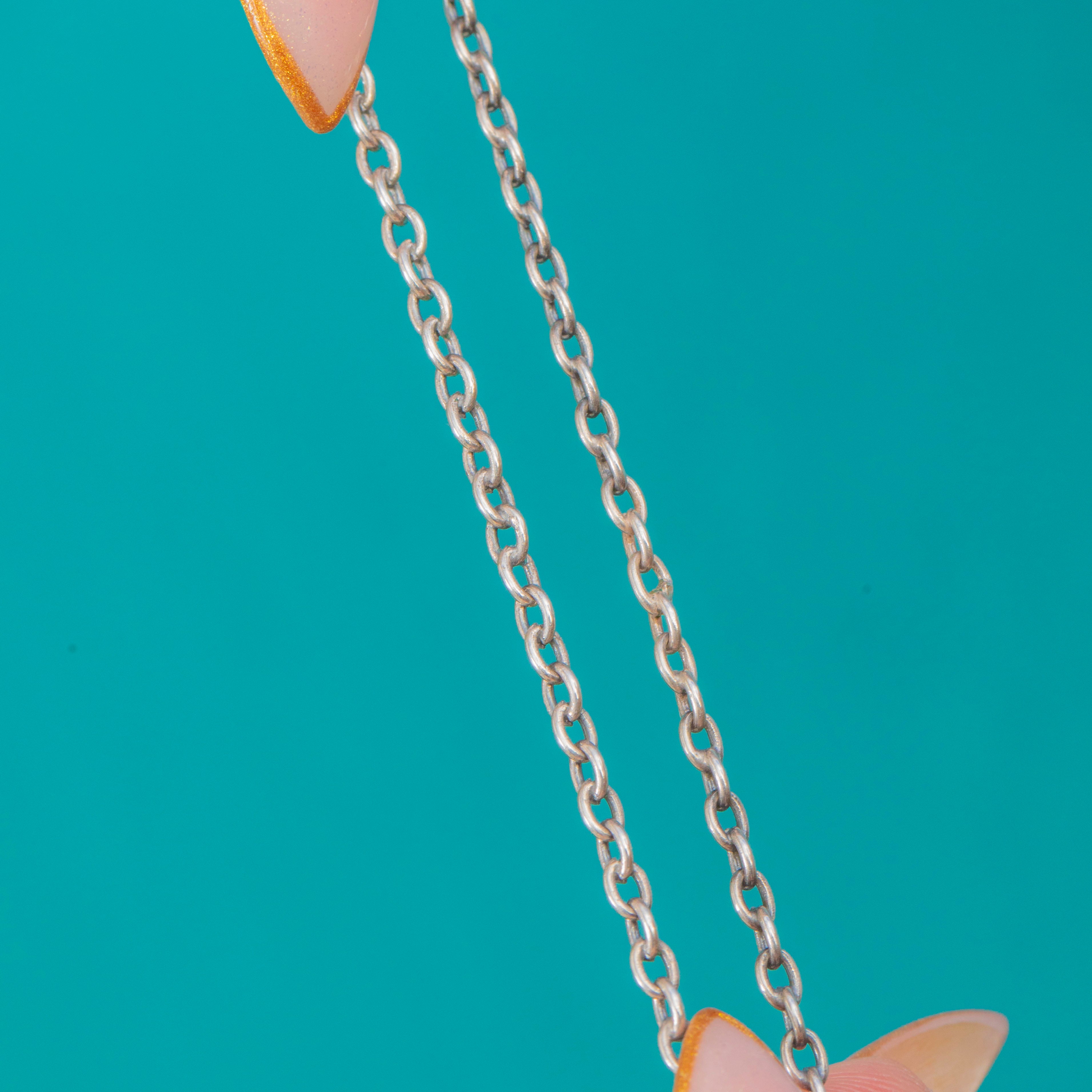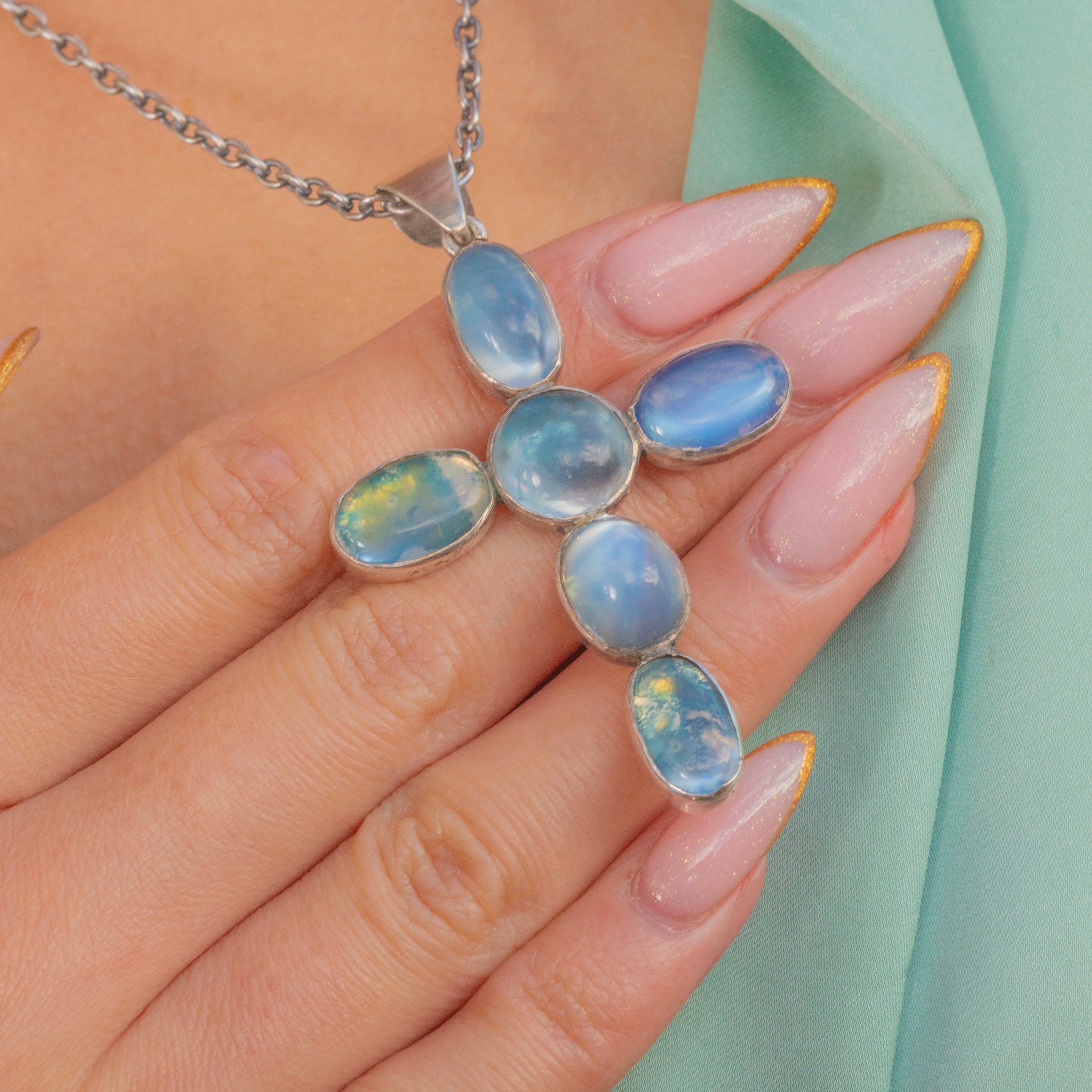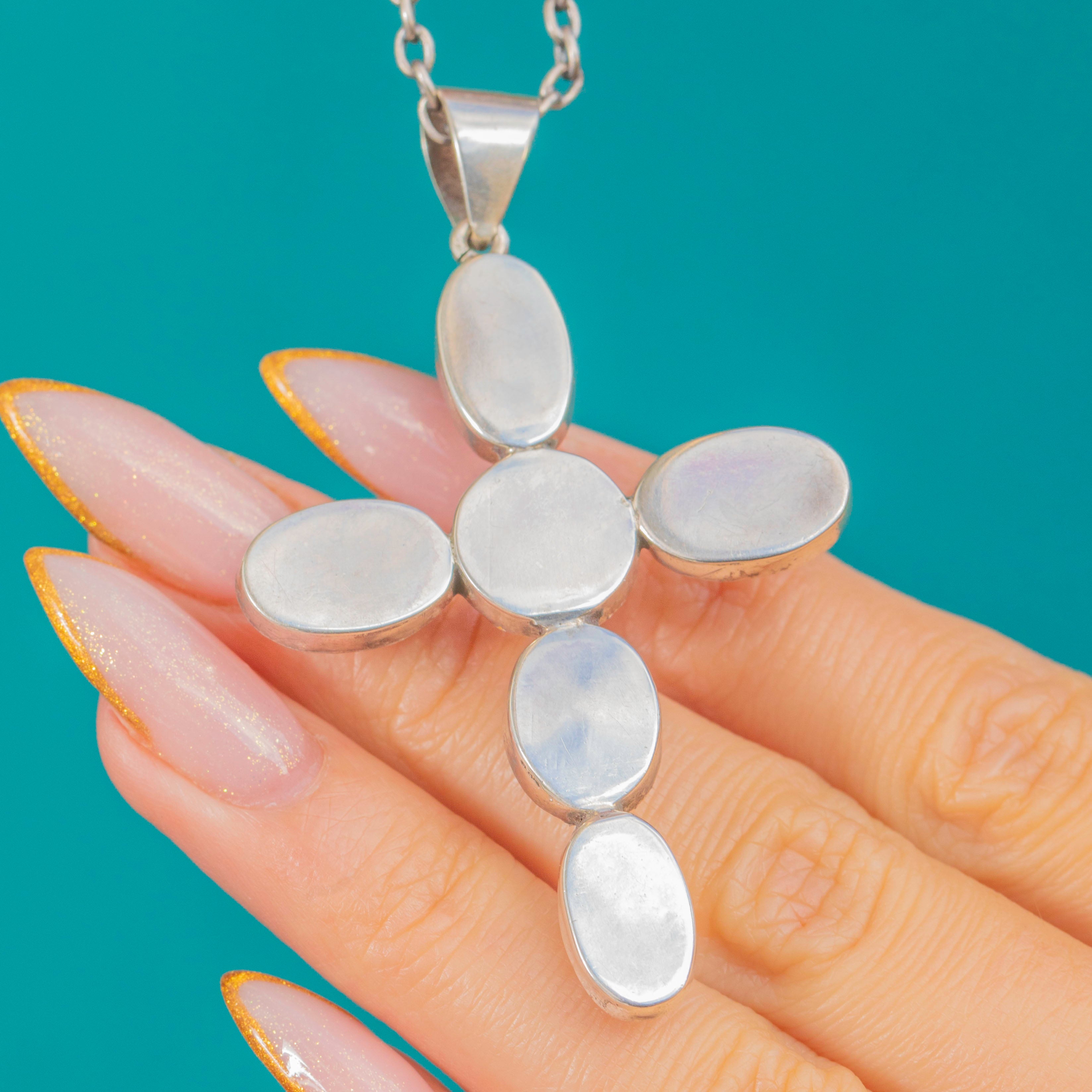 A striking Arts & Crafts Moonstone cross pendant crafted in Silver, complete with a long 30" chain for effortless, elegant wear. The cool glow of the Moonstones is beautifully showcased in this handmade design, with soft adularescence and organic charm characteristic of the Arts & Crafts movement.
