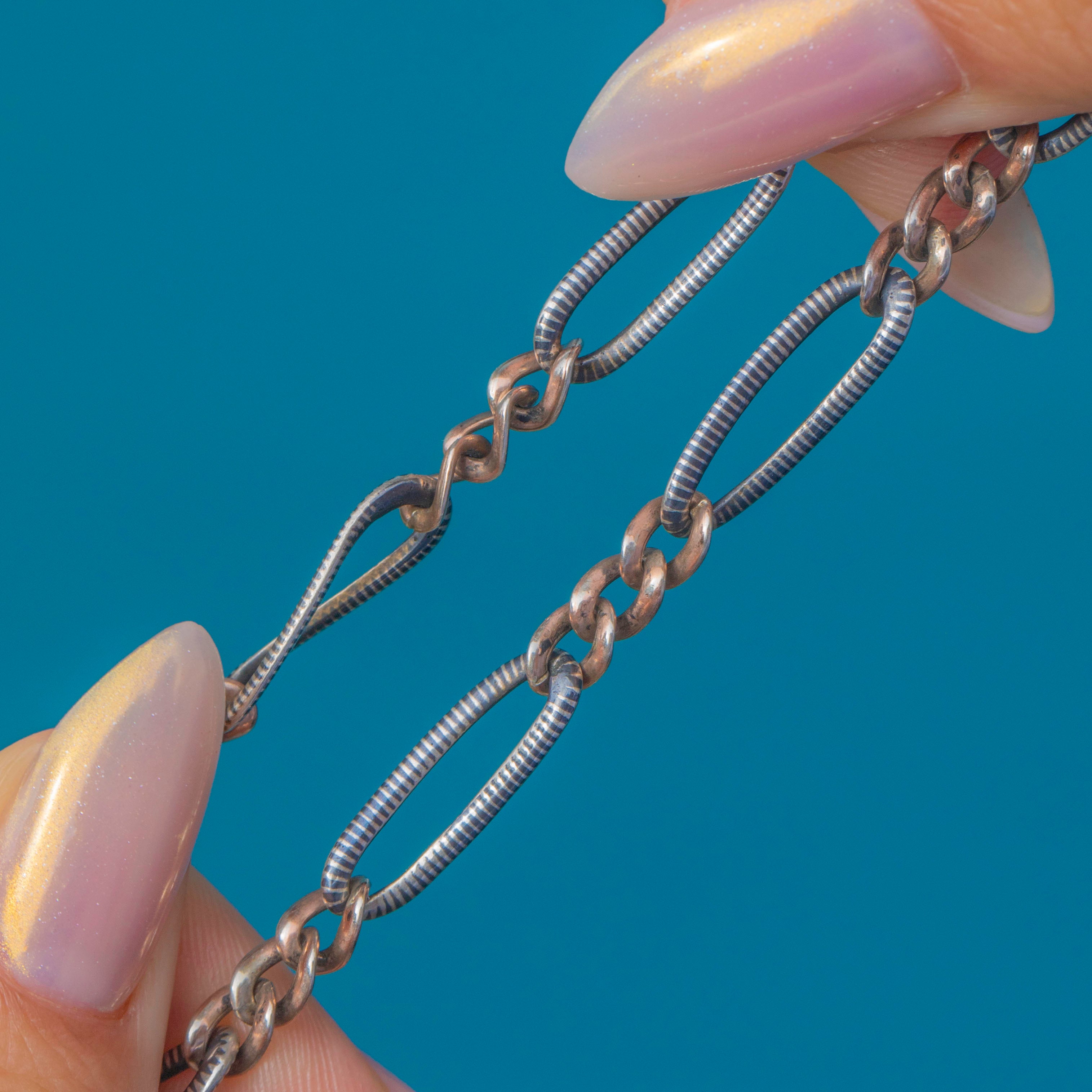 This antique chain is crafted in Sterling Silver with rich Niello detailing, accented with warm and rosy 9ct Gold-over Silver links for added warmth and contrast.