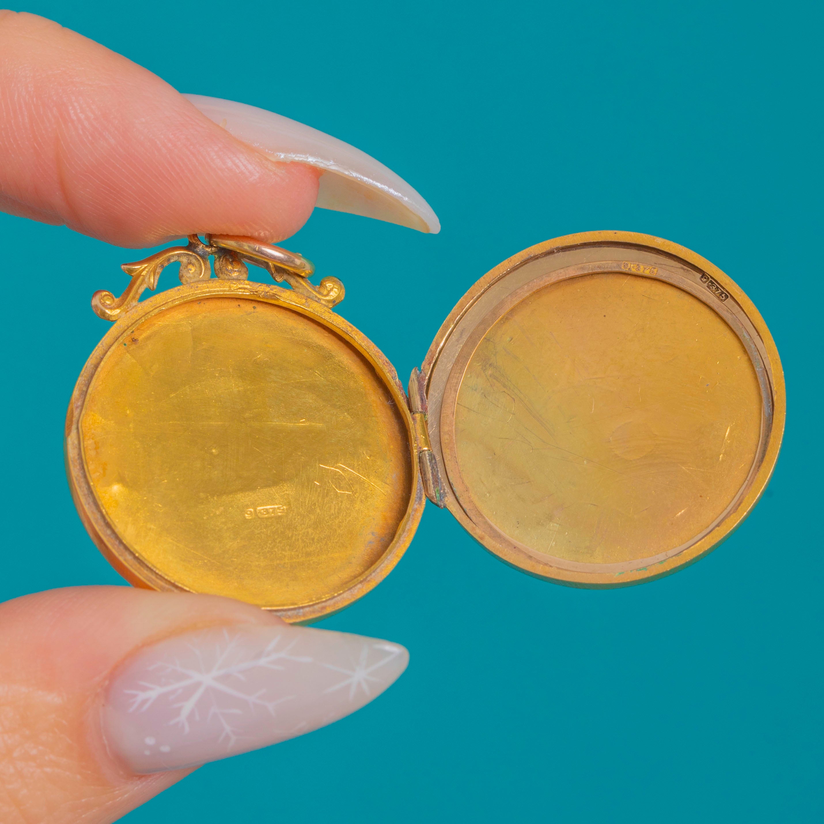 Brimming with late Victorian charm, this solid 9ct Gold round locket is richly hand-engraved with romantic foliate motifs framing a polished cartouche. An ornate scrolled surmount and jump-ring bail add a graceful, decorative flourish, while the warm glow of 9ct Gold enhances every bright-cut line.