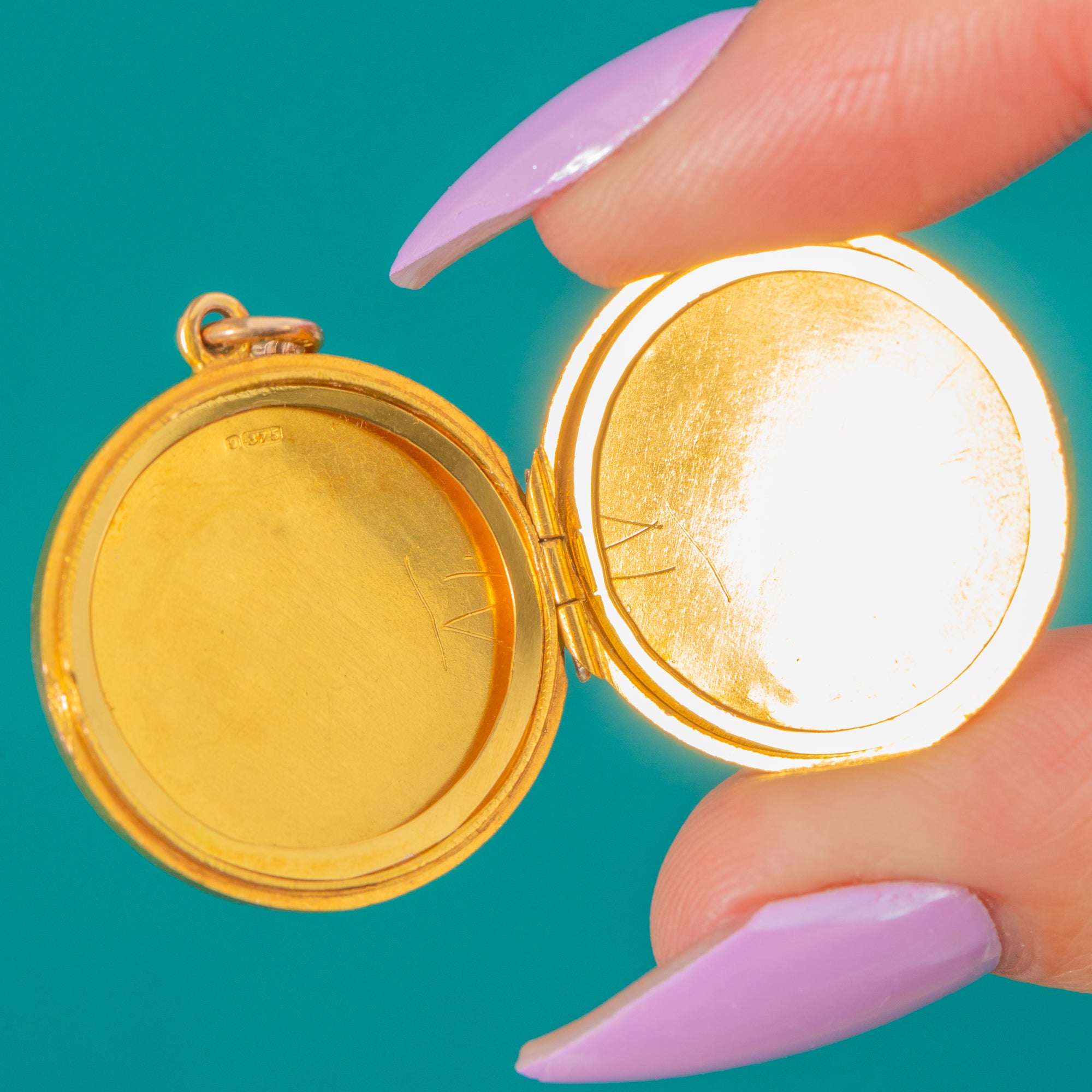 This classic round locket is richly decorated with engine-turned panels and ornate foliate engravings. A smooth central cartouche sits poised for a personal monogram, giving this piece its timeless, sentimental charm.
