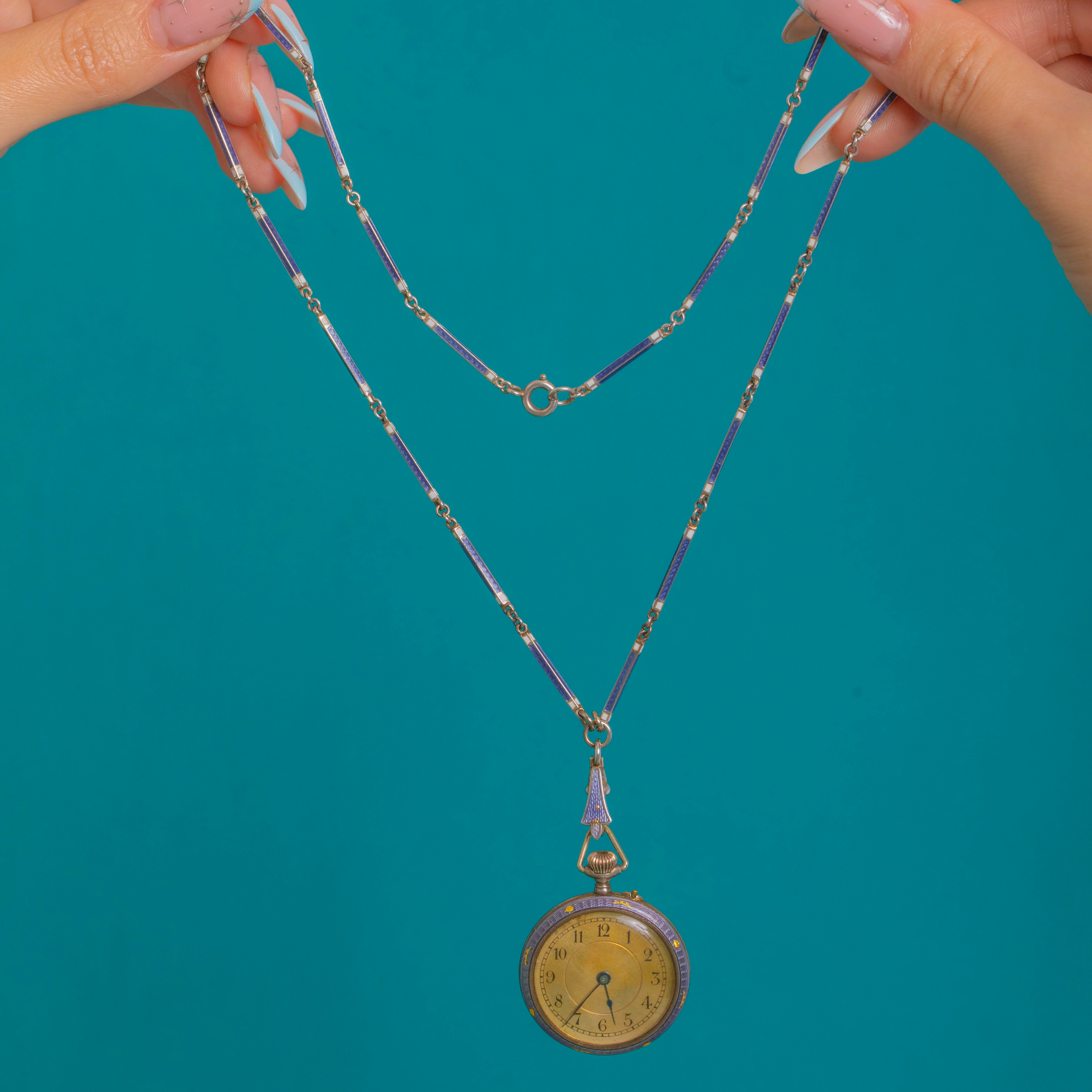A refined antique Swiss pendant watch and matching bar-link chain, bathed in translucent mauve-blue guilloché Enamel and decorated with delicate Gold garlands, tiny stars and a floral bouquet. The circular case is crowned with a fluted winder and triangular bow, while the dial presents black Arabic numerals framed by a coordinating blue Enamel bezel for a beautifully cohesive look. An Enamelled arrow-link connector and the elegant blue guilloché bar-link chain complete the ensemble with effortless Victorian poise.