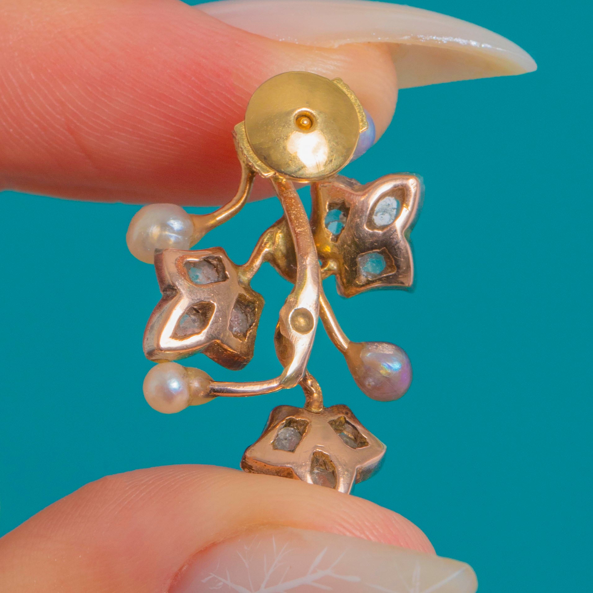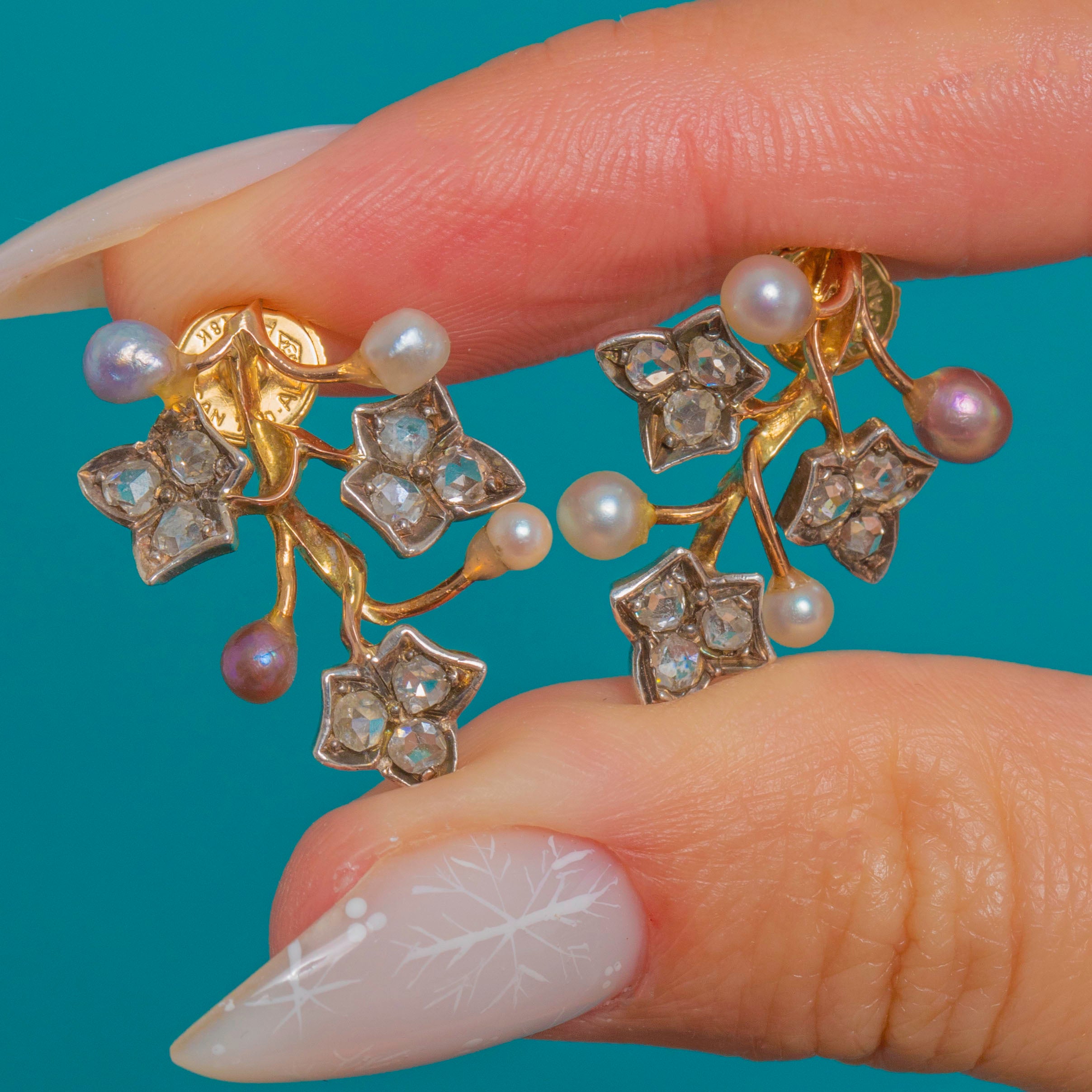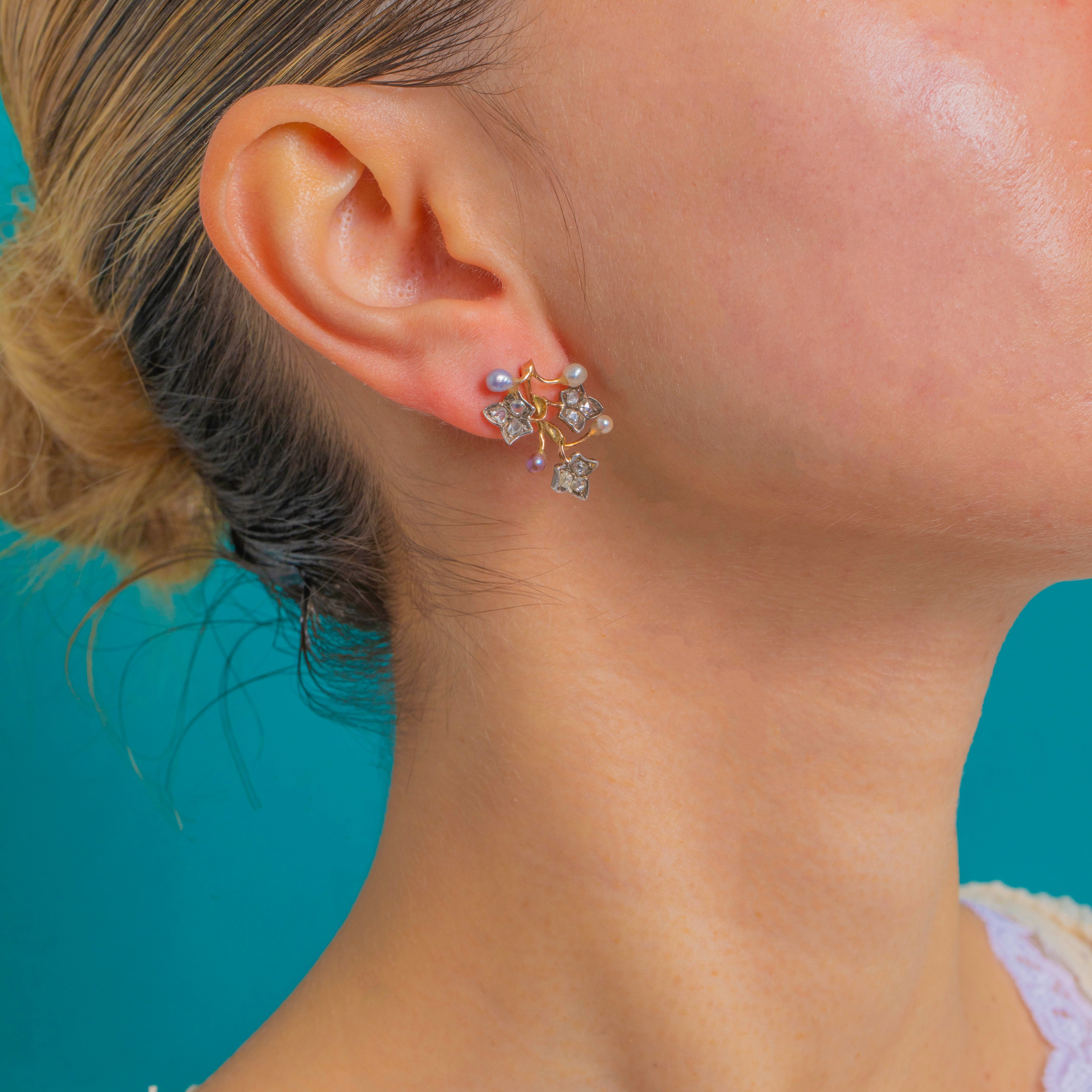 Delicately sculpted as mirrored foliate sprays, these antique ear‑climbers trace the curve of the lobe with botanical grace. The yellow Gold branches are tipped with Silver flower and starry heads, each glinting with petite rose-cut Diamonds, while the Natural Pearls lend a soft, luminous counterpoint in pretty pastel hues.
