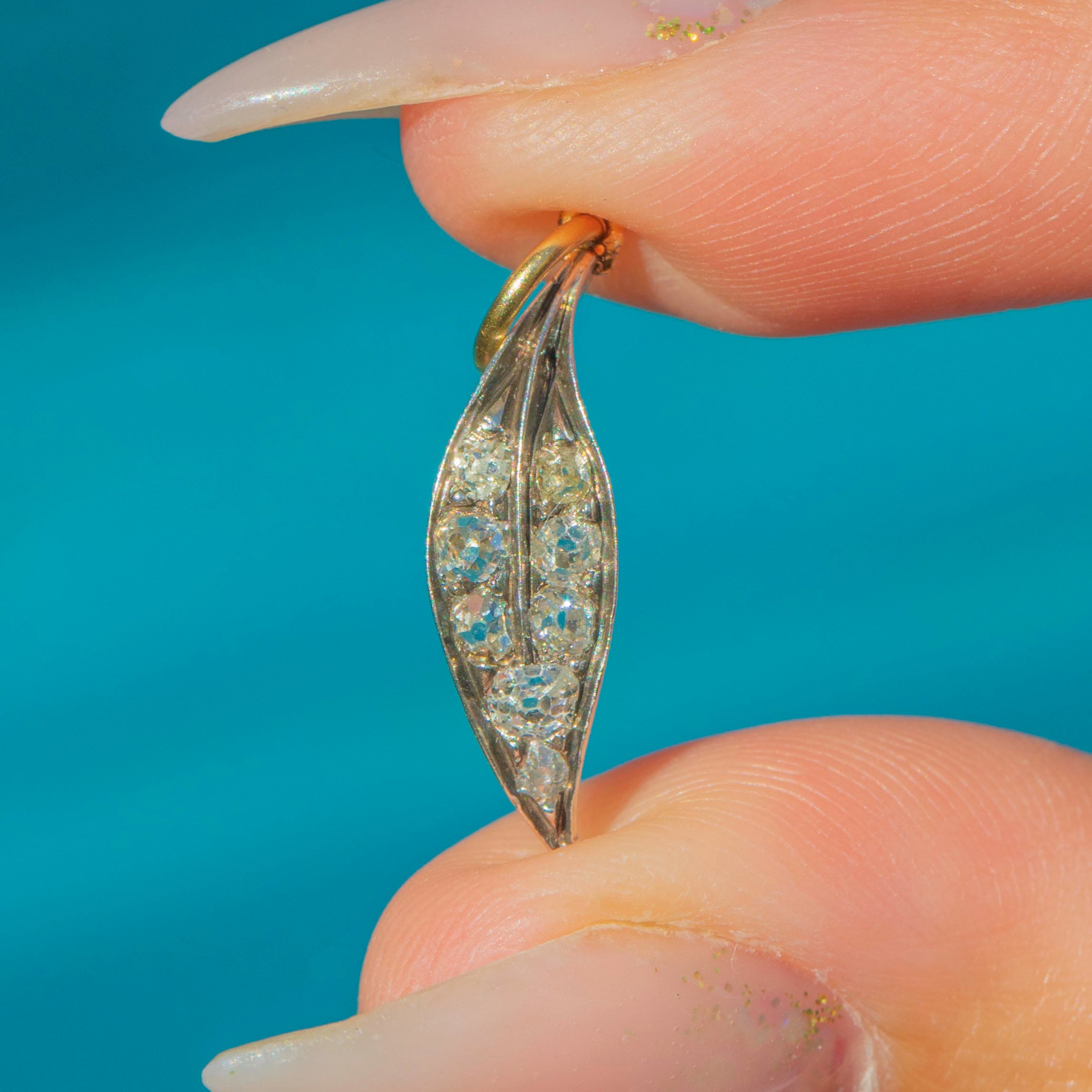 This elegant Victorian Diamond leaf charm is a fine example of antique naturalism in jewellery. The graceful leaf form is delicately set with two rows of glittering old mine-cut Diamonds, eight in total, giving the piece a sparkling yet subtle appeal.