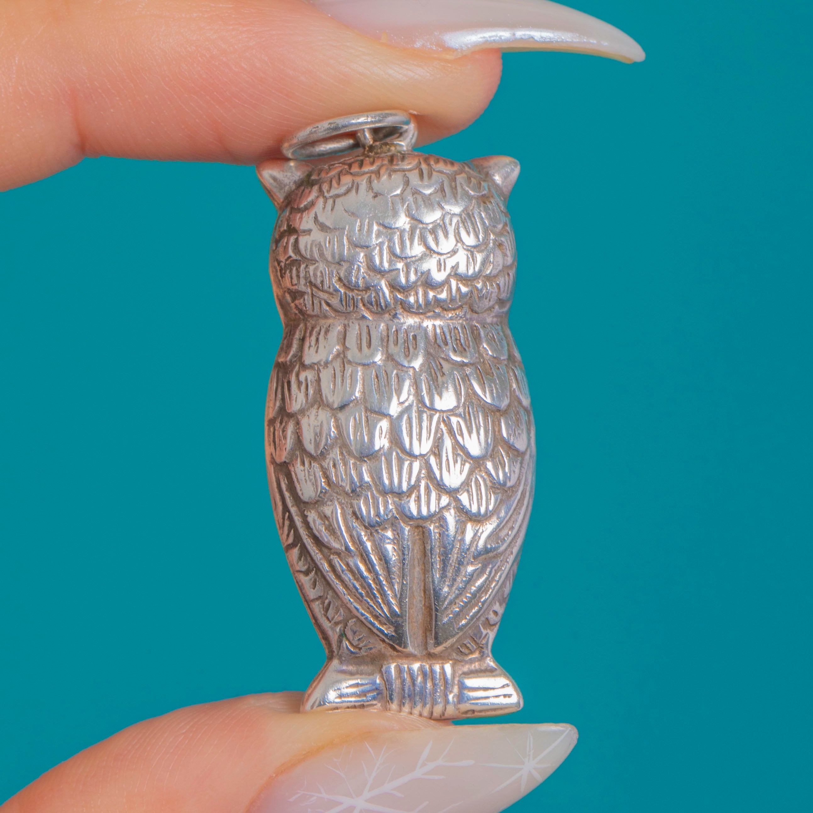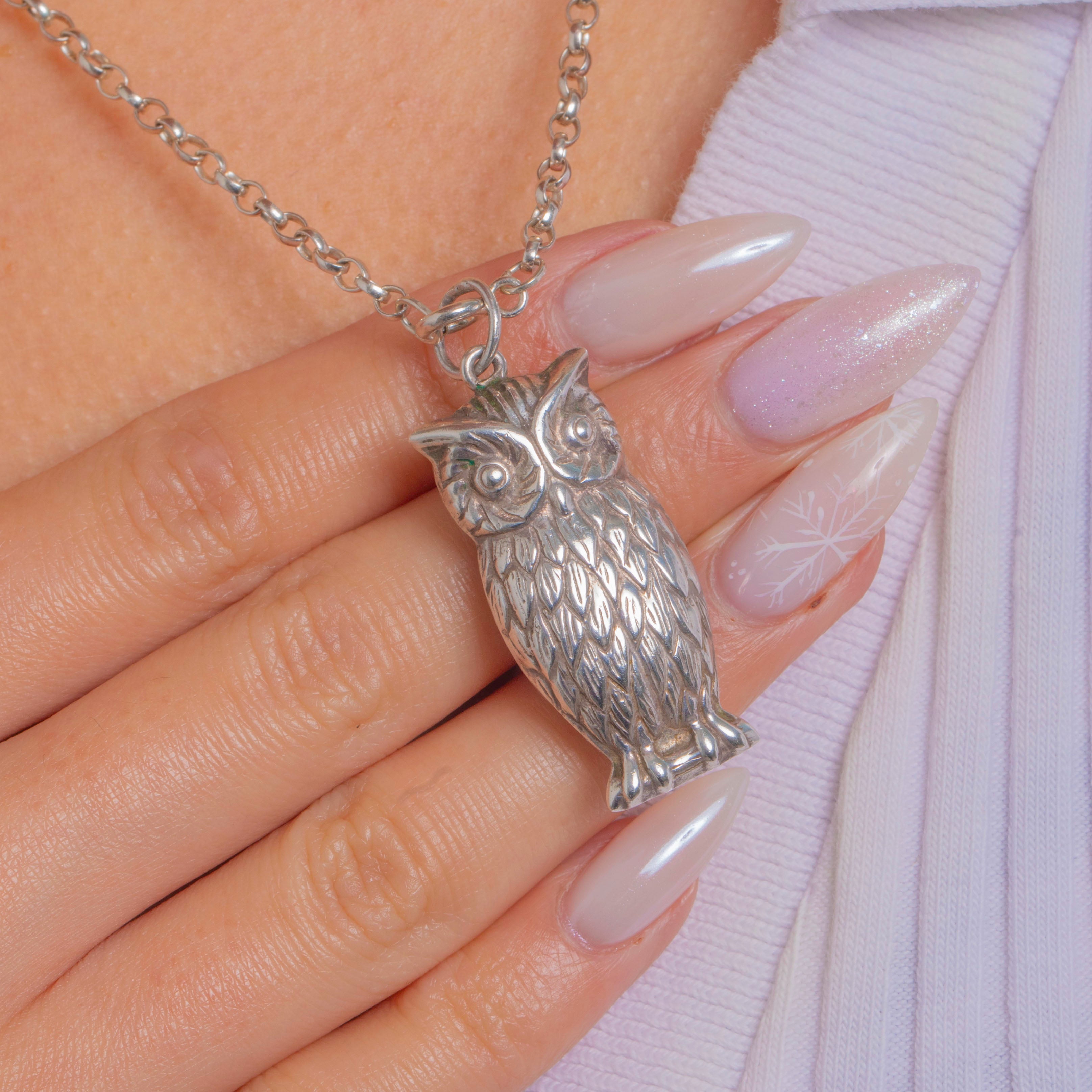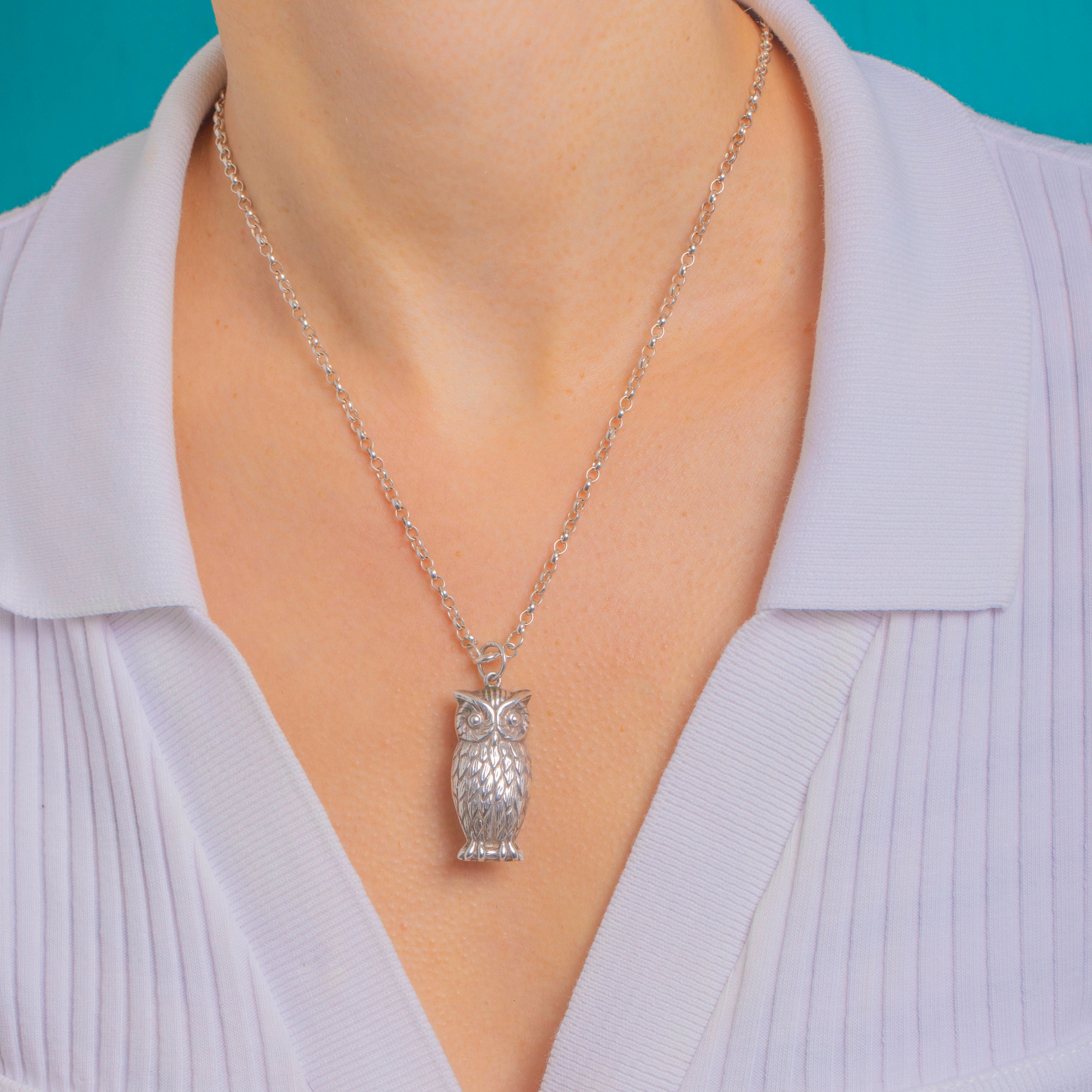 Charming and characterful, this antique Victorian Owl pendant is crafted in Sterling Silver with beautifully defined feathers, pronounced brow tufts and large round eyes. The high points glow with a bright polish while the softly oxidised recesses add depth and drama to every detail.