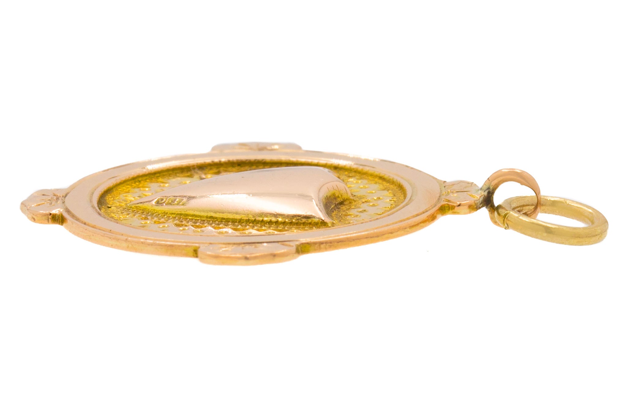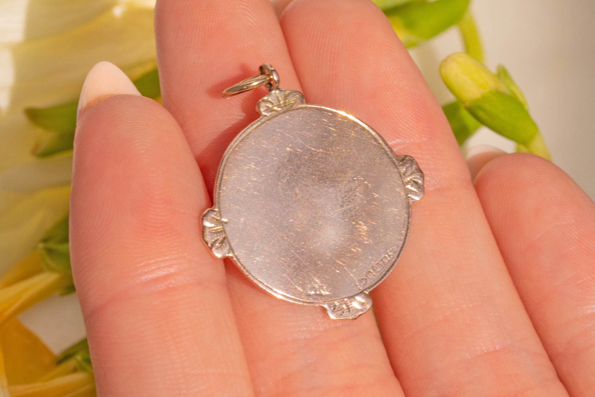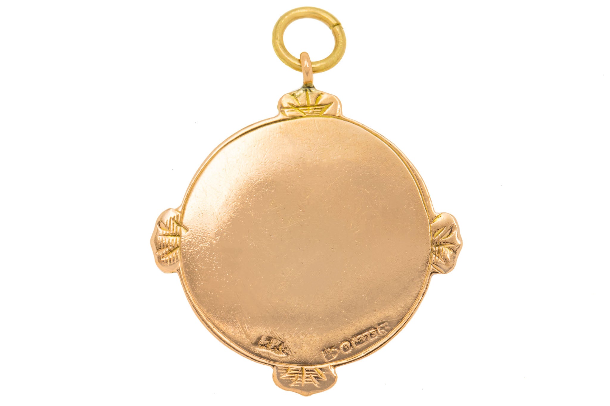 VERY GOOD. This Art Deco 9ct Gold medal fob pendant is in very good condition! The Gold is gorgeous and the details are delightful. There are a few little scratches to the back of the piece, but this is surface wear commensurate with age. This beauty has an ever so slightly thinned hasp, which is visible from the side, but the piece is still robust and sure to last many more years. This is a gorgeous piece.