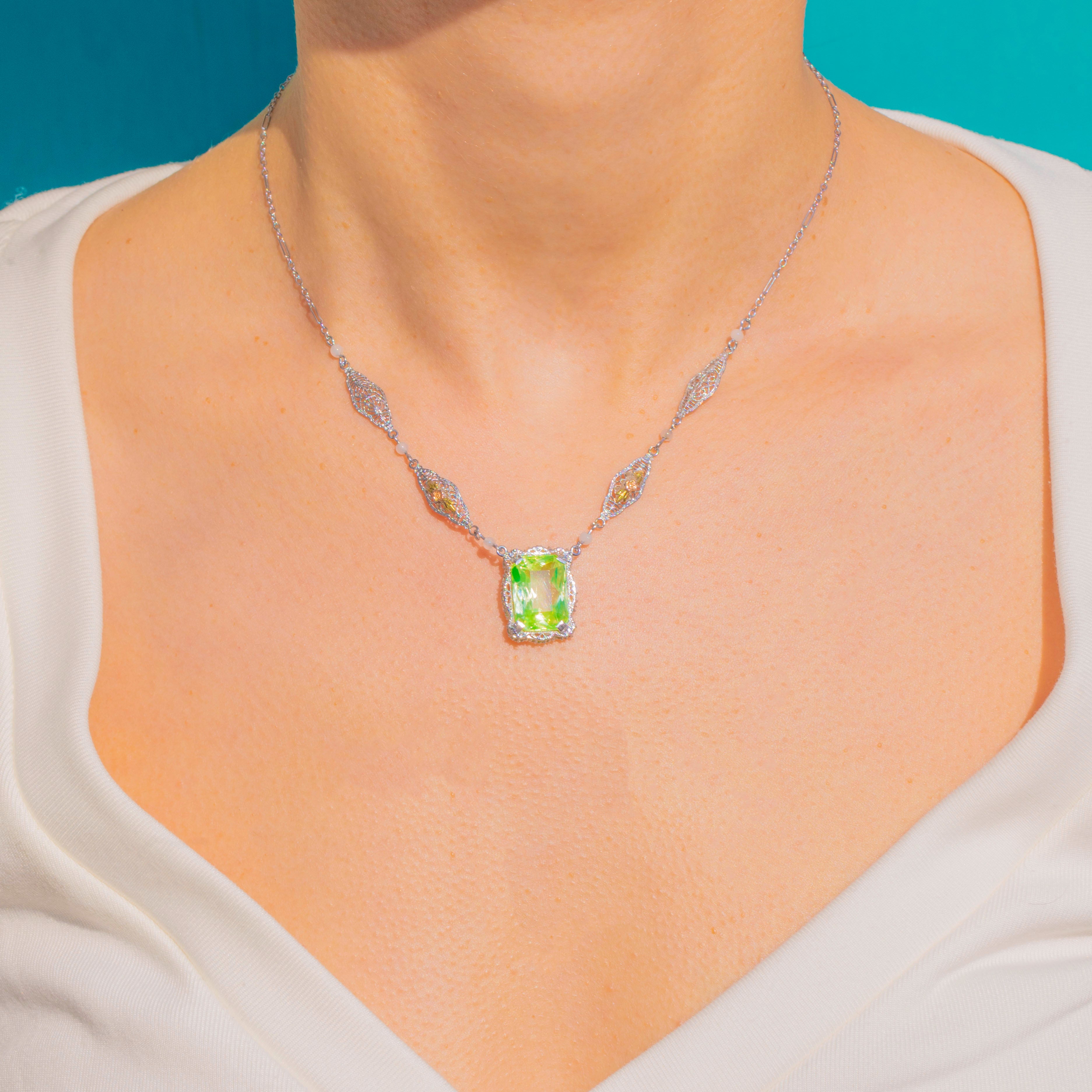 A fabulous Art Deco filigree necklace in 10ct White Gold, enriched with delicate rose motifs crafted in 10ct Rose Gold and 10ct Green Gold. Its centrepiece is an emerald-cut Neon Green Spinel—electric, vivid and eye-catching—likely antique lab-grown, set within a lacy openwork halo with fine milgrain and tiny clear accents that lend a refined sparkle.