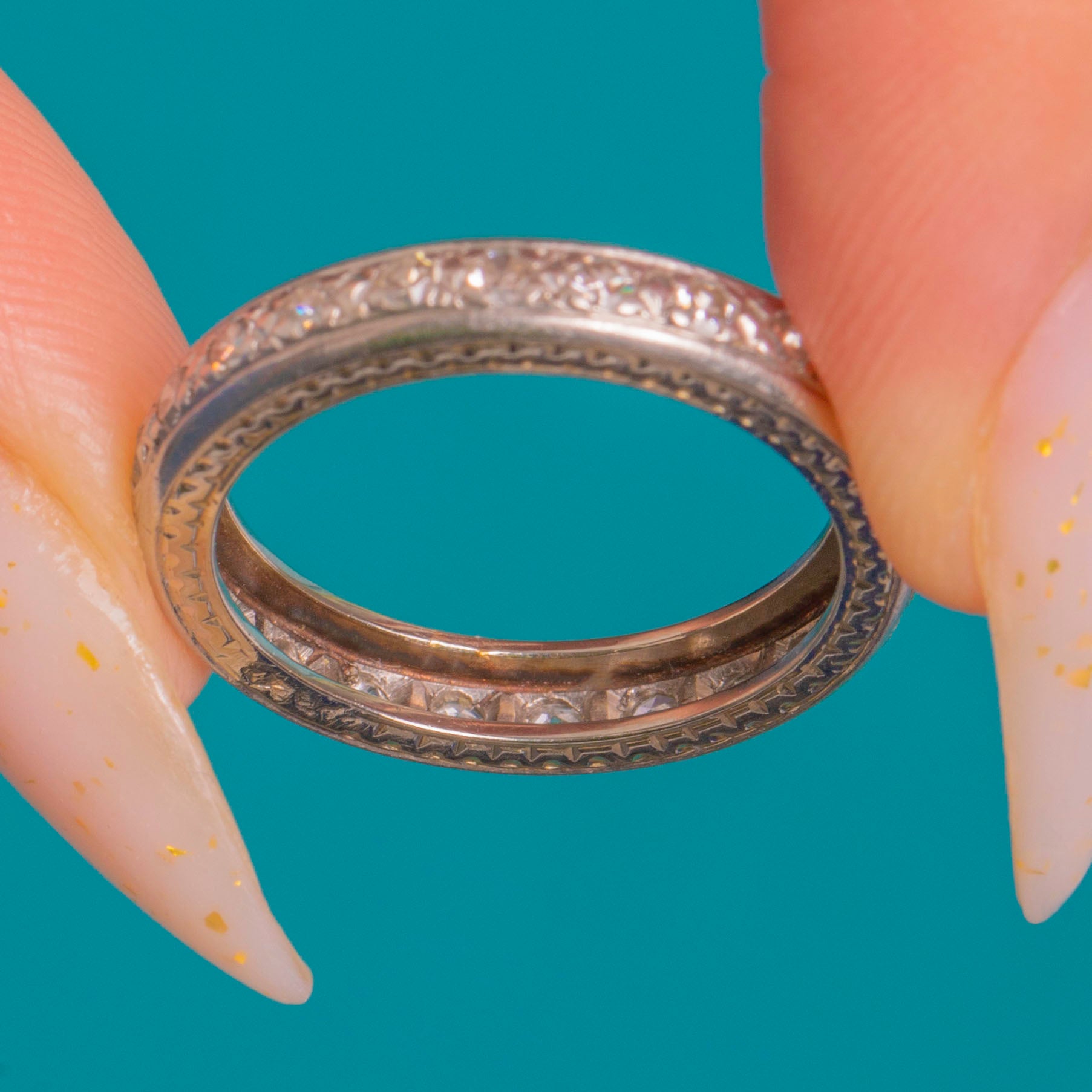 VERY GOOD: Diamonds are bright and well-matched with minor facet-edge abrasions visible under magnification; no missing stones observed. Milgrain and chevron engravings remain defined with gentle softening from age; the Platinum settings are secure. The band shows light surface wear commensurate with age and no visible repairs.