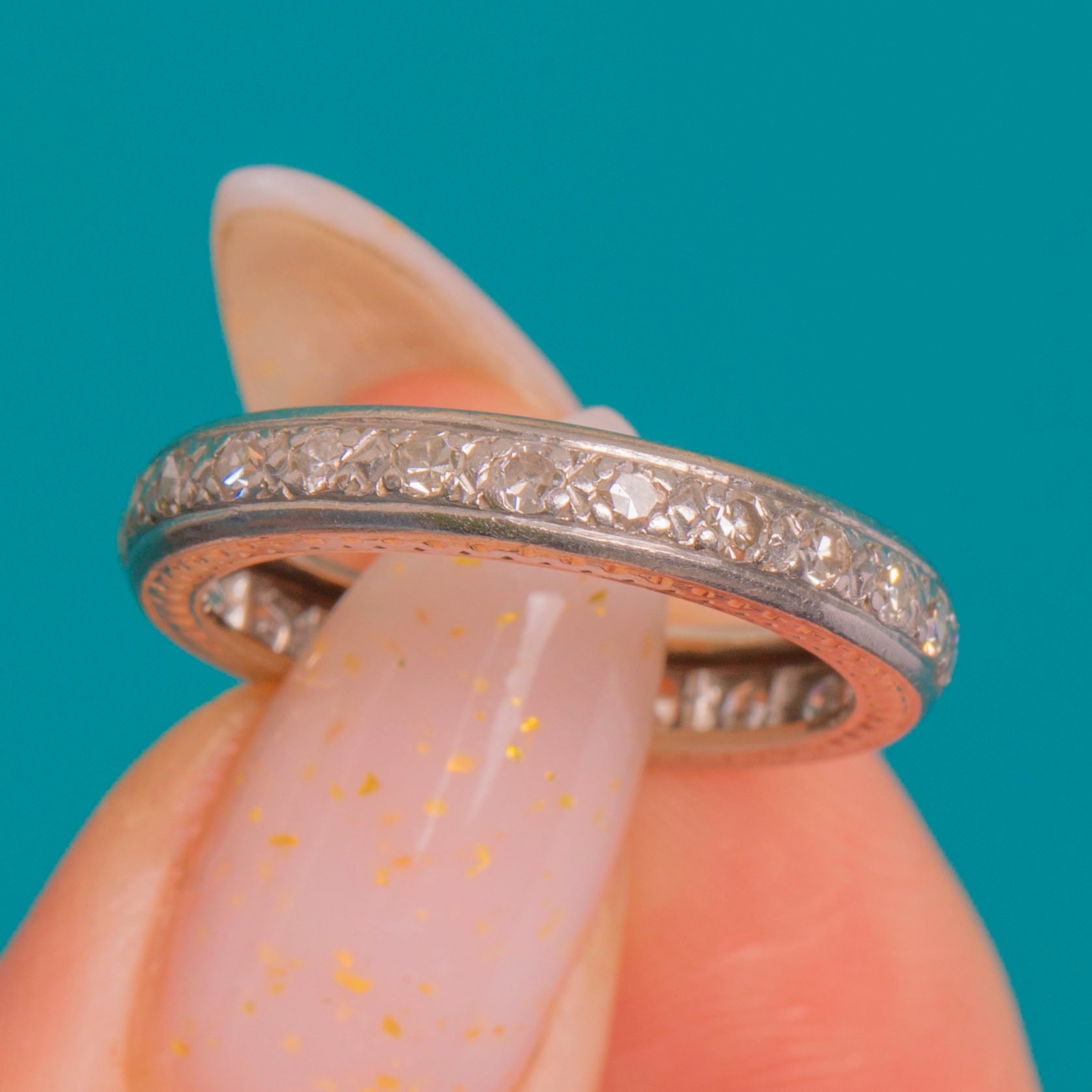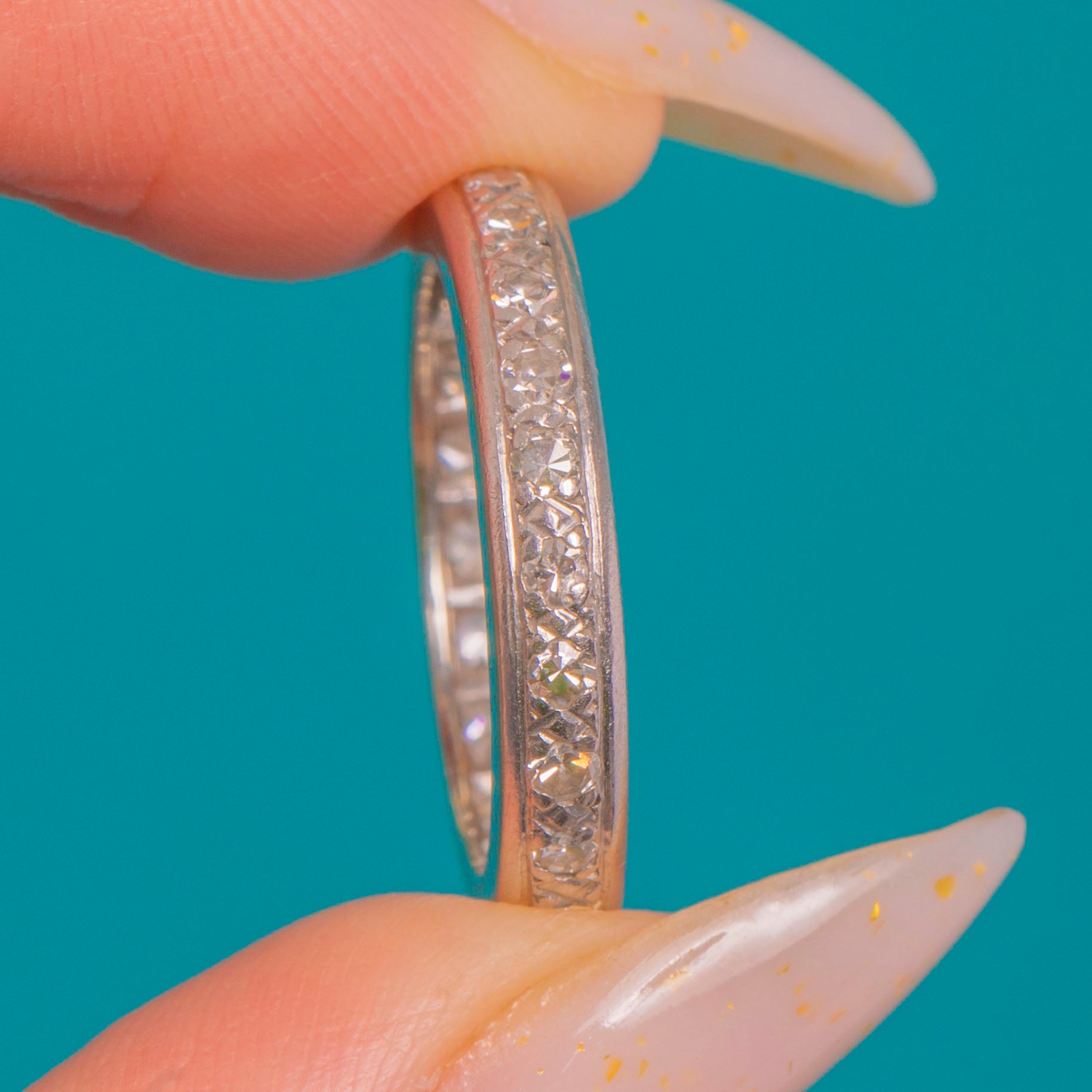 Elegant and geometric, this Art Deco eternity ring encircles the finger with a continuous line of closely matched French-/carré-cut Diamonds, totalling approx. 0.50ct. The stones are set in crisp Platinum with fine milgrain rails for a refined, shimmering finish, all atop a 14ct Gold band.