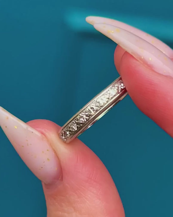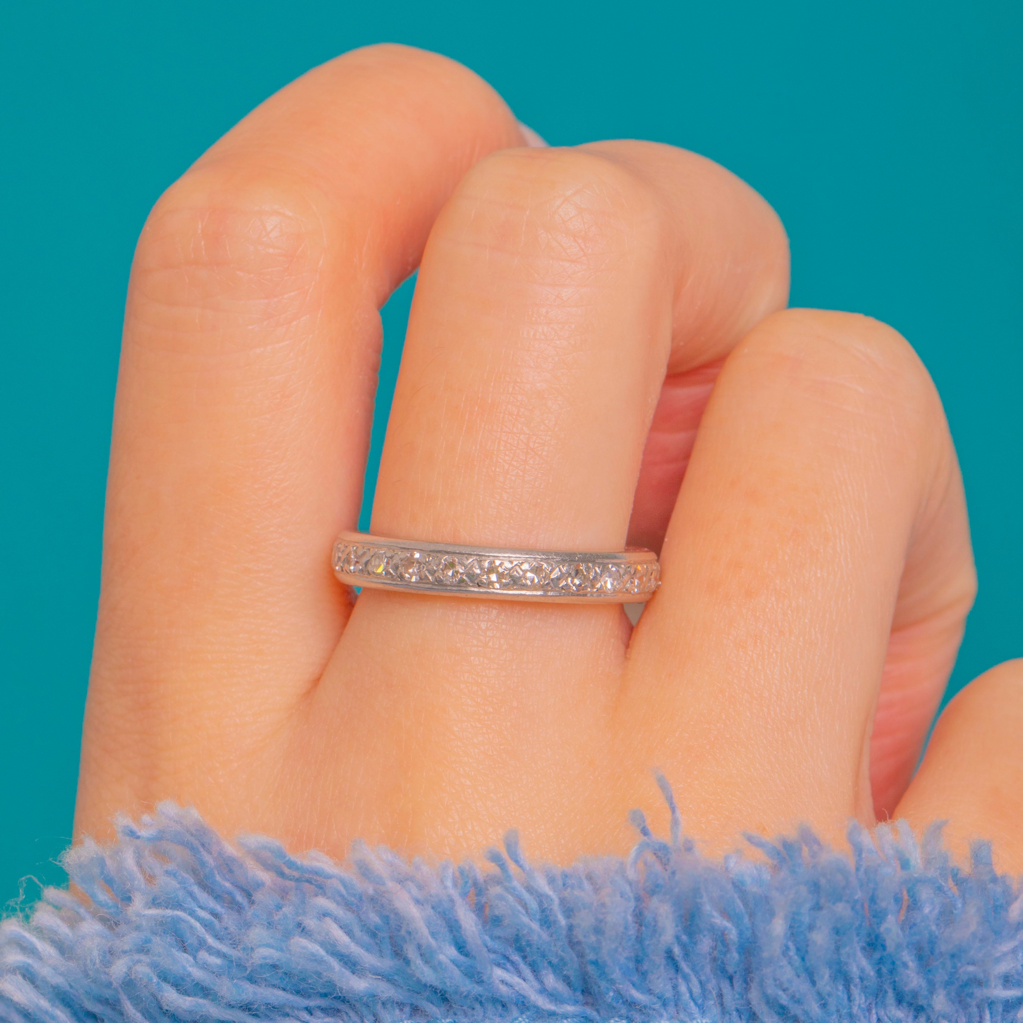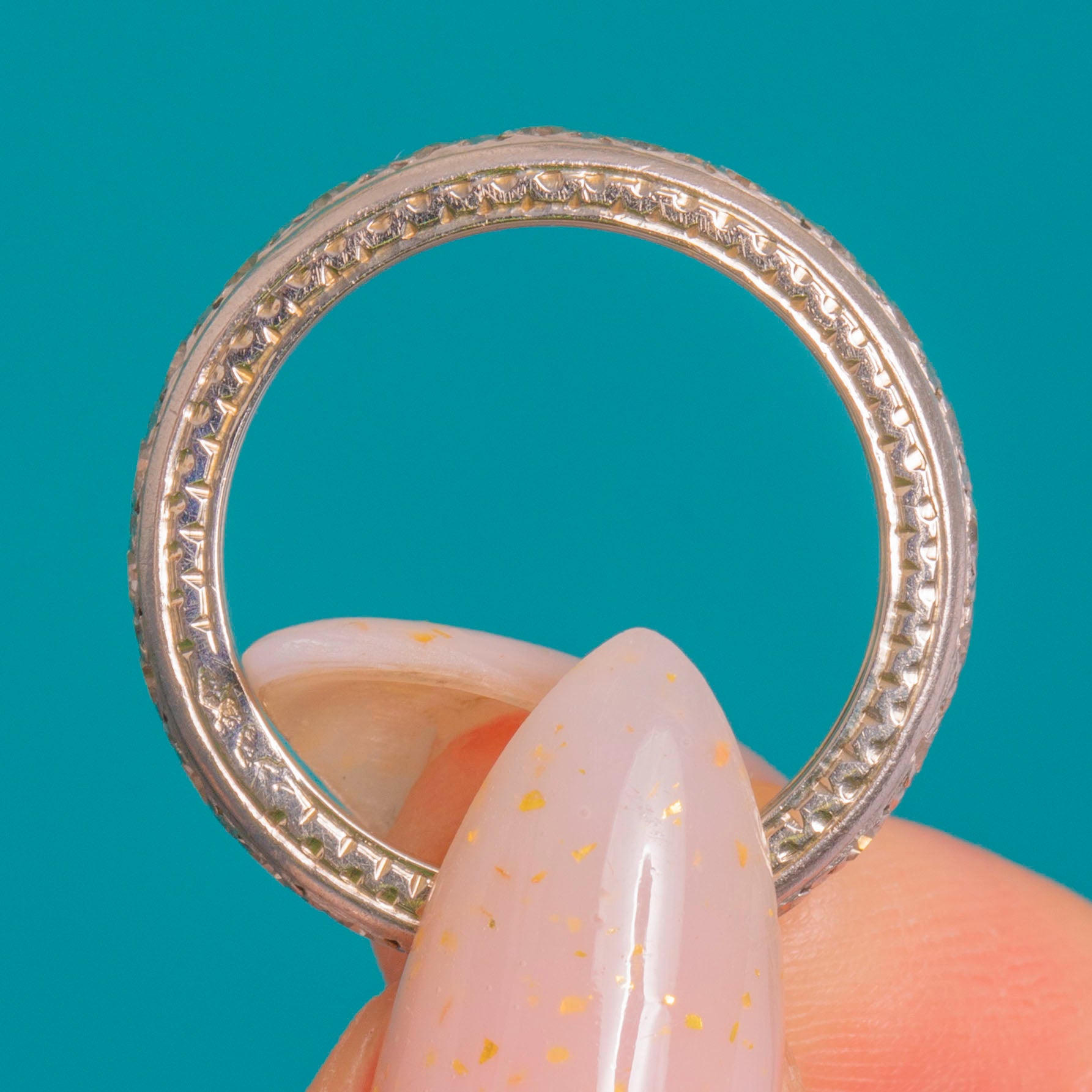 Classic zig-zag engraving decorates the outer edges, while the low-profile, hand-finished silhouette sits beautifully flush—perfect worn solo or stacked. Please note, this eternity band cannot be resized.