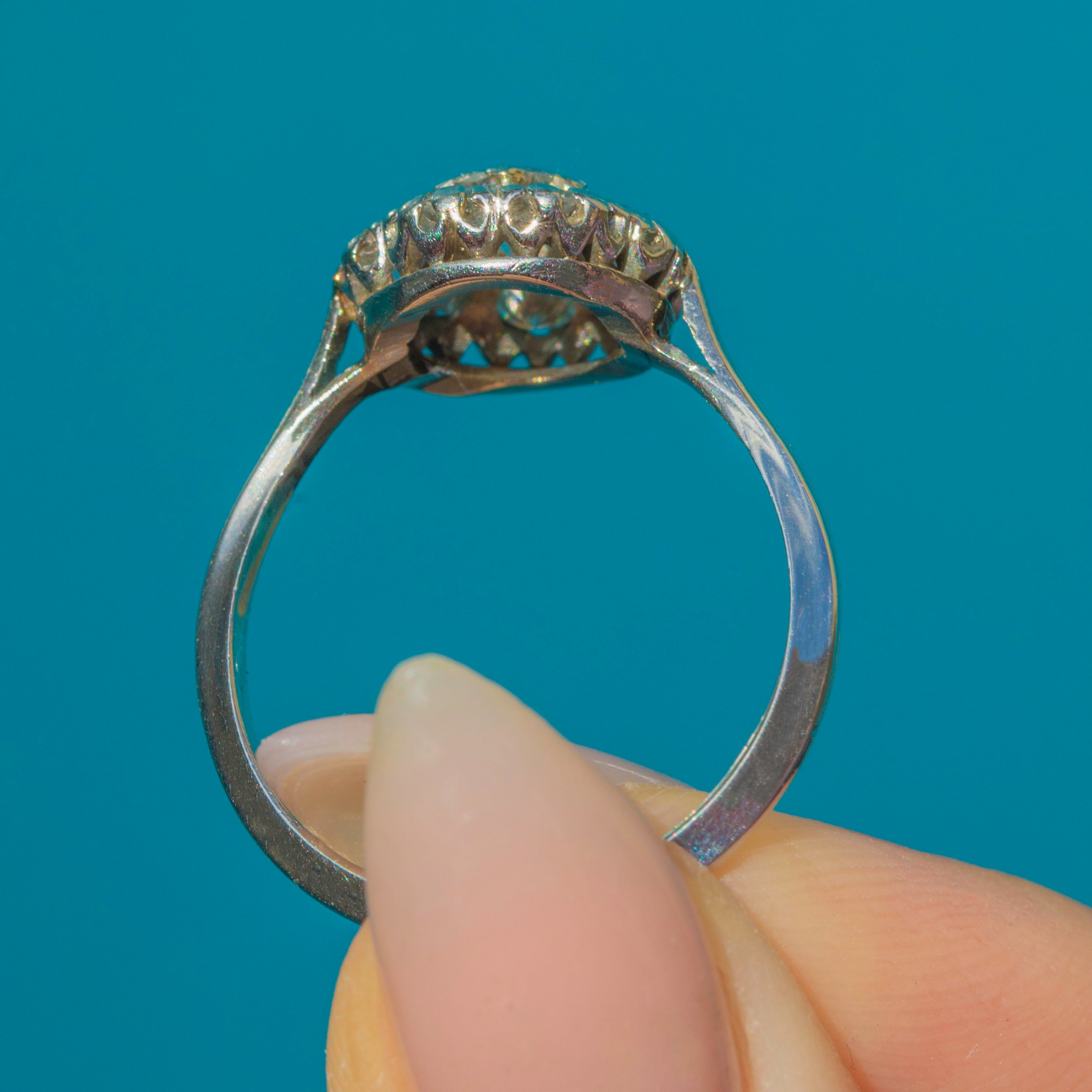 This dazzling Art Deco cluster ring is crafted in 14ct White Gold with a Platinum shank, set with a lively 1.05ct of bright Diamonds. The central 4.5mm stone is encircled by a halo of seven 3mm Diamonds, forming a radiant flower-like cluster with beautiful sparkle and symmetry. The knife-edge shank enhances the ring’s bold yet refined design.