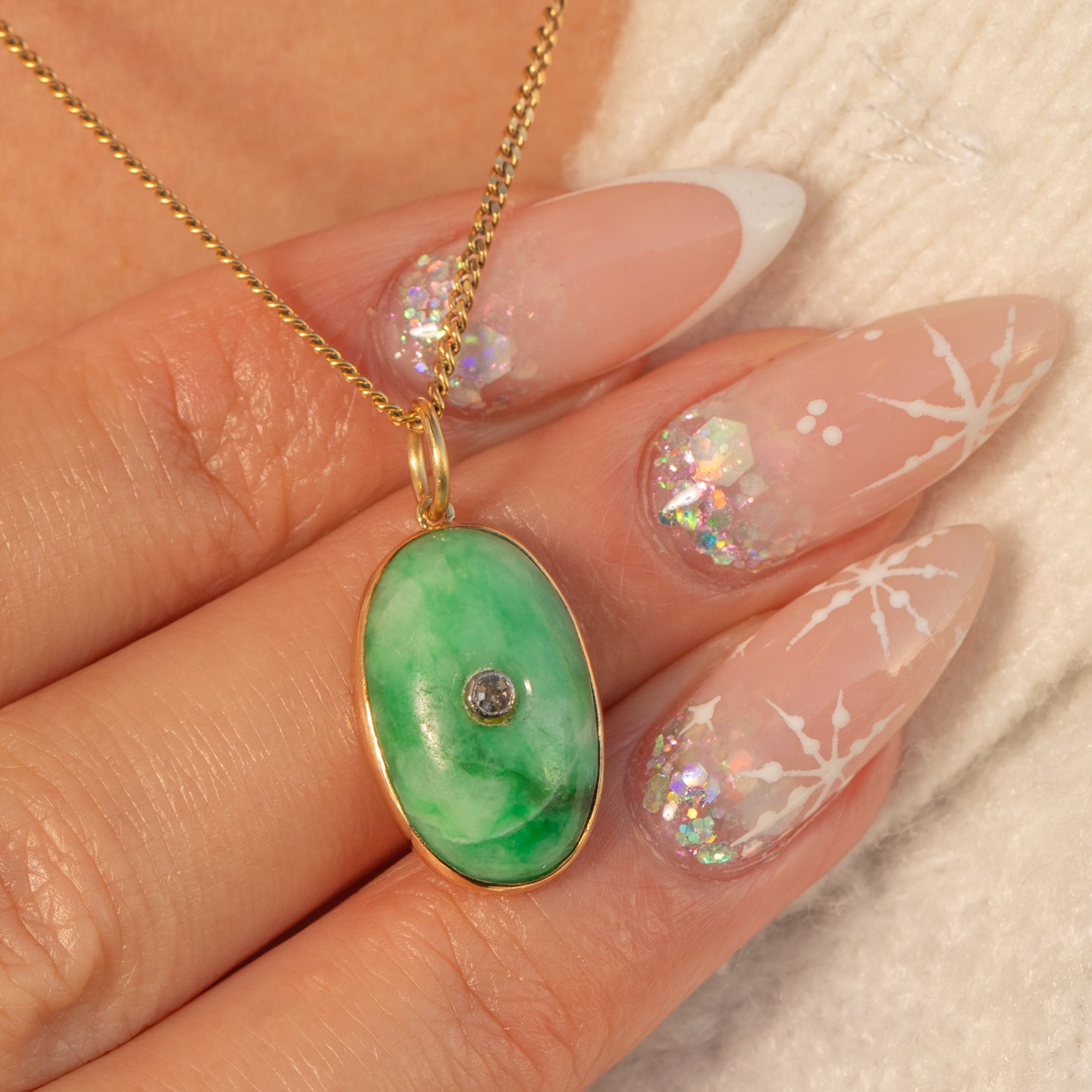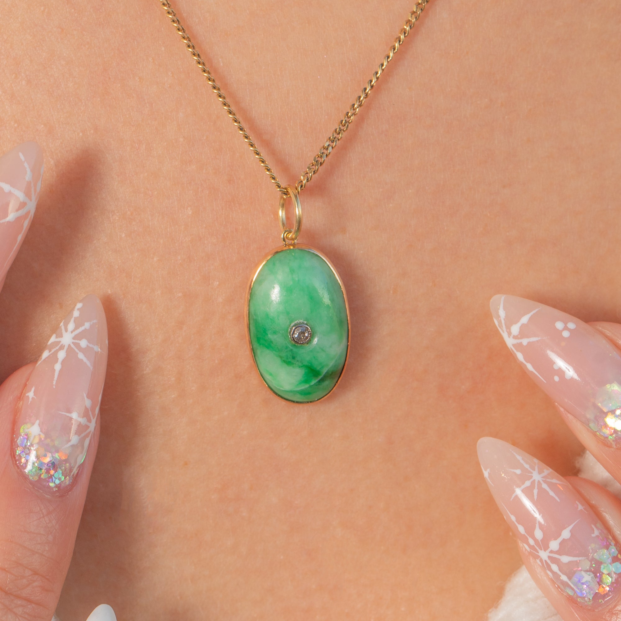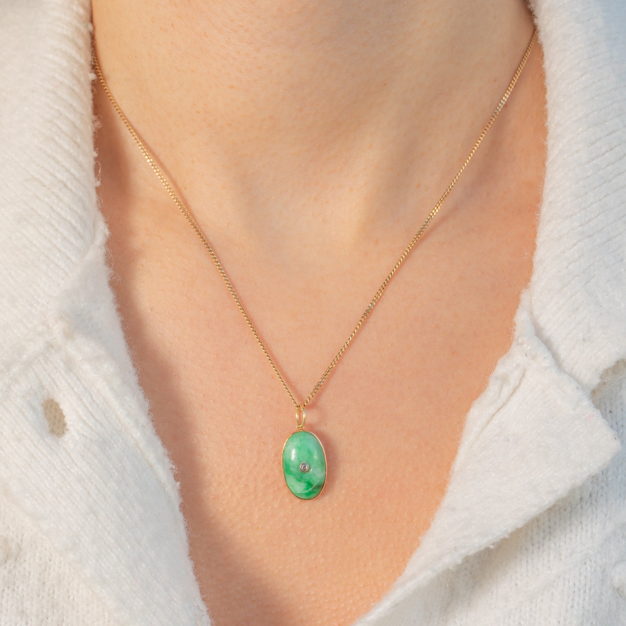 Converted from antique cufflinks, the piece has been reimagined as a beautiful pendant while preserving its original craftsmanship and character. The rich green Jade glows against warm Gold, with the Diamond adding a delicate spark—perfect worn solo or layered for a subtle pop of colour.