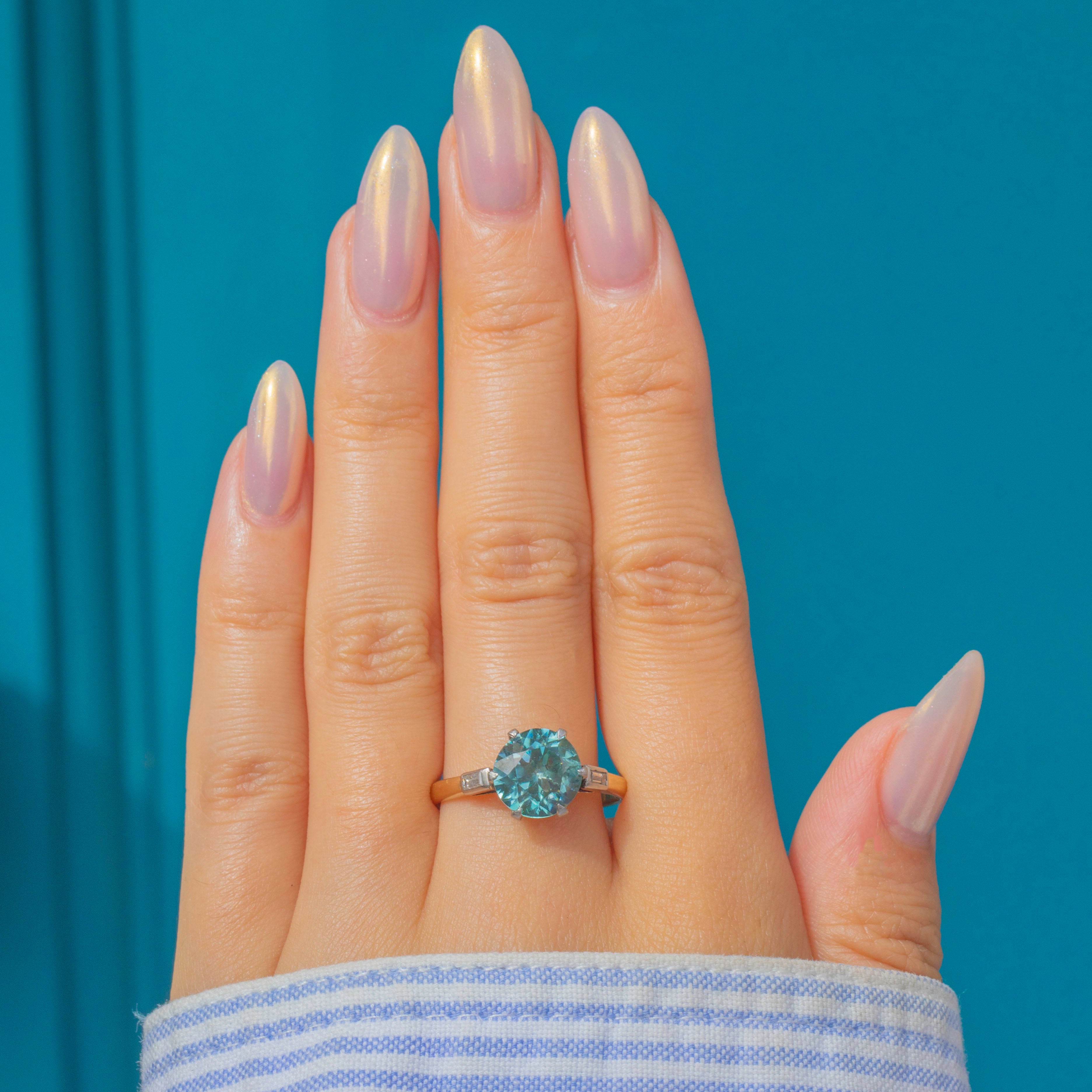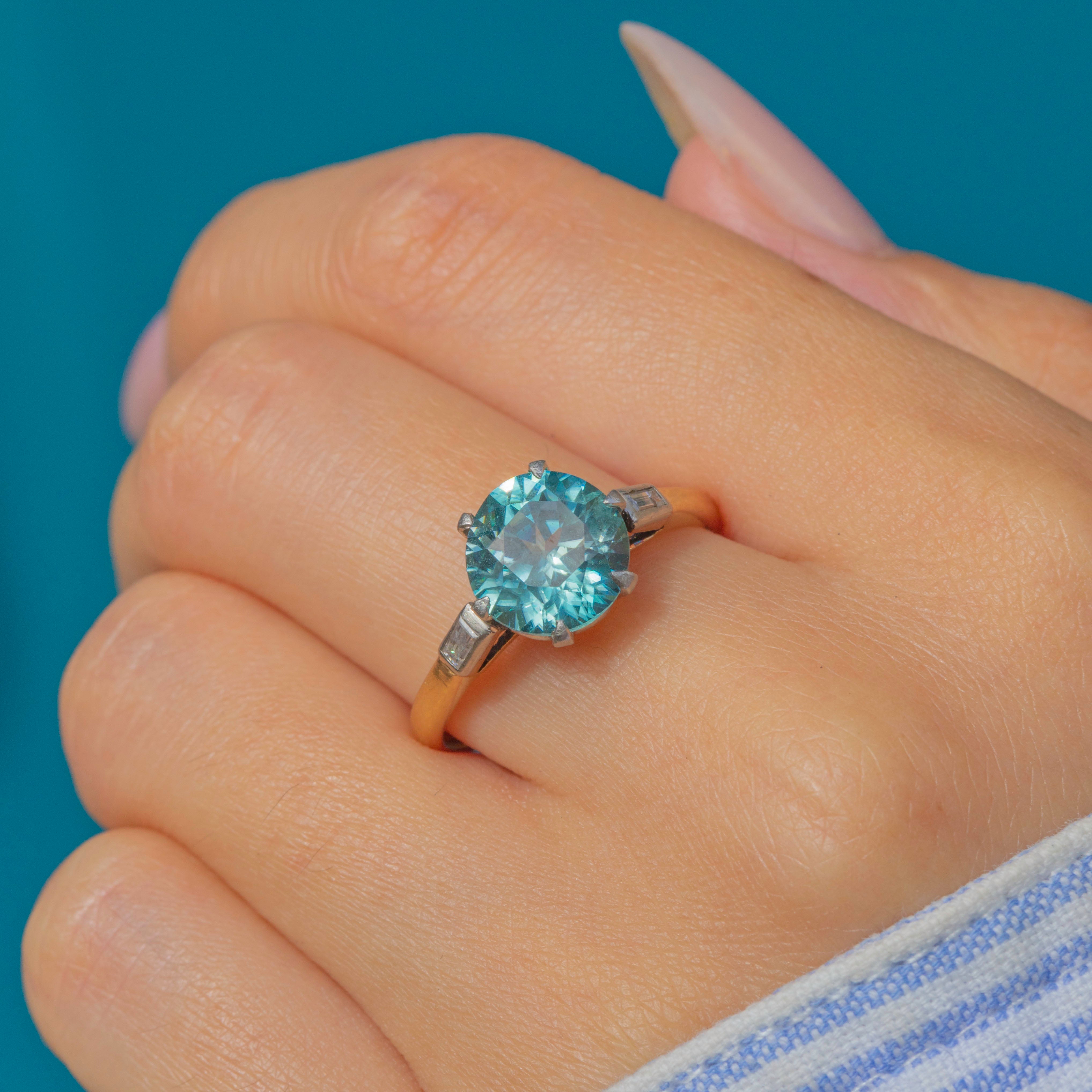 A dazzling Art Deco cocktail ring featuring a vivid blue Zircon of approx. 4.5cts, claw set in Platinum with baguette Diamond shoulders. The Zircon measures 9mm in diameter, with crisp facet edges and a lively brilliance that rivals a Diamond in sparkle. Its vibrant aqua-blue hue makes it a striking centrepiece, perfectly reflecting the bold glamour of the 1930s.