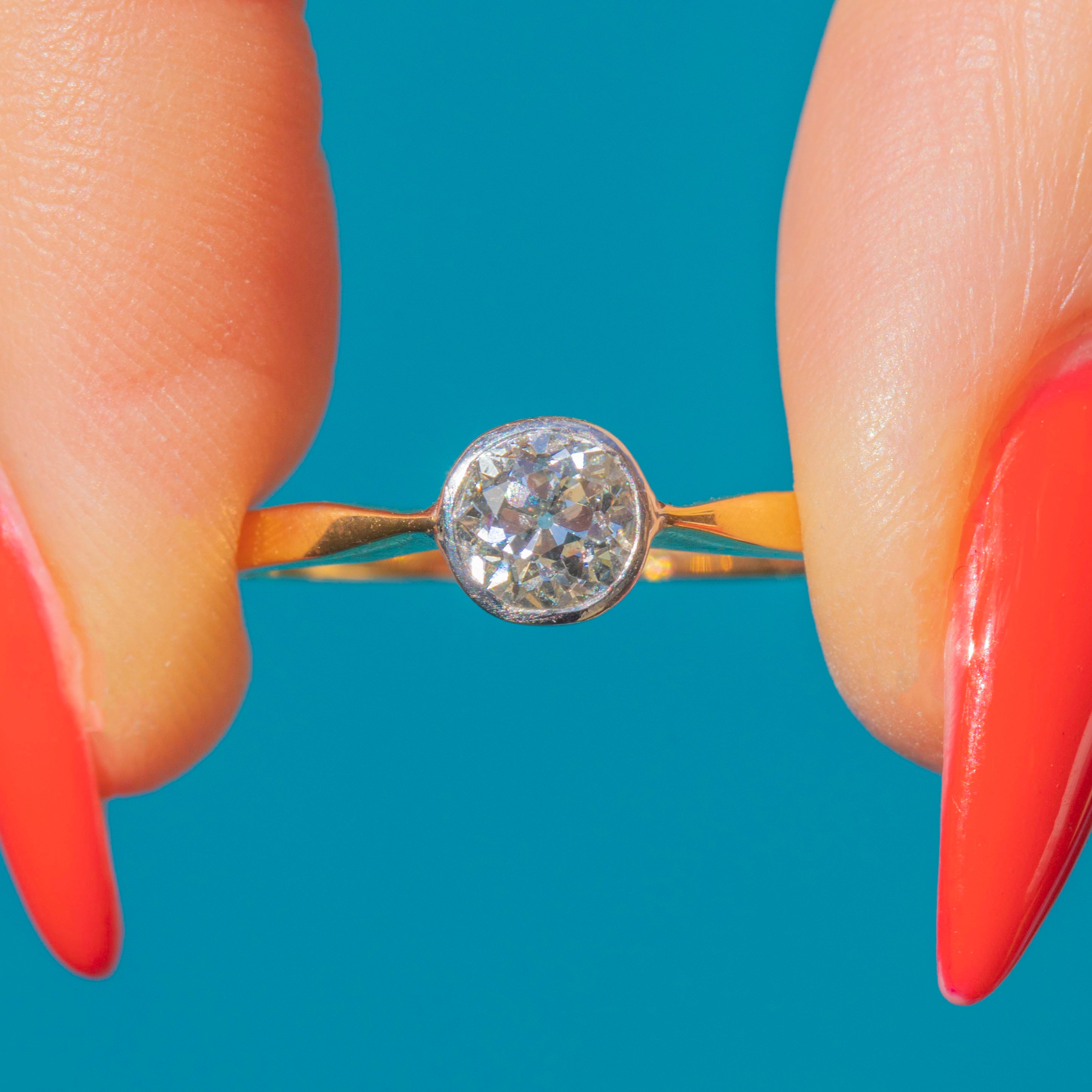 VERY GOOD-EXCELLENT. This Art Deco 18ct Gold bezel-set Diamond solitaire ring is quite the find with an astoundingly rare 0.80ct old European Diamond! The ring is stunning, inlaid with a bright and sparkly old-European cut Diamond in perfect condition with no chips, or abrasion of any kind.