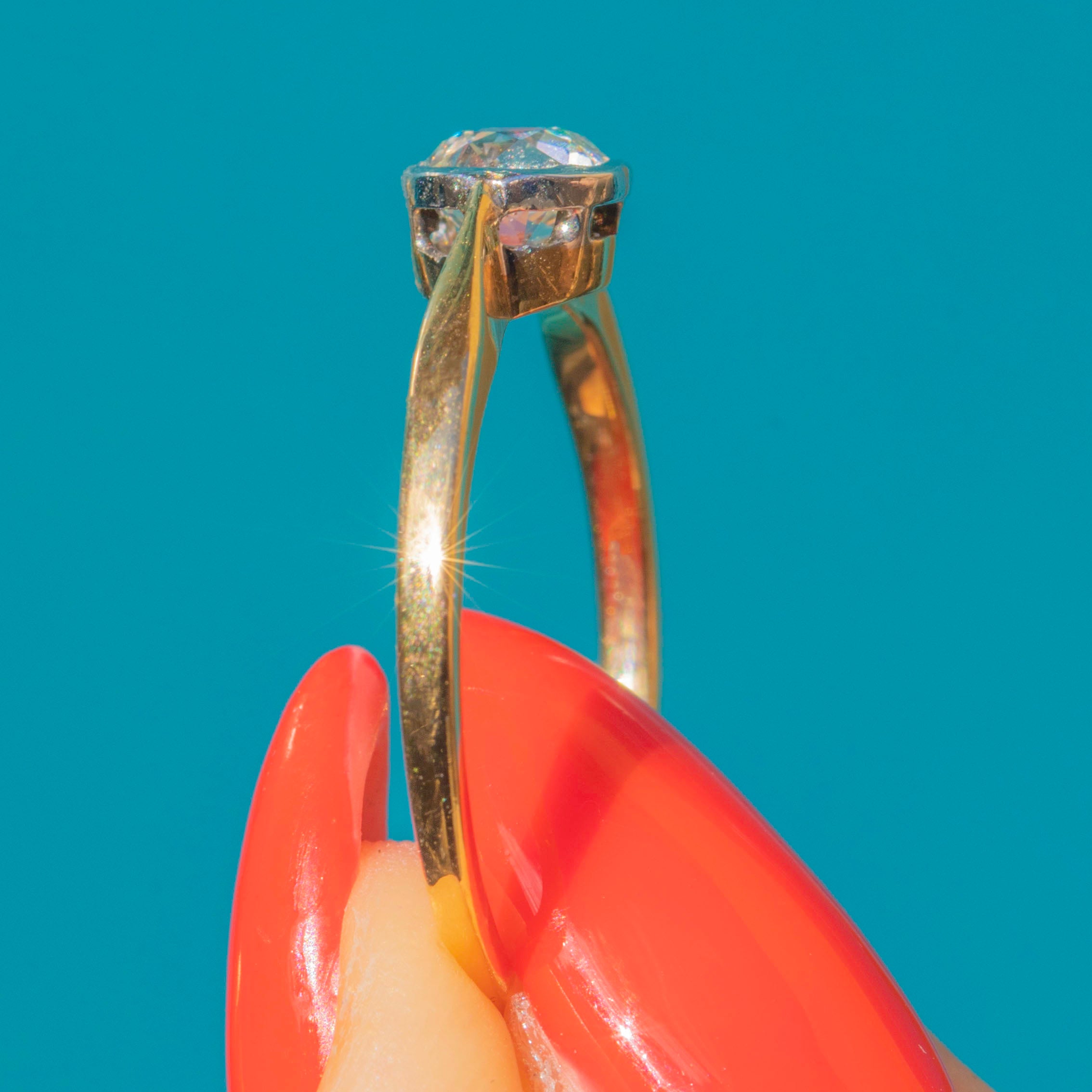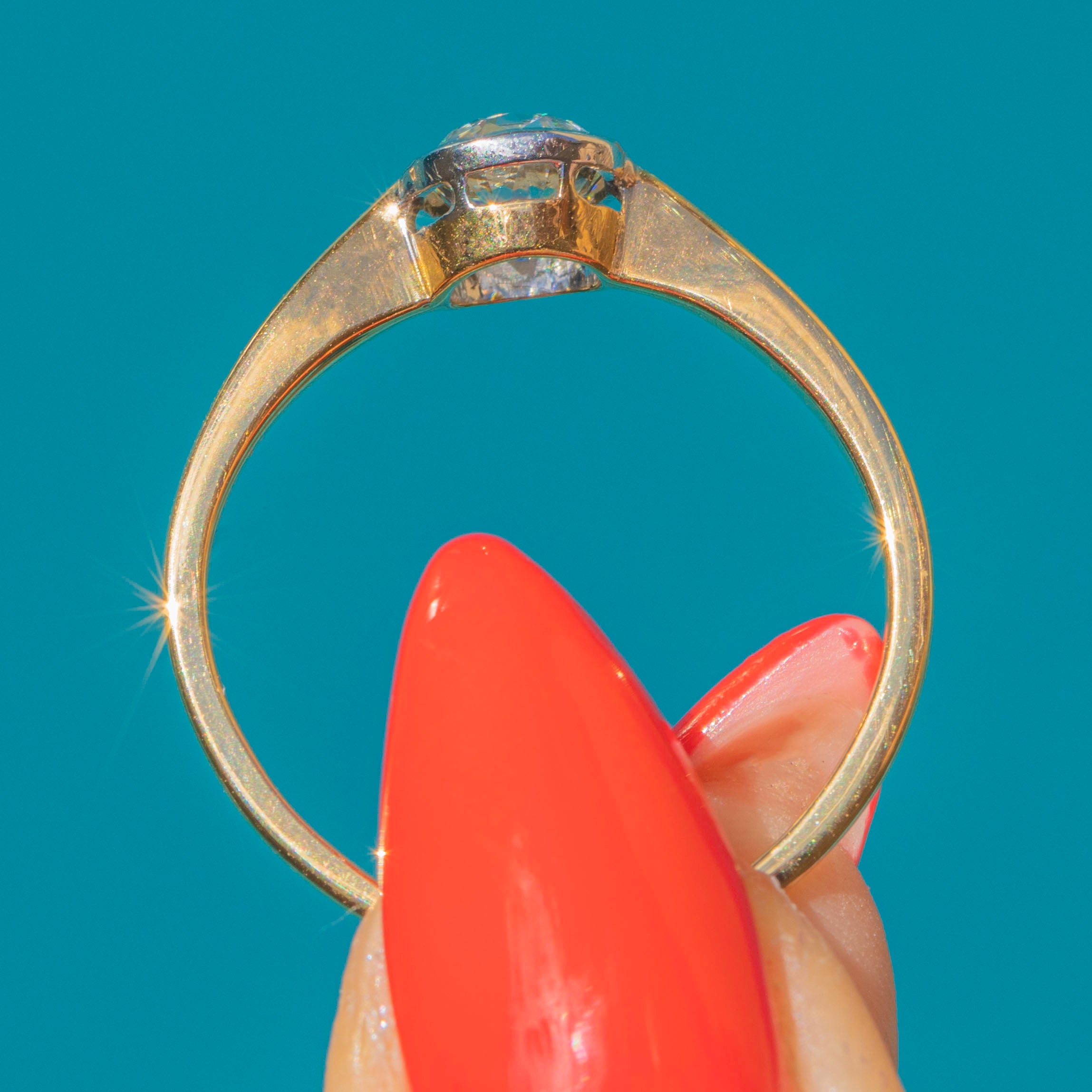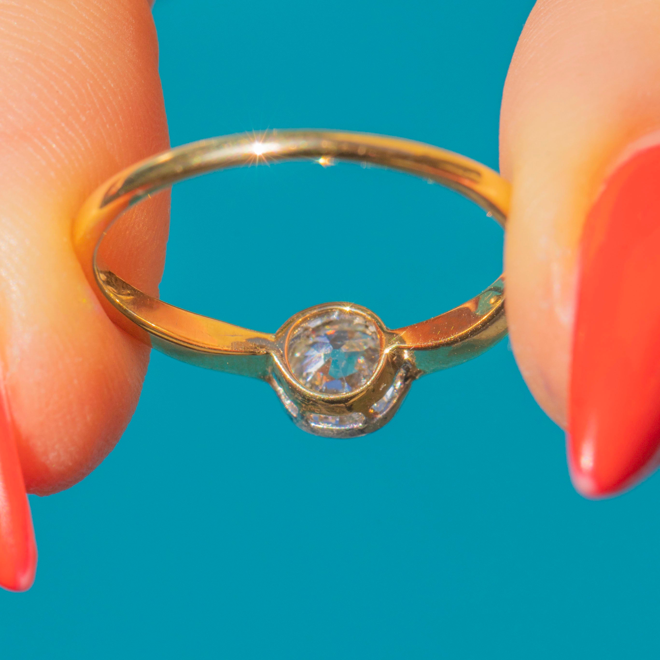 The ring has a robust 18ct Gold shank and superb Platinum settings. There is a minor kink inside the band from where it has been previously resized, a sure sign that she was well-loved for many years before. But rest assured it is strong enough to be worn with confidence daily!