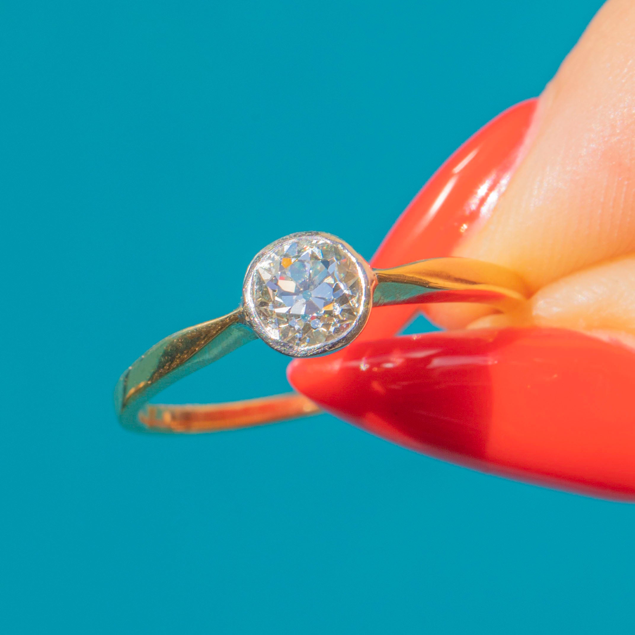 This Art Deco 18ct Gold bezel-set Diamond solitaire ring is quite remarkable. The impressive central 0.80ct Old-European Diamond is set in Platinum, and has an impressive J colour and SI1 clarity!