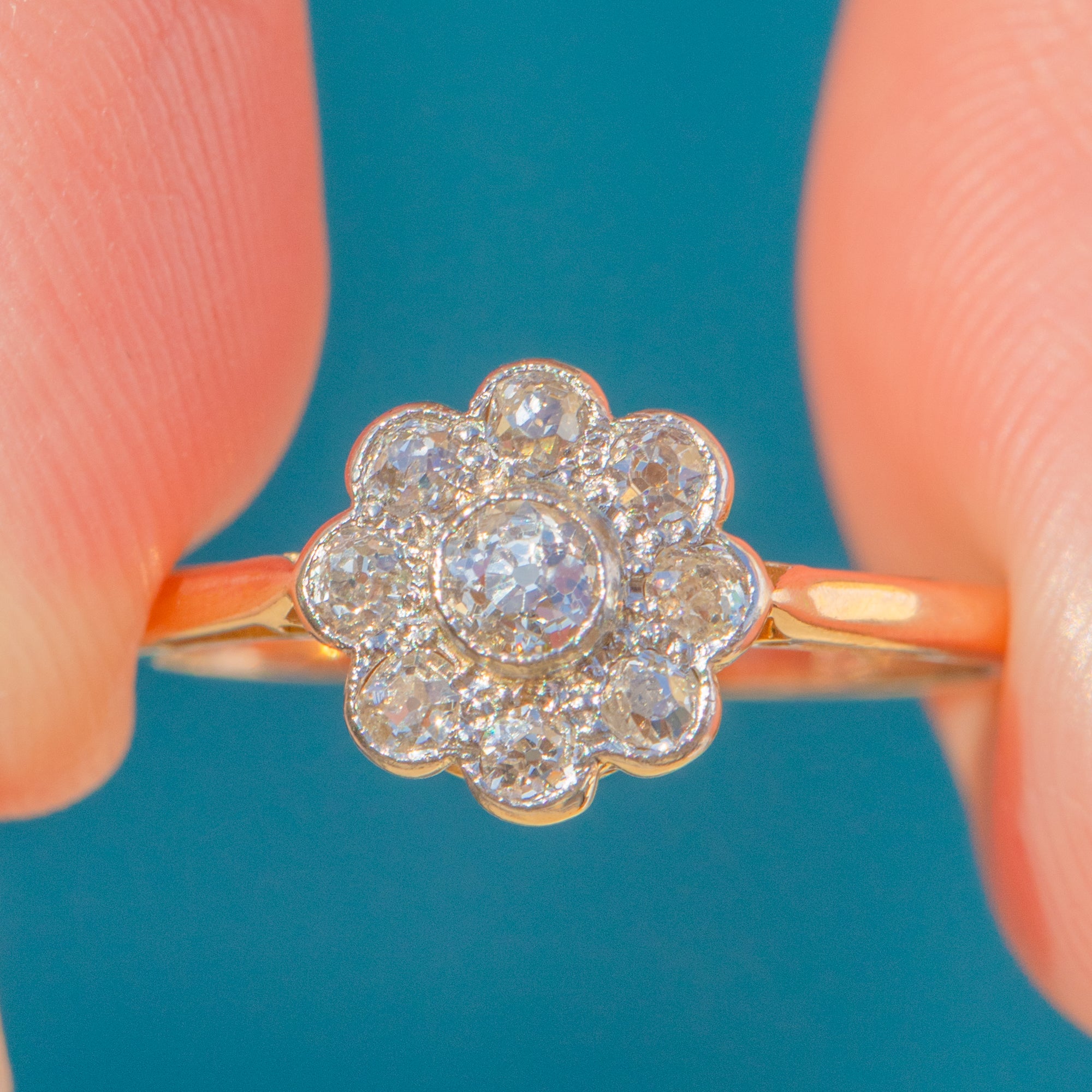 A glittering Art Deco Diamond cluster ring crafted in 18ct Gold with Platinum settings. The ring is set with a lively transitional cut Diamond at the centre, surrounded by a halo of old European, old mine and transitional cut Diamonds. This classic daisy cluster form was a much-loved style of the Art Deco era, with each Diamond sparkling beautifully against the crisp millegrain Platinum detailing.