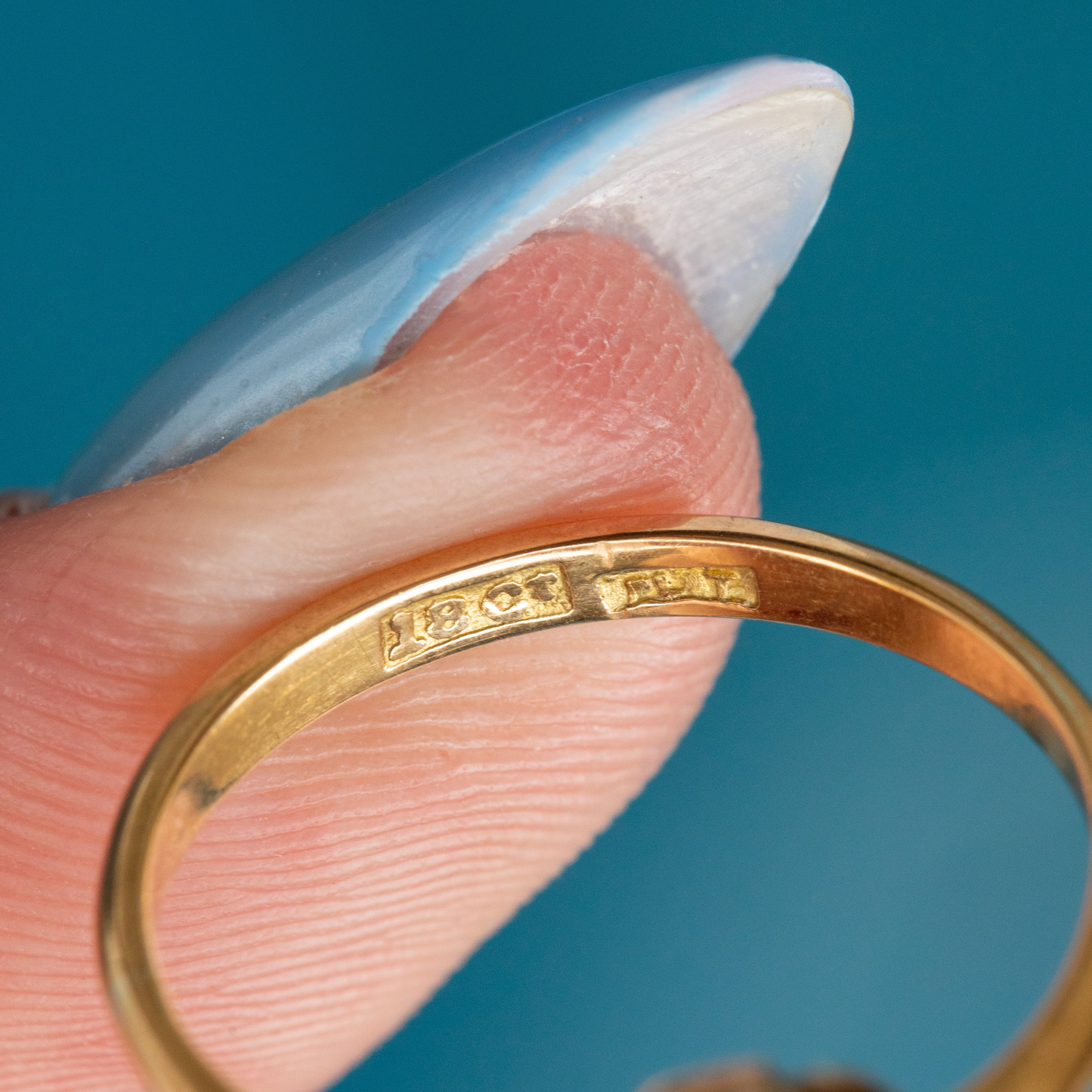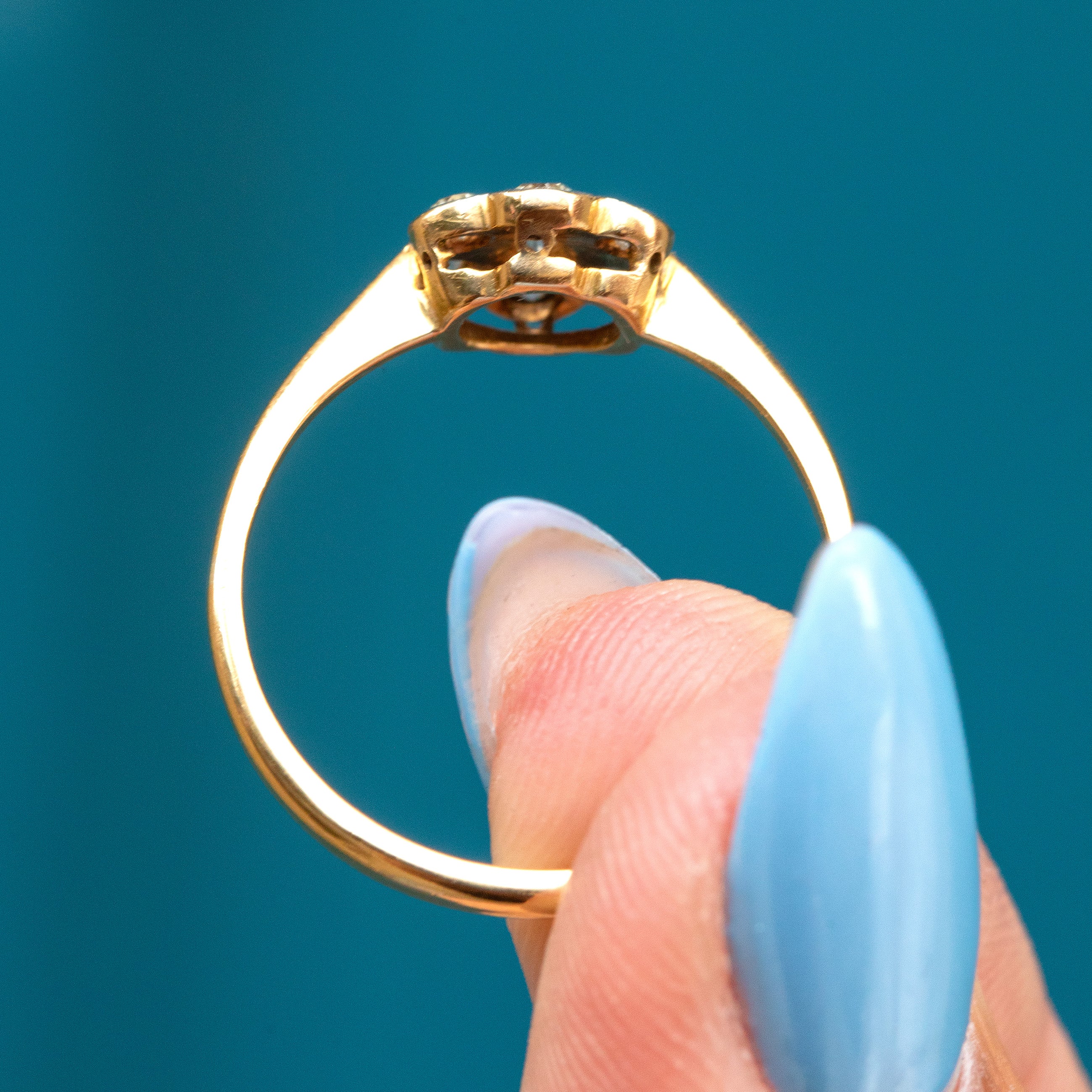 Crafted from a combination of 18ct yellow Gold with lustrous Platinum settings, this antique ring flaunts 0.20cts of bright and lively Round Brilliant Diamonds, each with a distinct sparkle.