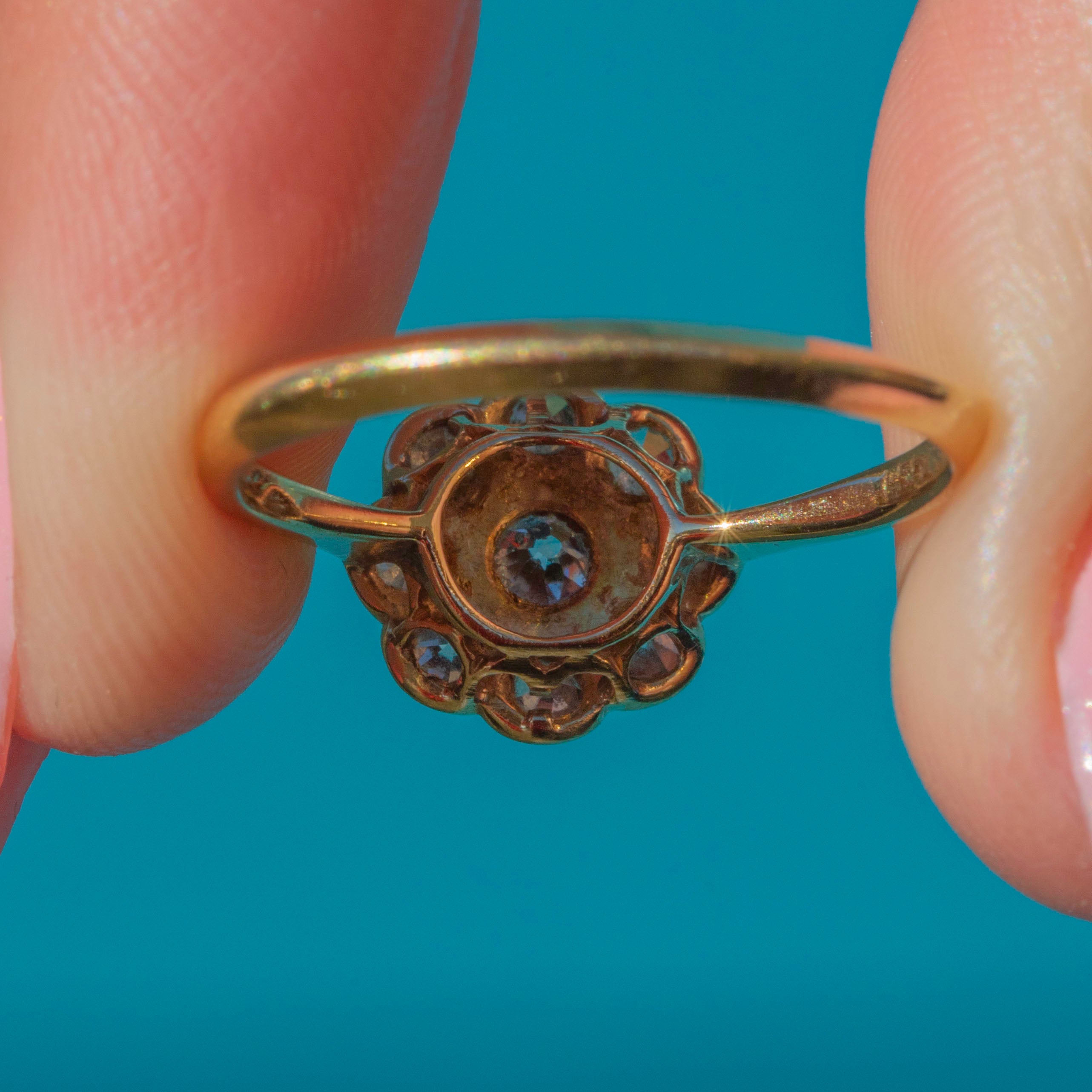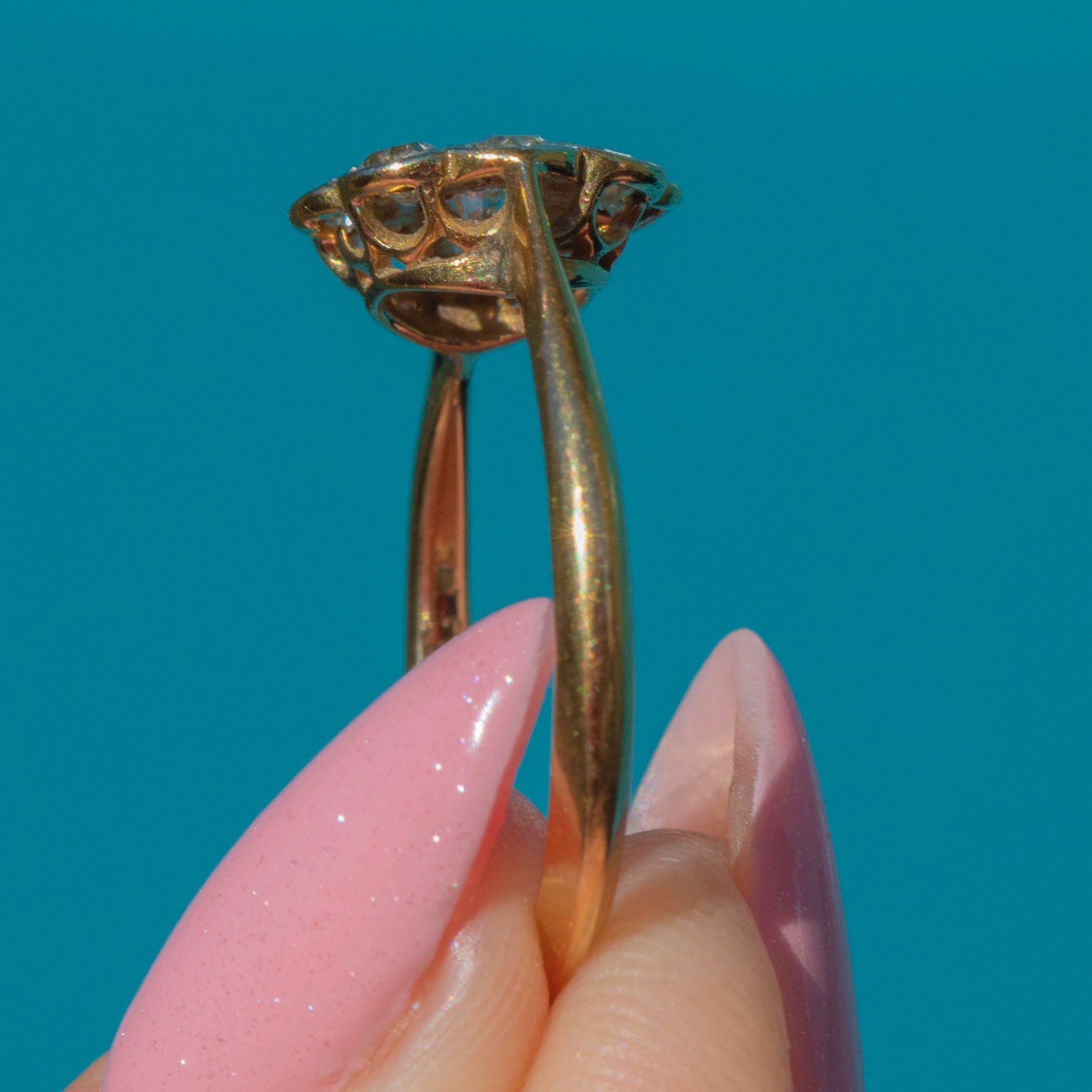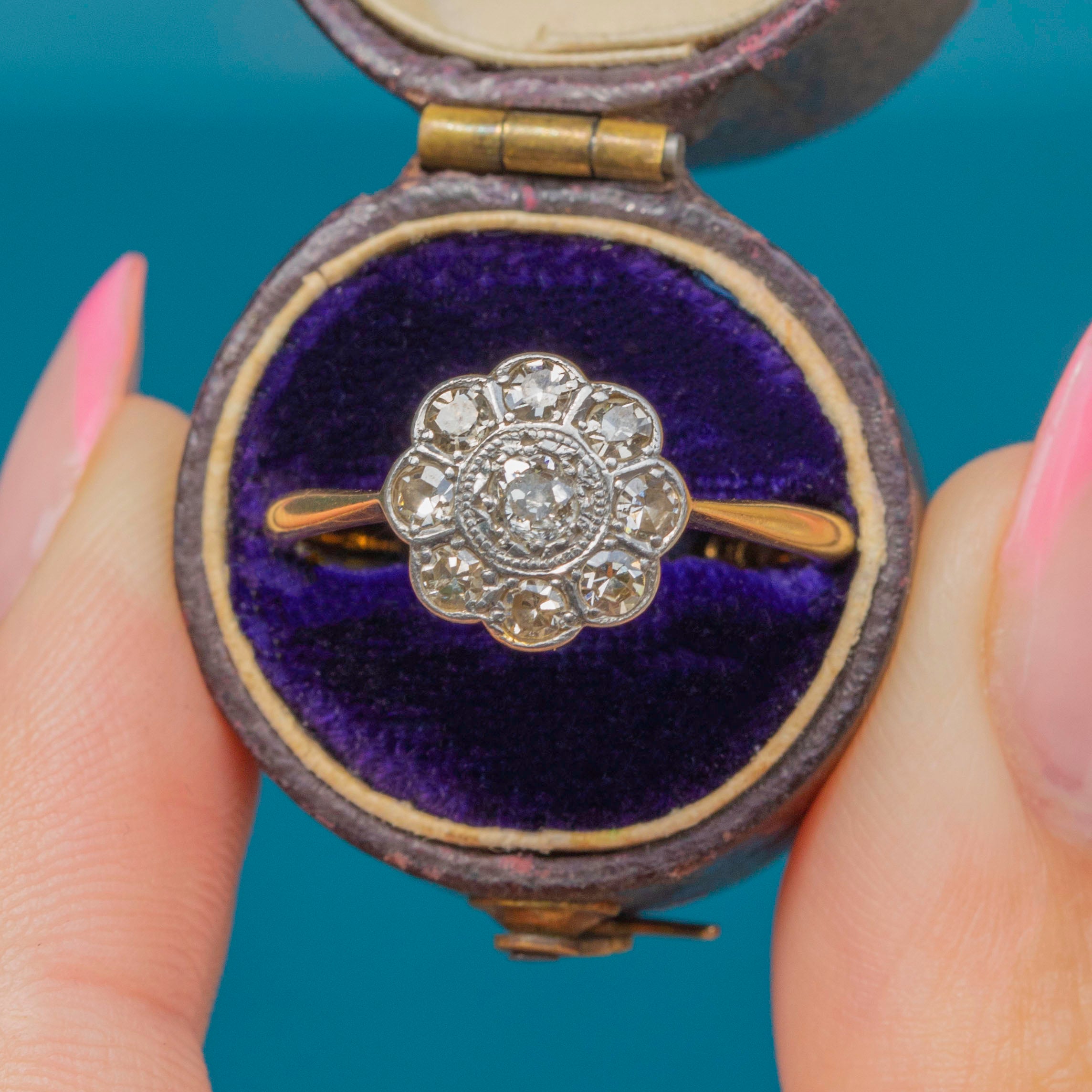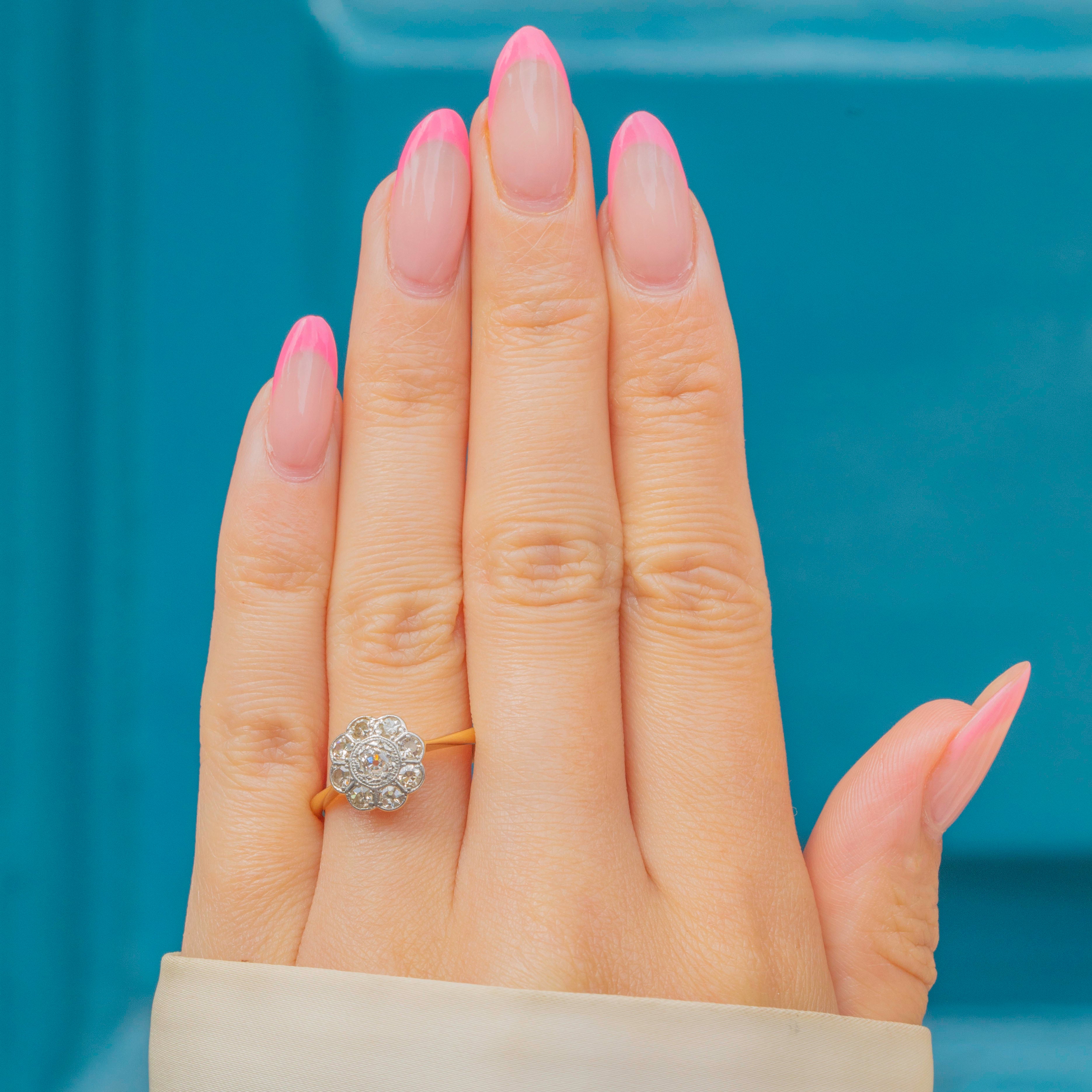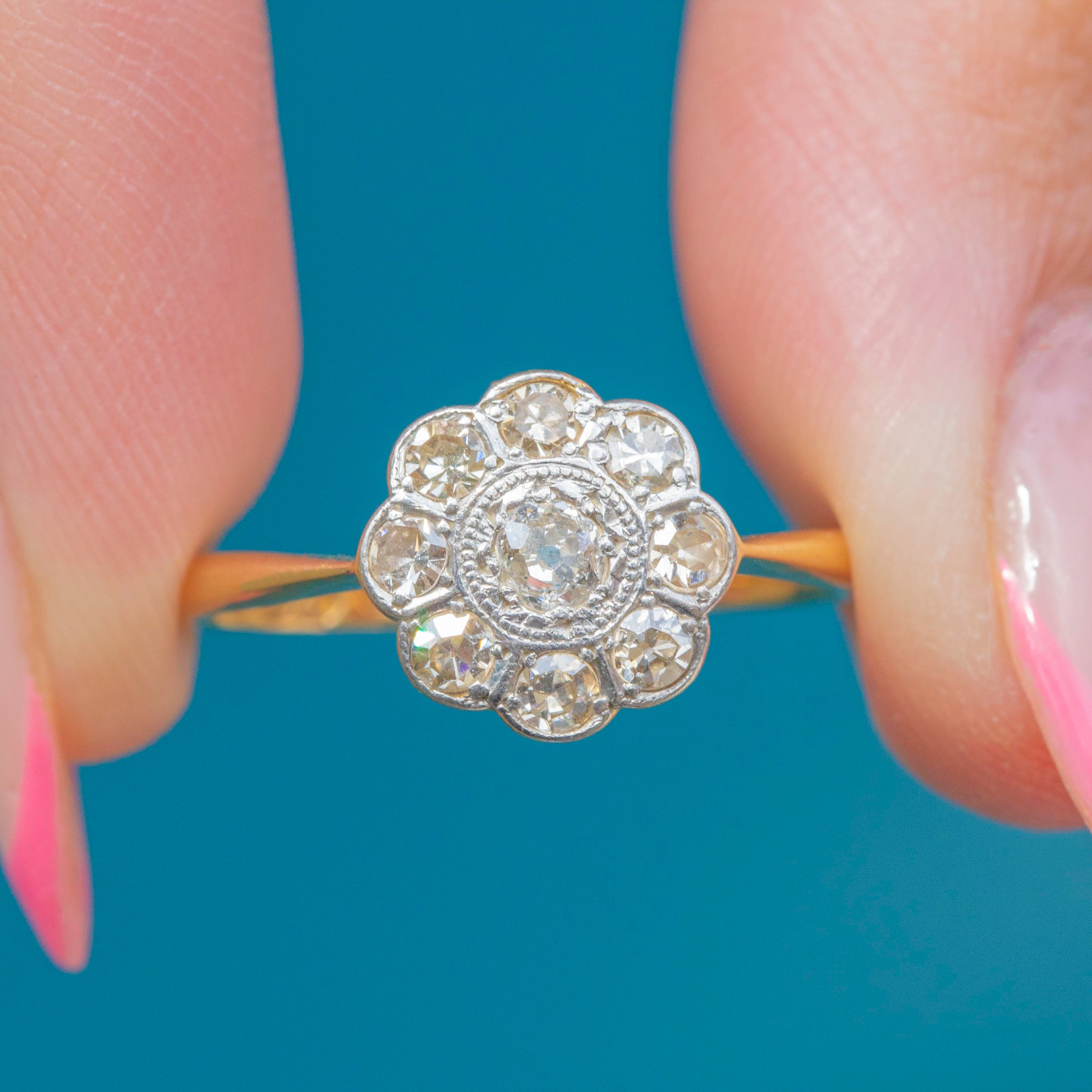 This is a gorgeous Art Deco 18ct Gold Diamond daisy cluster ring! This Art Deco delight has been crafted from solid 18ct yellow Gold and showcases a feminine daisy cluster of Diamonds set in Platinum.