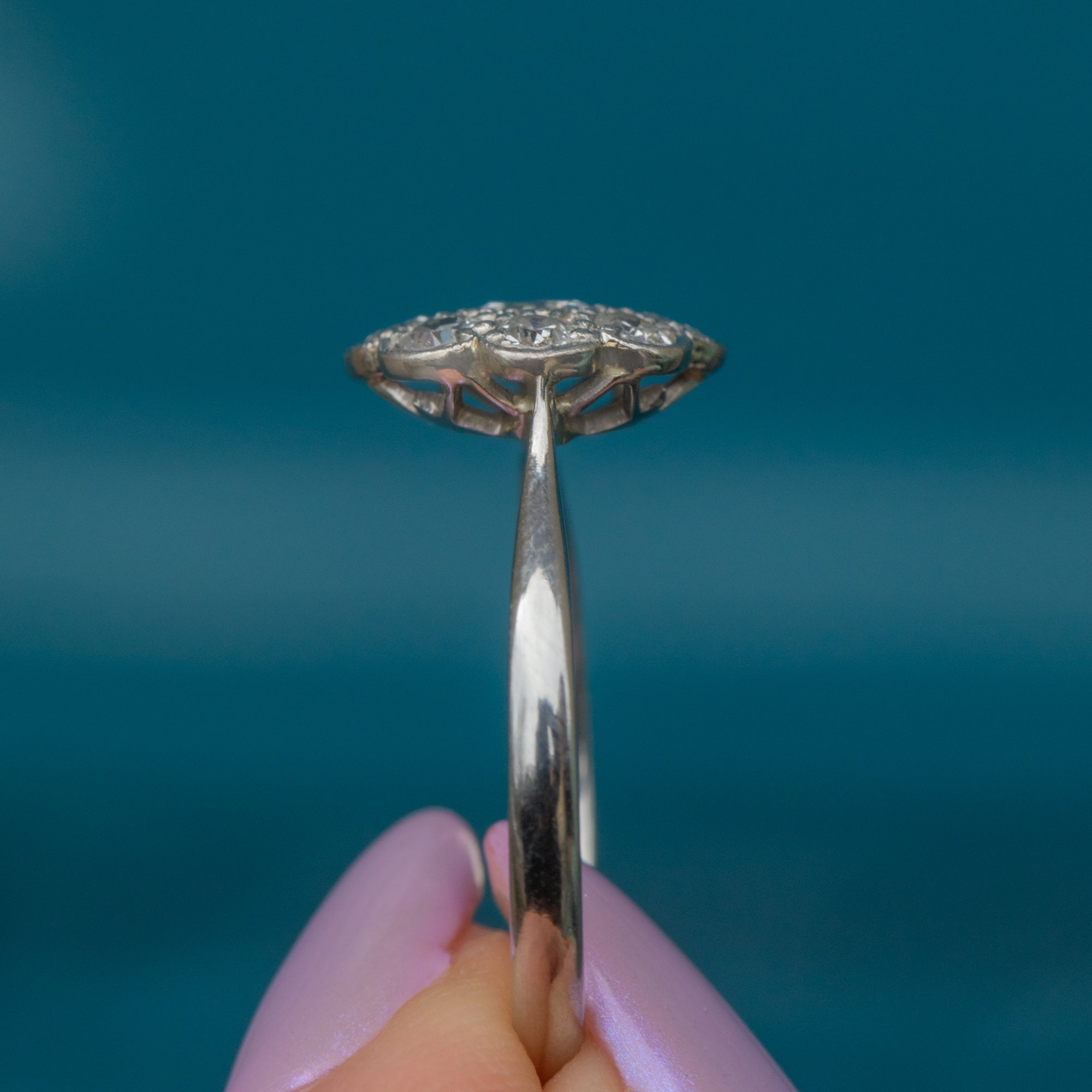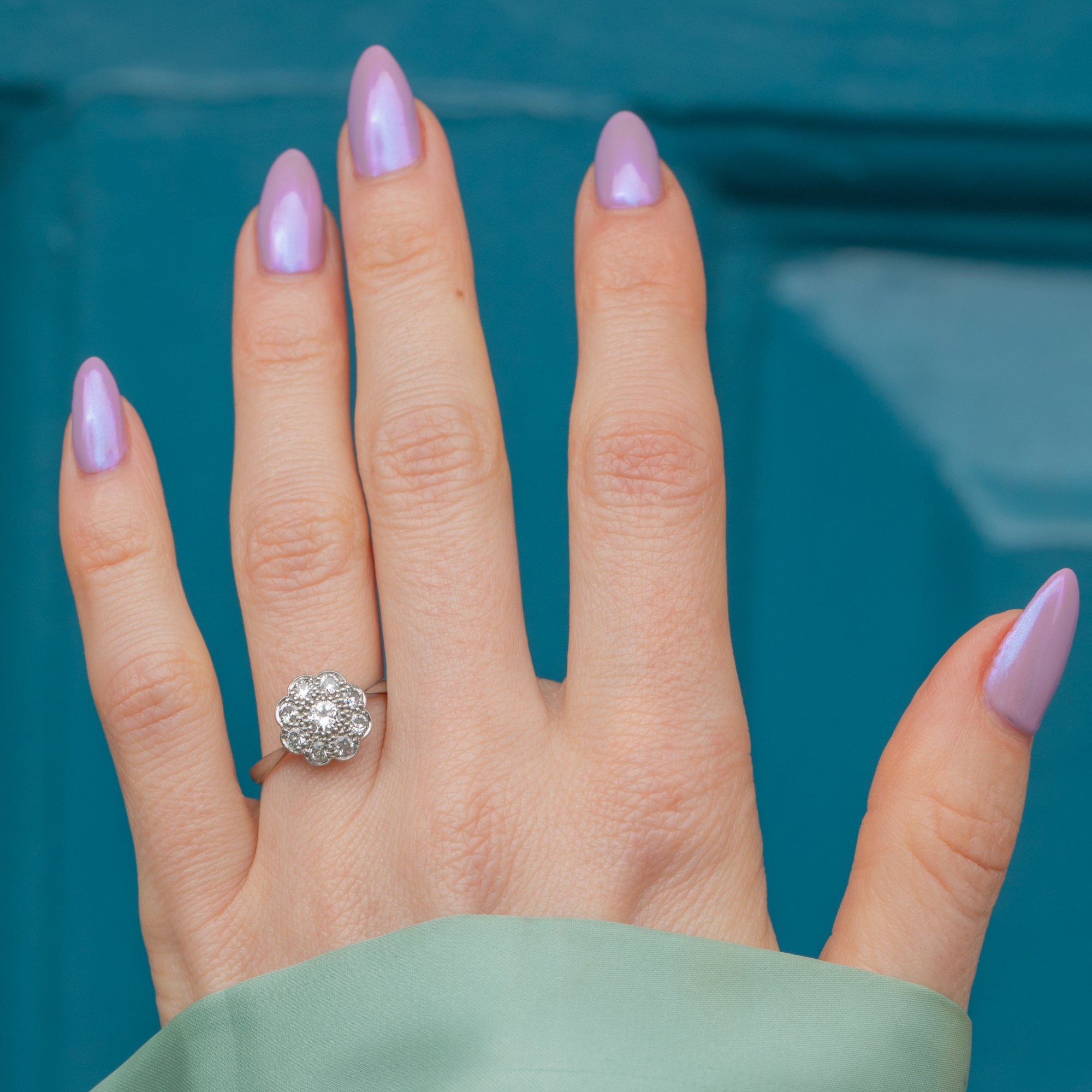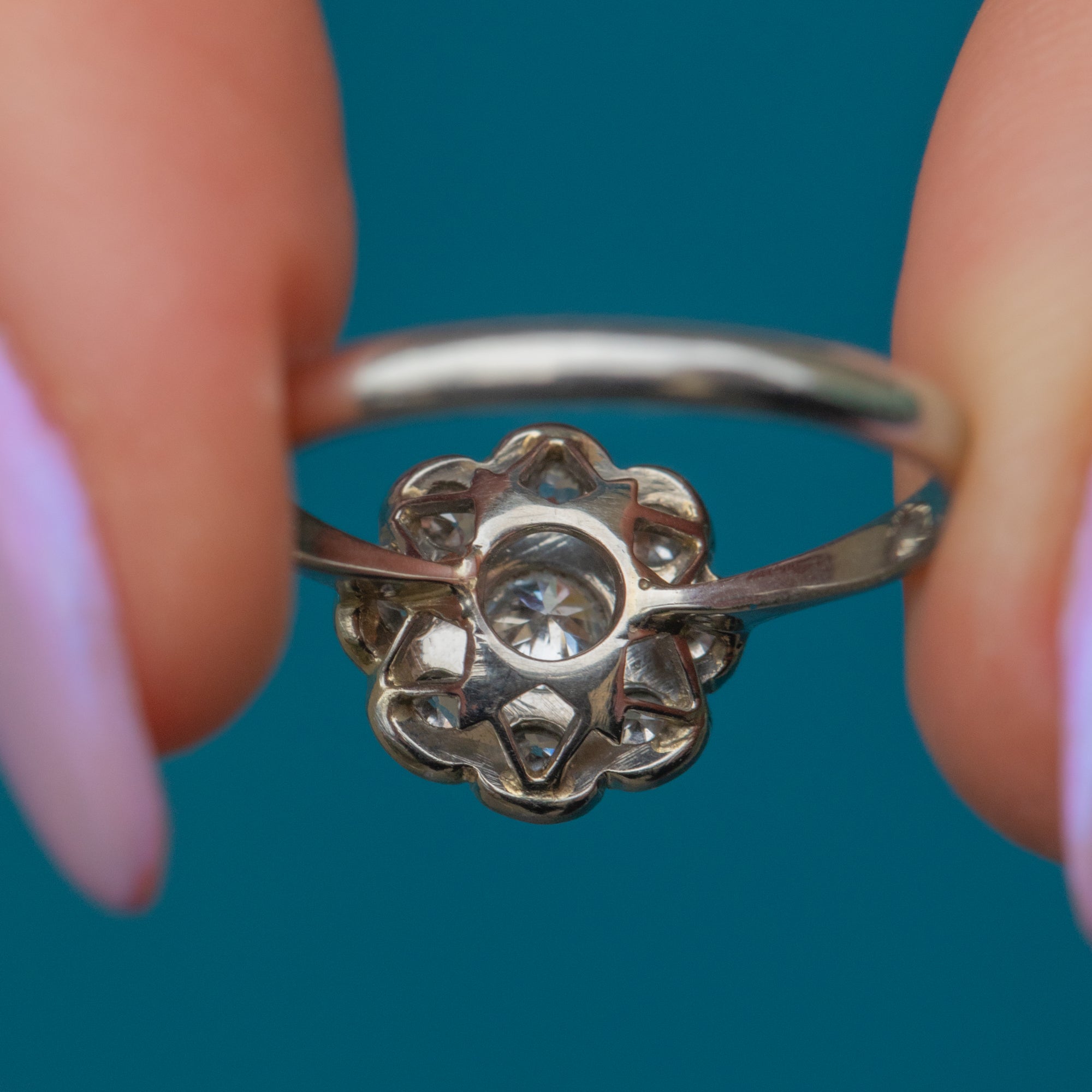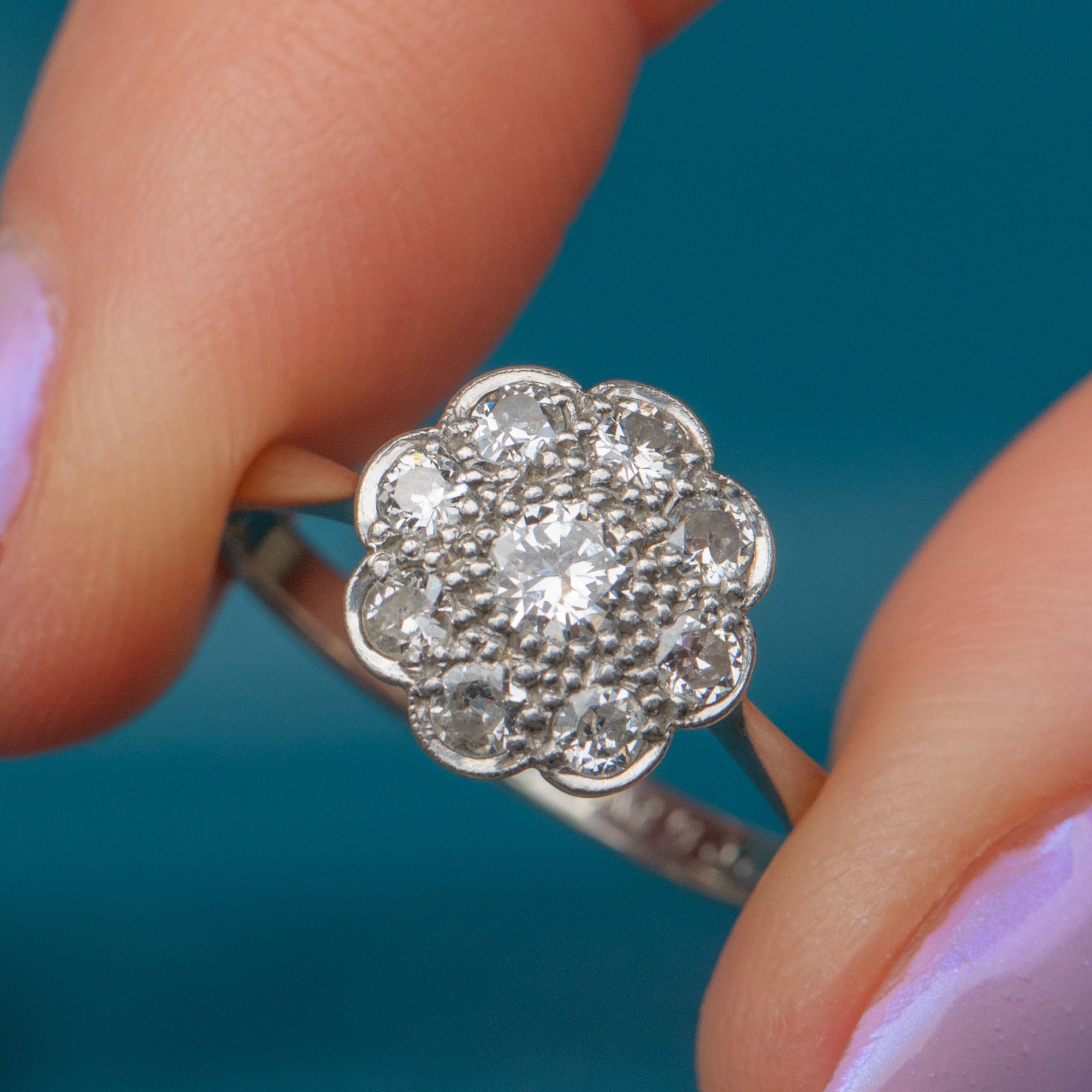 A gorgeous Art Deco 18ct Gold Diamond daisy cluster ring! This Art Deco delight has been crafted from solid 18ct White Gold and showcases a feminine daisy cluster of Diamonds set in Platinum.