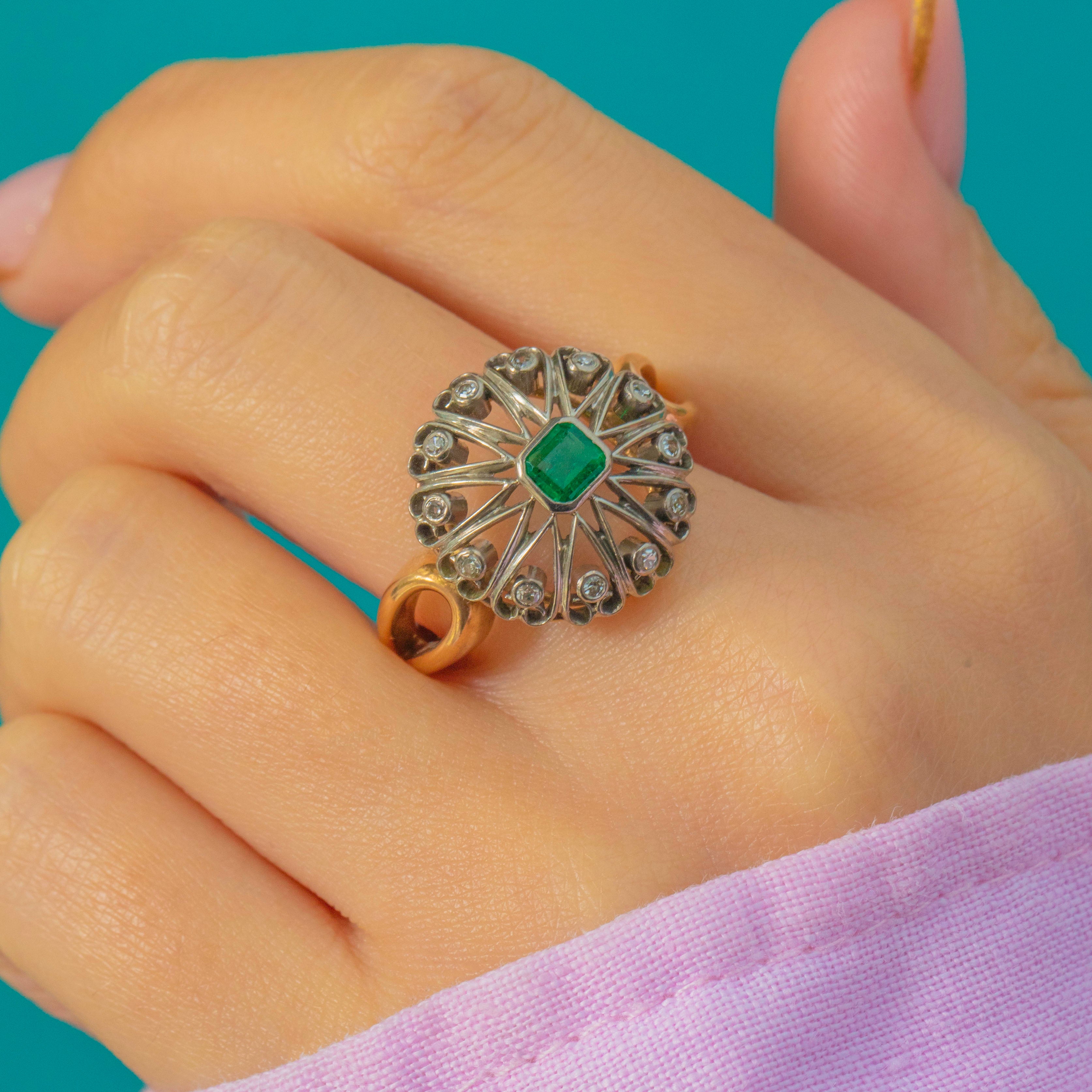 Art Deco 18ct Gold Emerald Diamond Star Cluster Ring