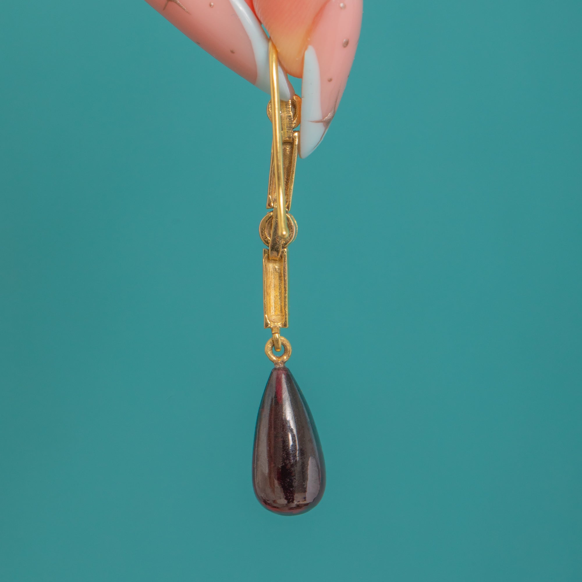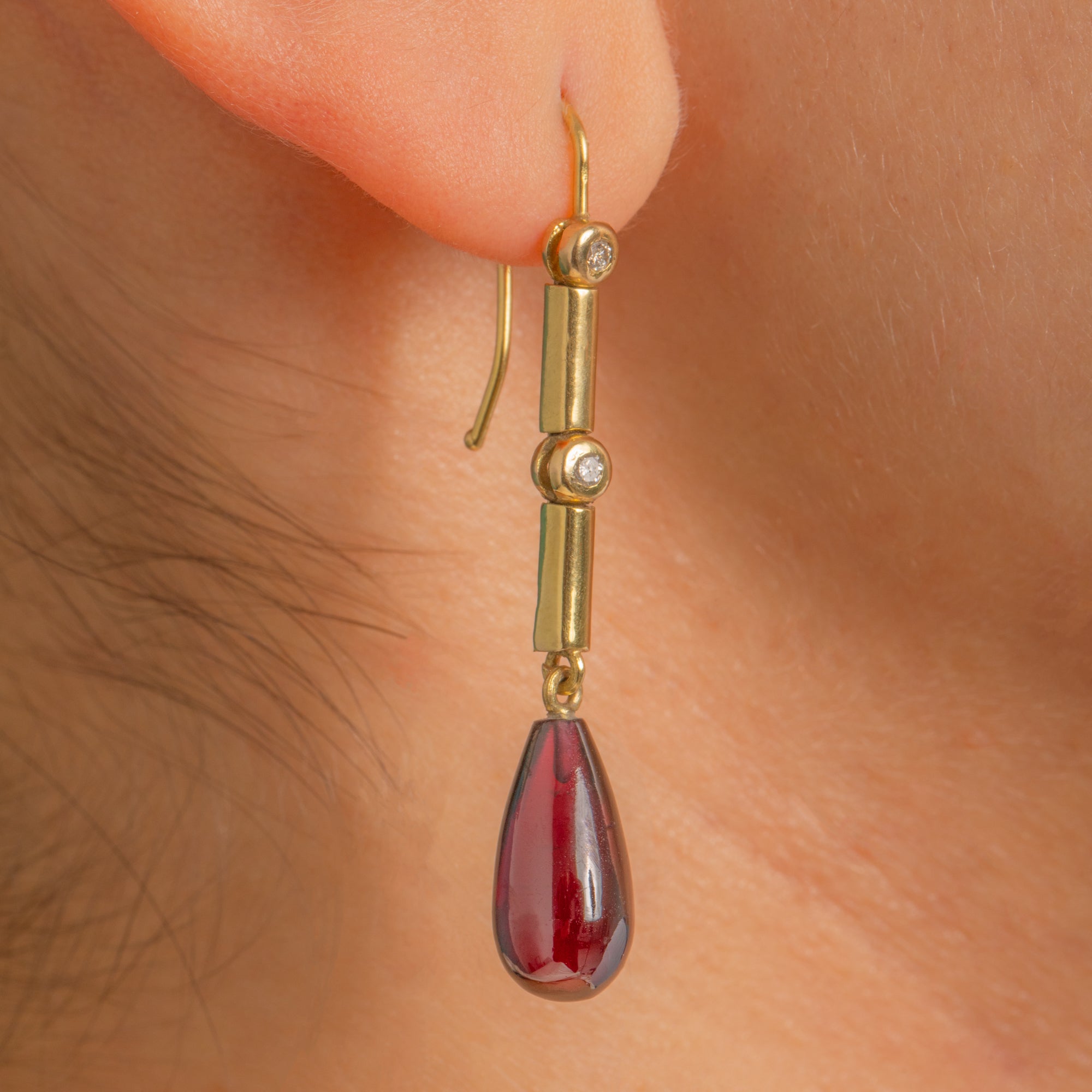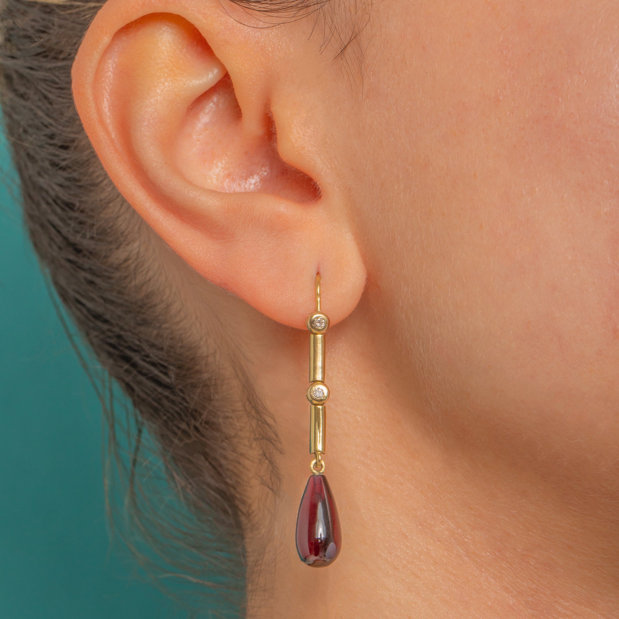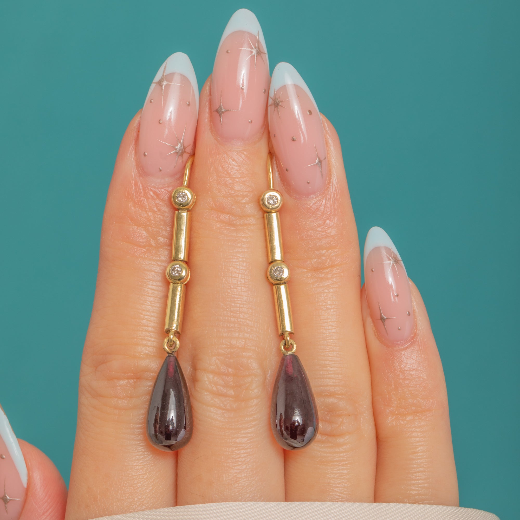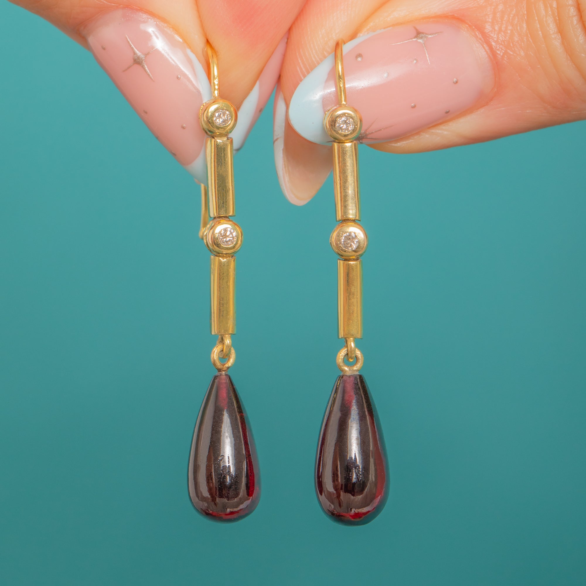 Sleek, elegant and effortlessly glamorous, these Art Deco drop earrings pair rich wine-red Garnet cabochons with the warm glow of 18ct Gold. Slender tubular batons are punctuated by petite bezel-set Diamonds, drawing the eye down to glossy teardrop Garnets that sway with beautiful fluidity.