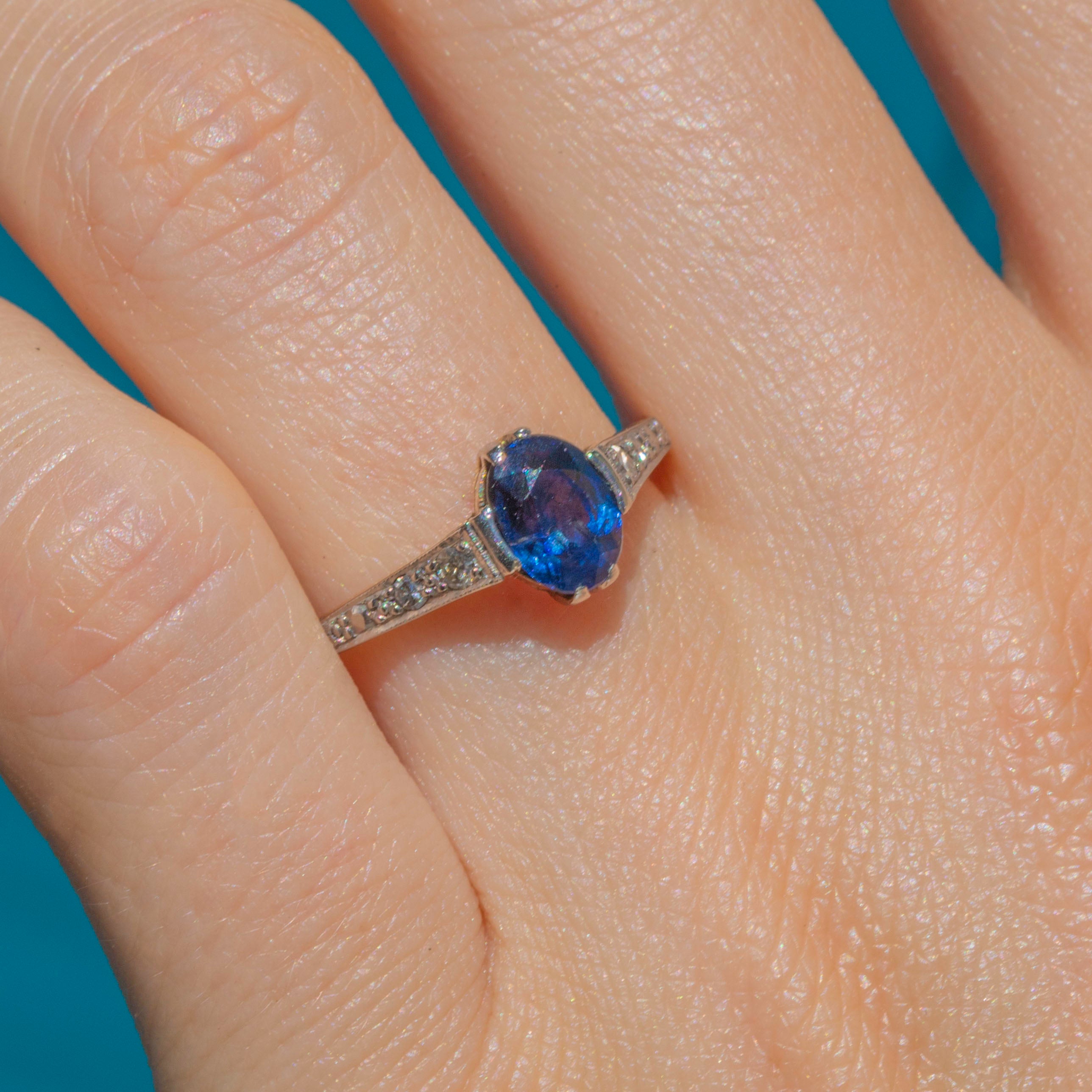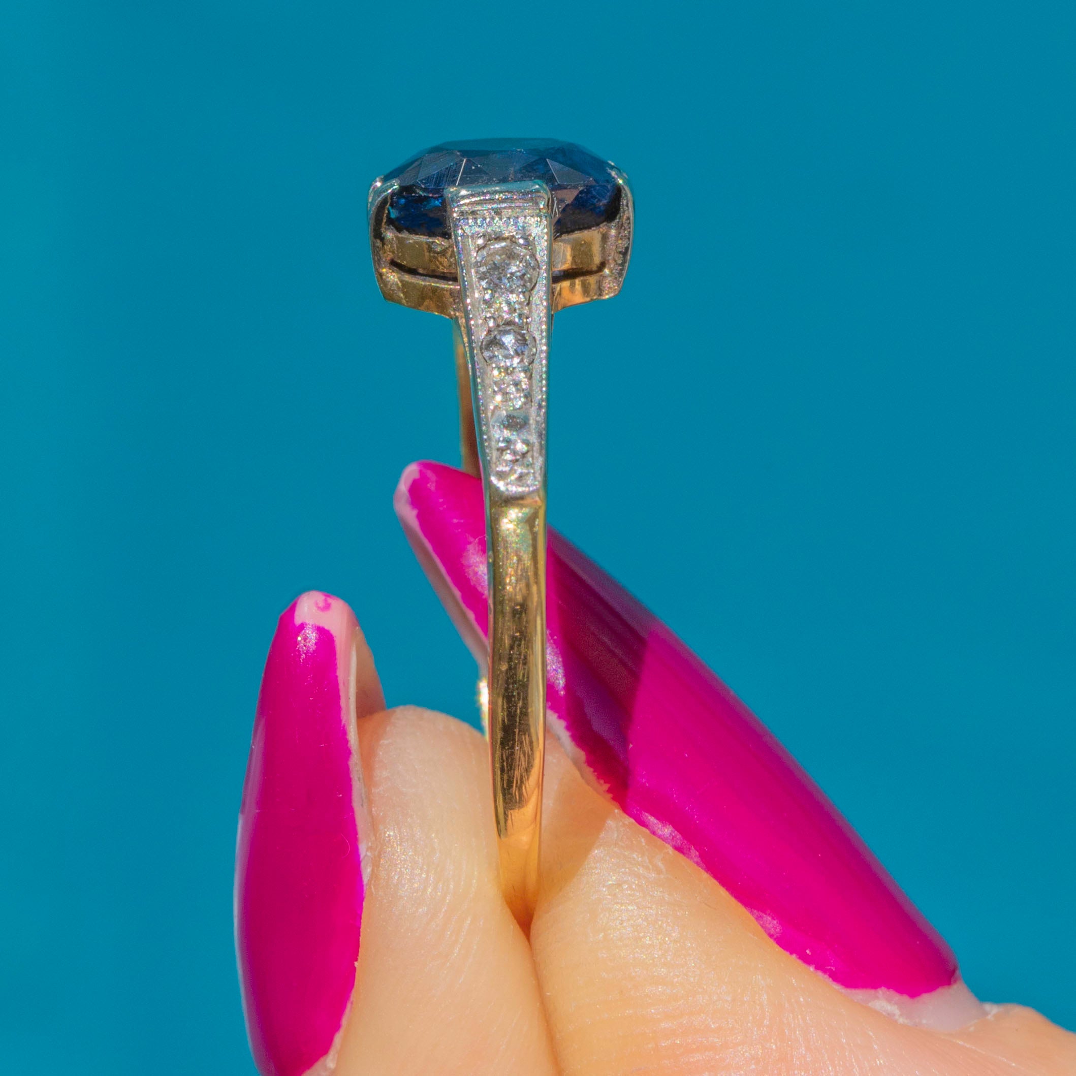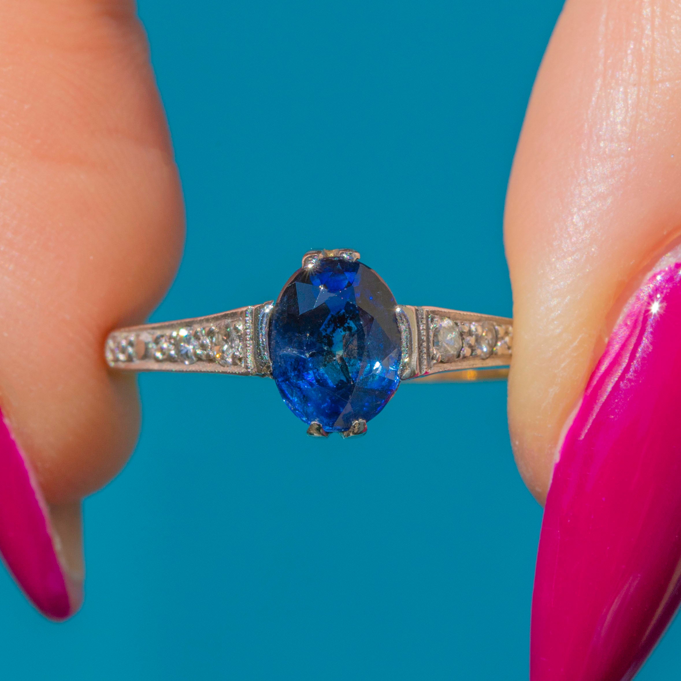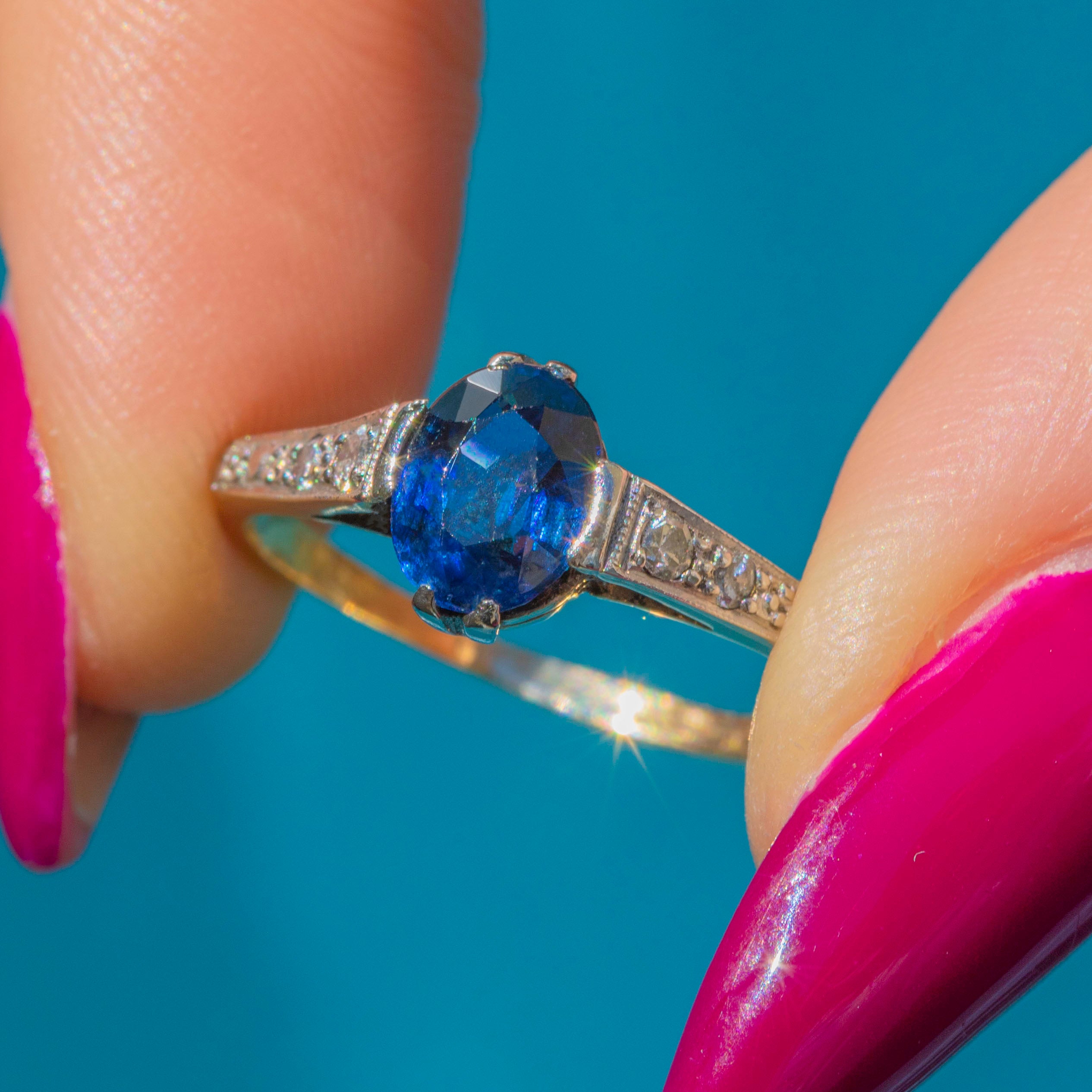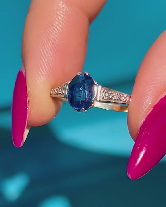 Art Deco 18ct Gold Natural Sapphire Ring with Diamond Shoulders
