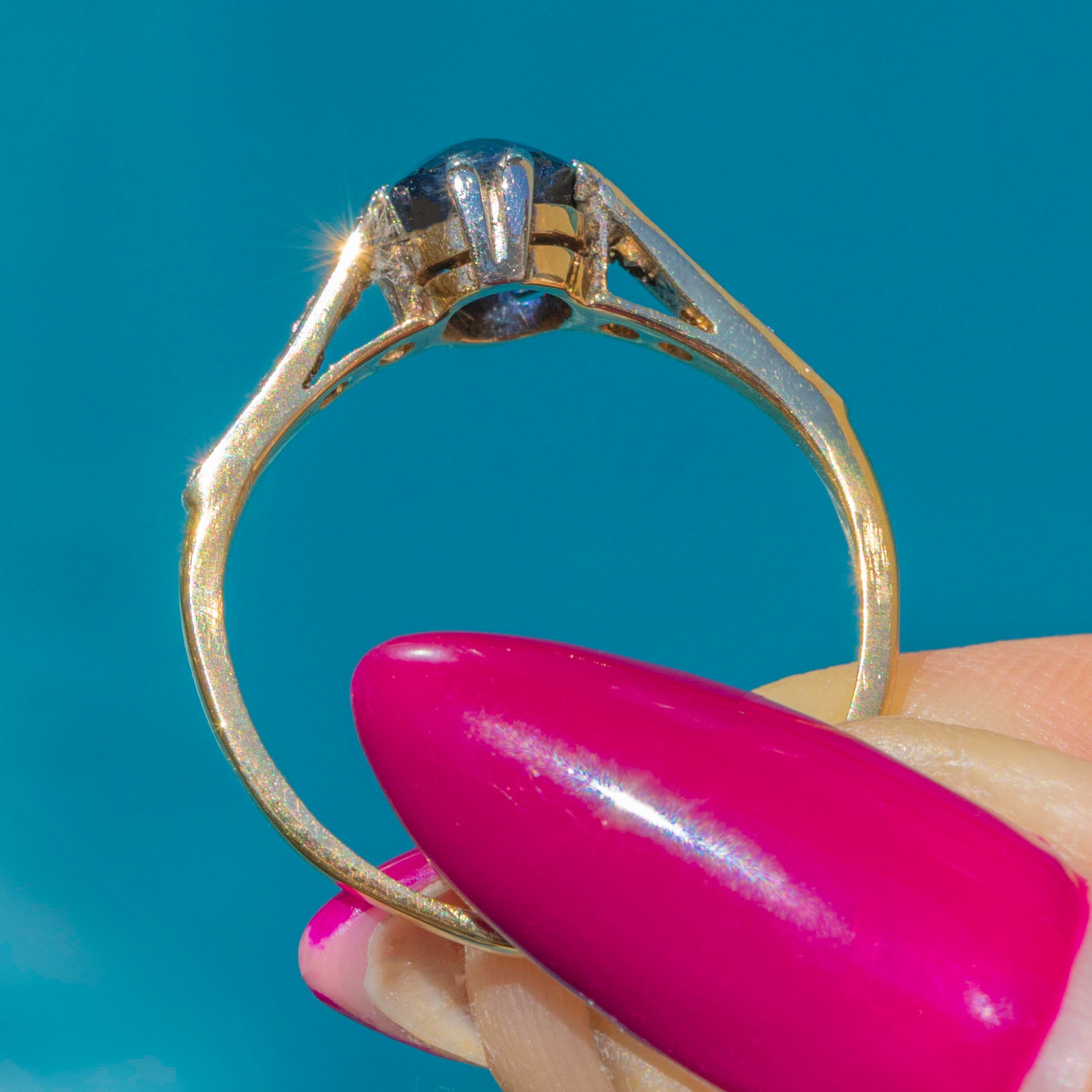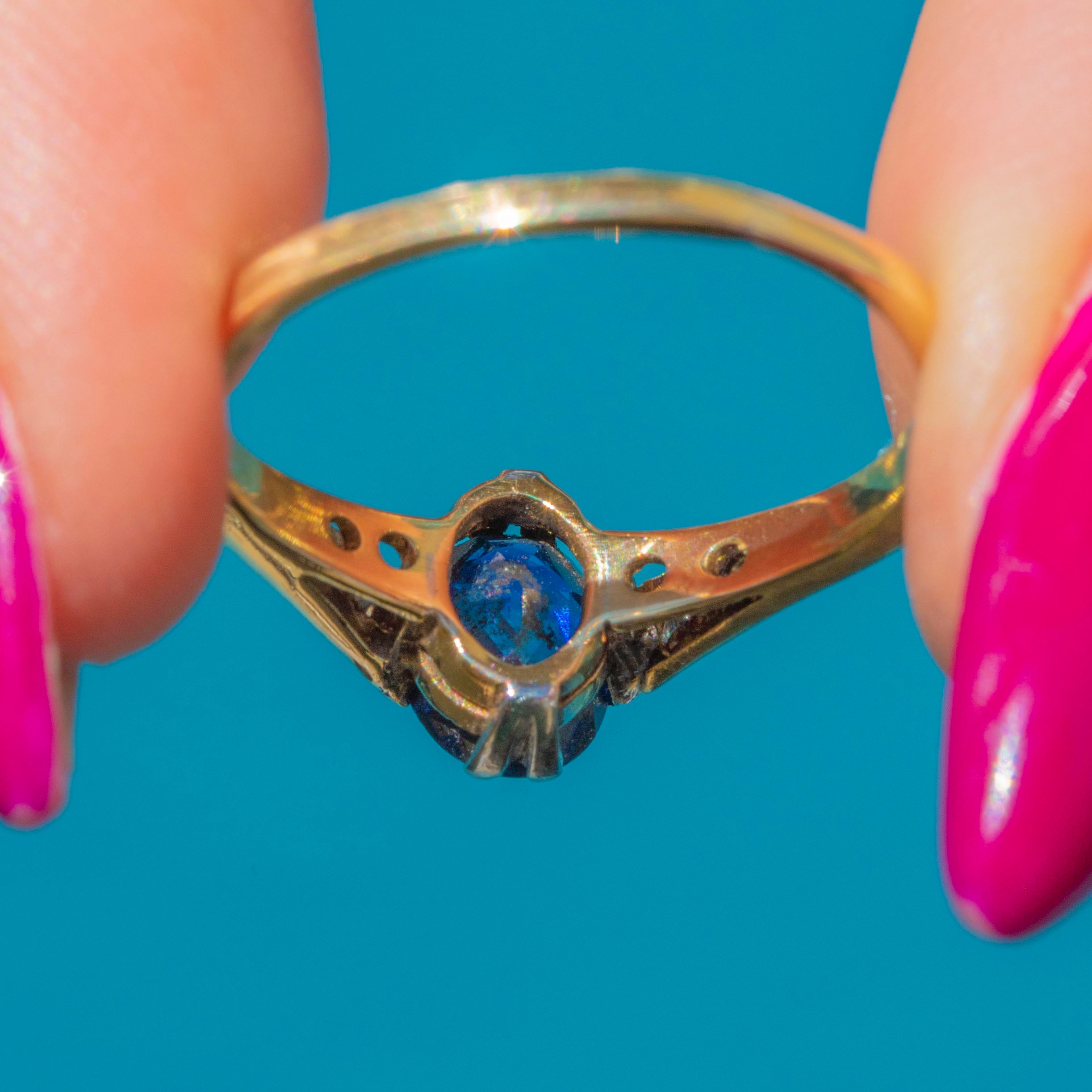 Complete with a buttery yellow Gold band, this antique Sapphire ring is a gorgeous sophisticated piece and would make a wonderful choice for an engagement ring!