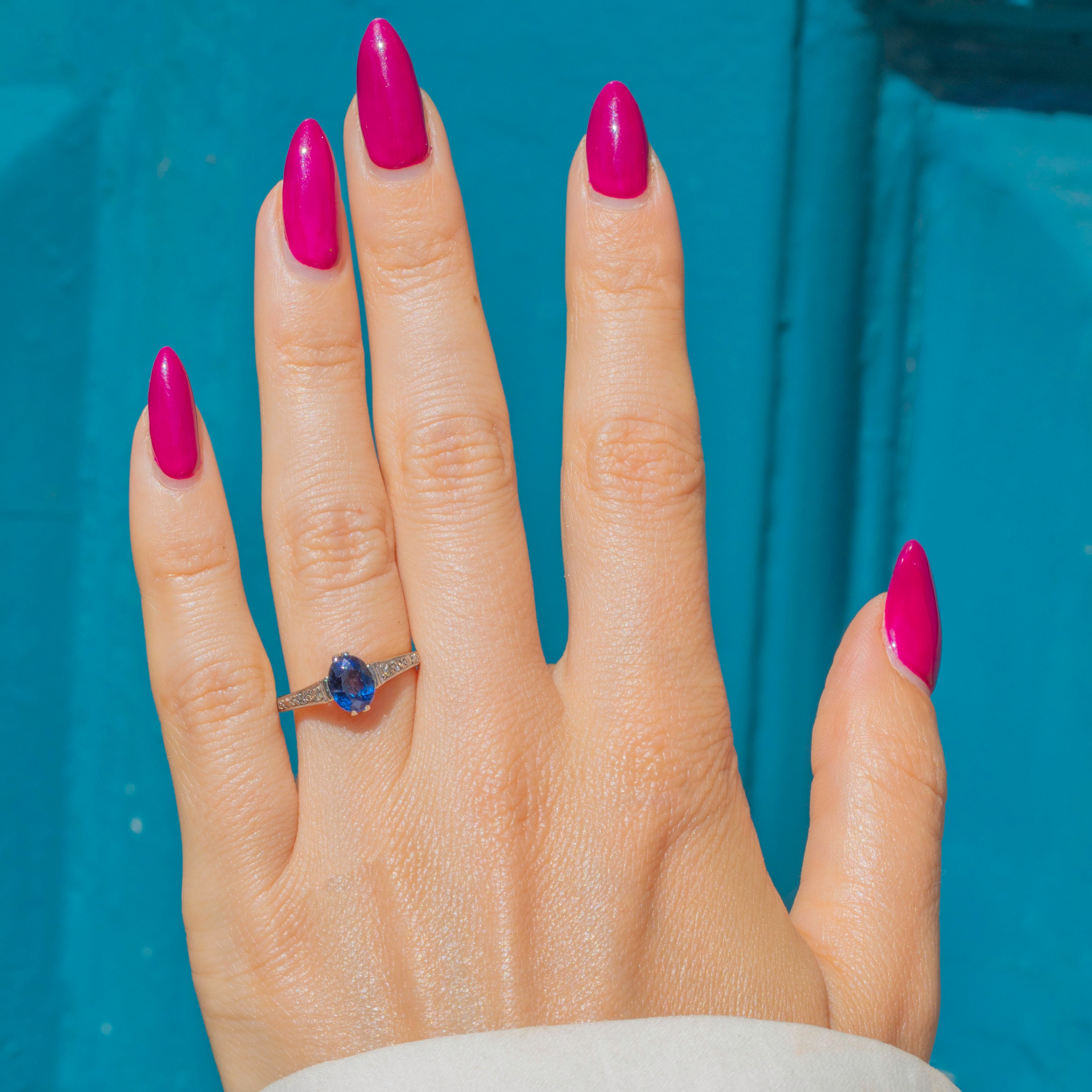 In the centre of this Art Deco ring sits a radiant 0.60ct Sapphire, faceted wonderfully to reveal deep navy and cerulean hues as she catches the light. It is adorned by Diamond shoulders, set within crisp 18ct white Gold illusion settings.