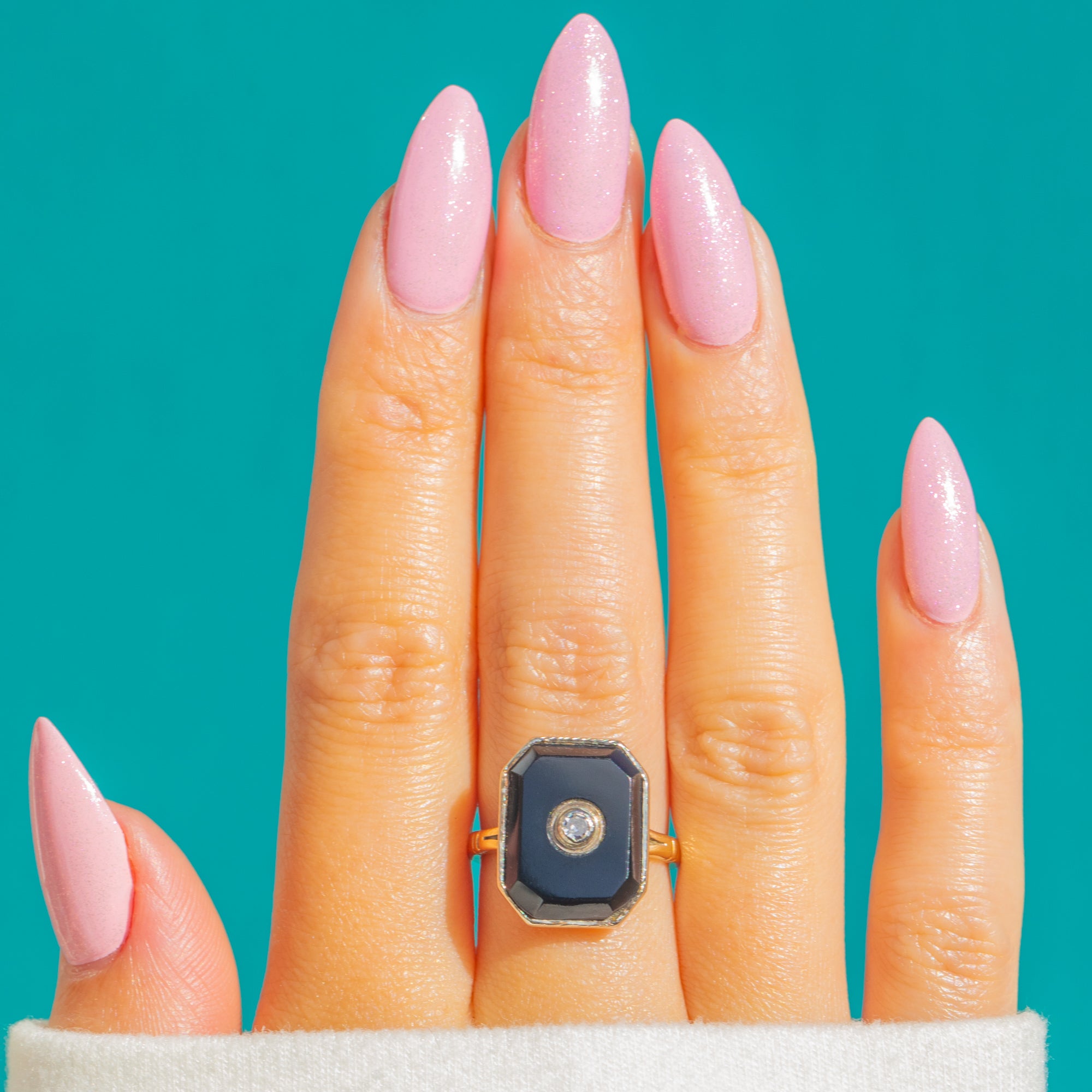 A sleek Art Deco Onyx panel ring with striking architectural poise. The glossy rectangular Onyx is framed in a raised bezel and punctuated by a single bright bezel-set Diamond at the centre for crisp contrast. The stepped shoulders and clean geometry create a bold signet-cocktail silhouette that feels both refined and confidently modern.
