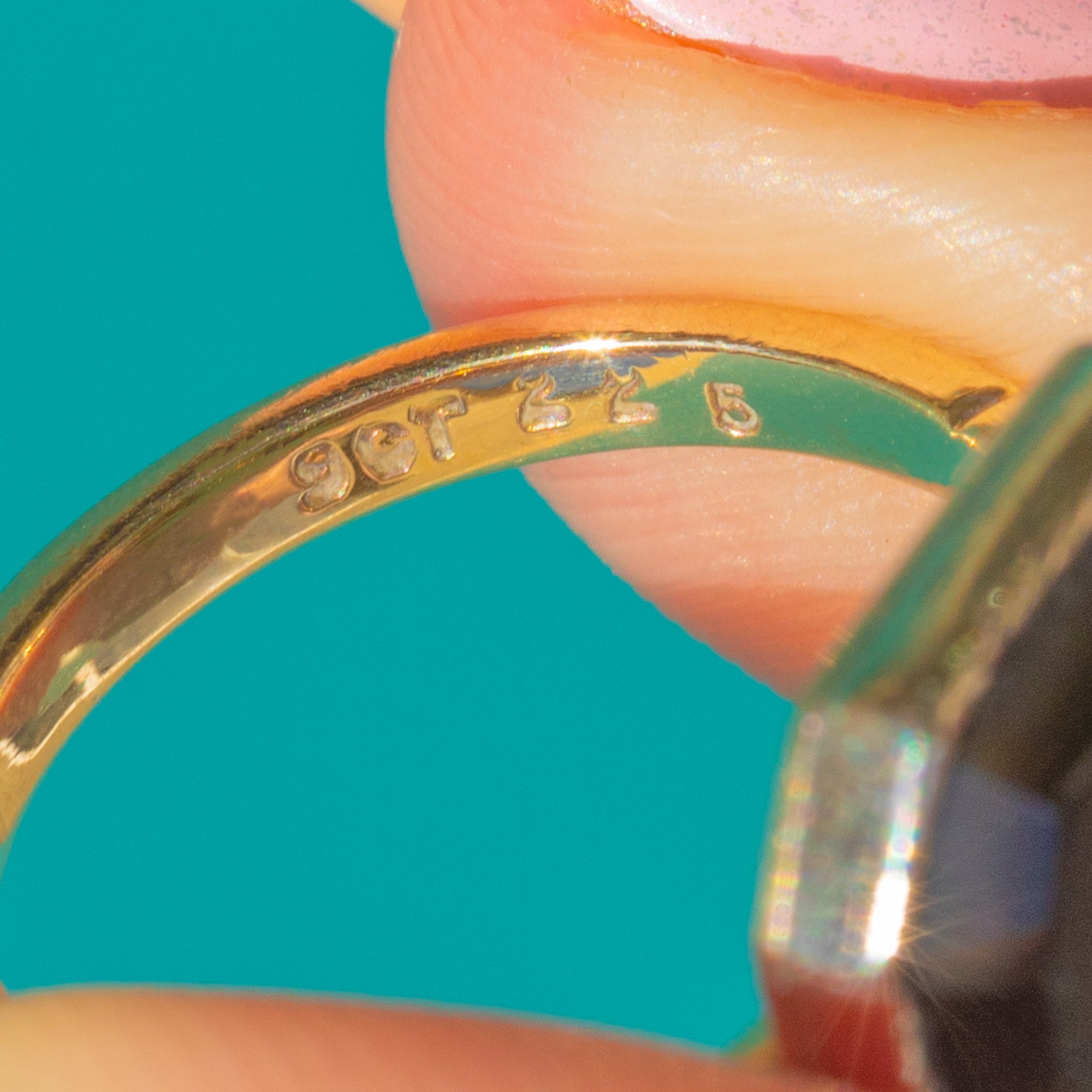 EXCELLENT: The Onyx shows some tiny surface abrasions and a fine hairline scratch in keeping with age; the Diamond is bright and secure. The Gold shank is smooth and robust, with light surface wear and minor polishing marks consistent with careful wear. No visible resizing or repairs.