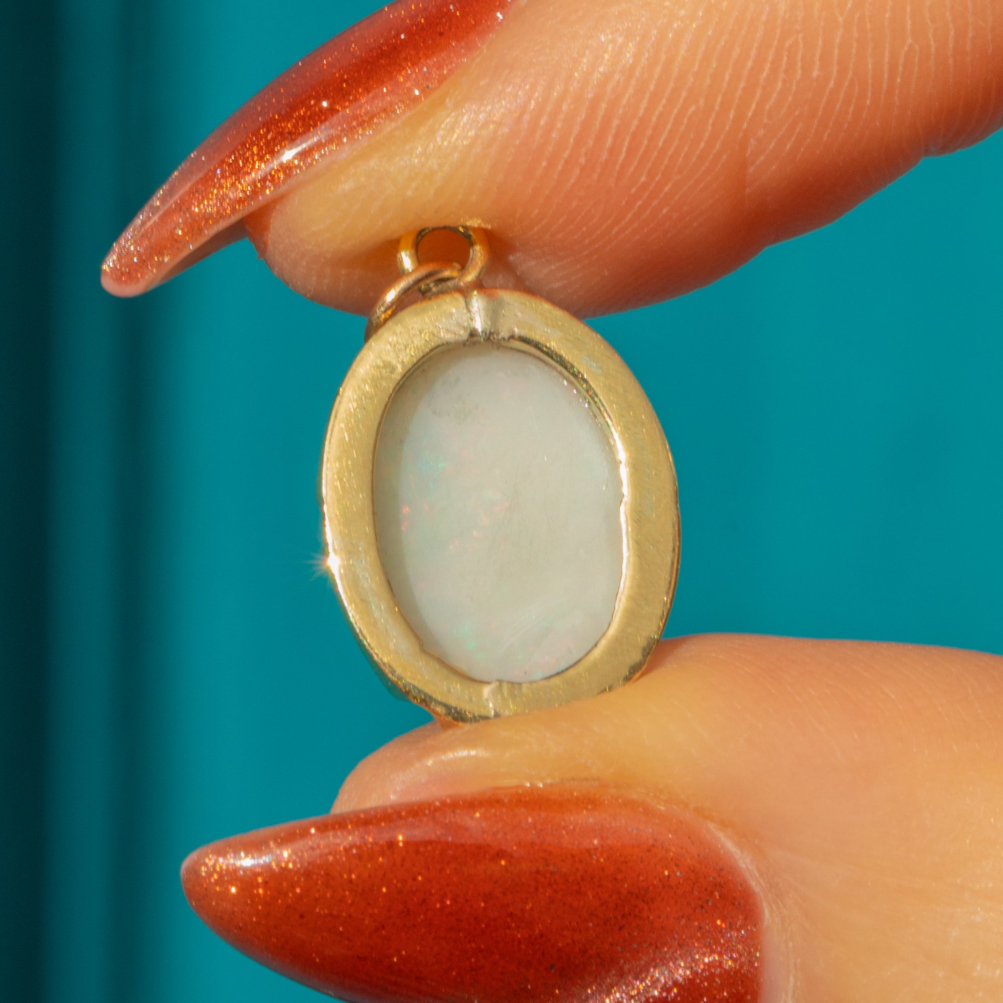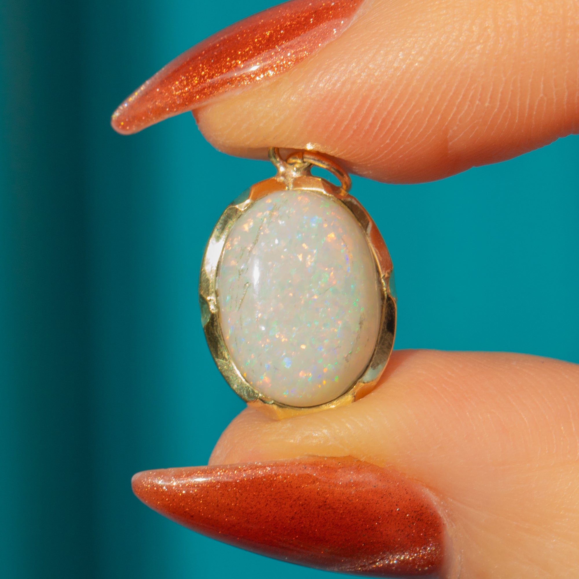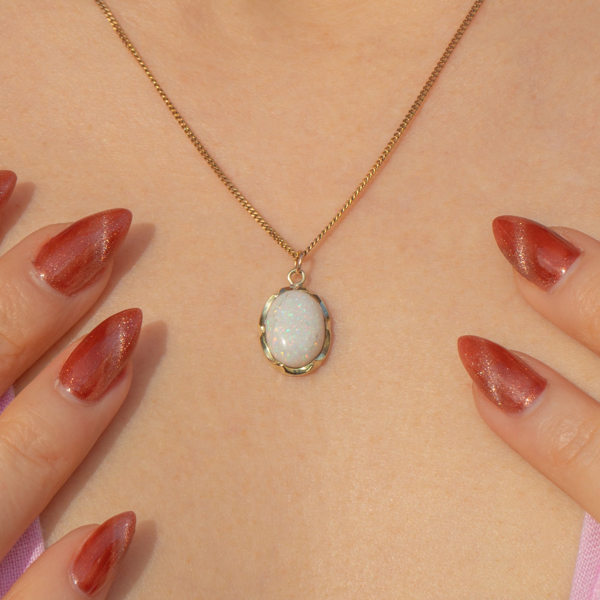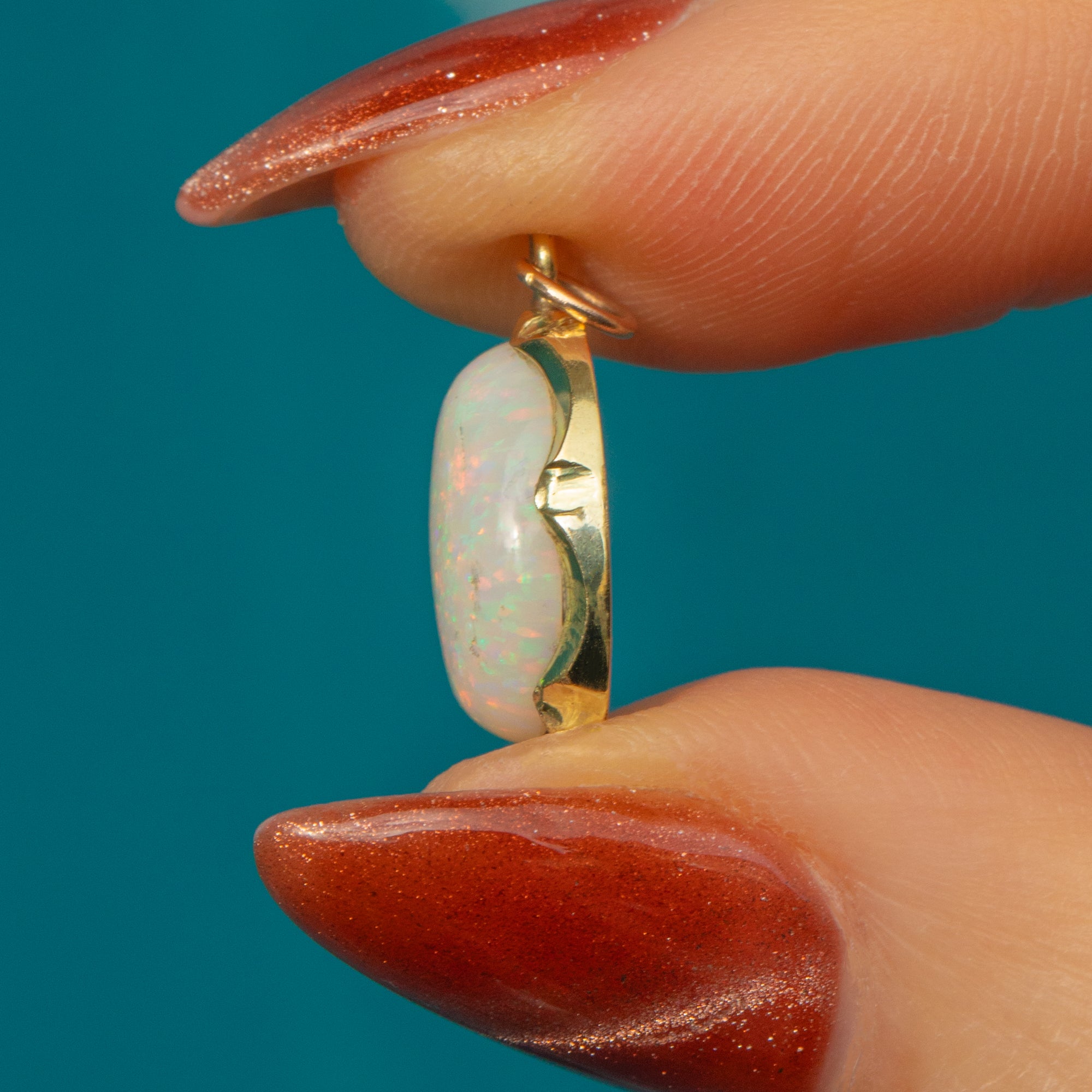 This Art Deco 18ct Gold Opal cabochon charm is a gorgeous dainty treasure! The 2.24ct Opal reveals speckles of neon ornage, yellow and green, displayed with buttery 18ct Gold with a scalloped edge that catches the light magnificently.
