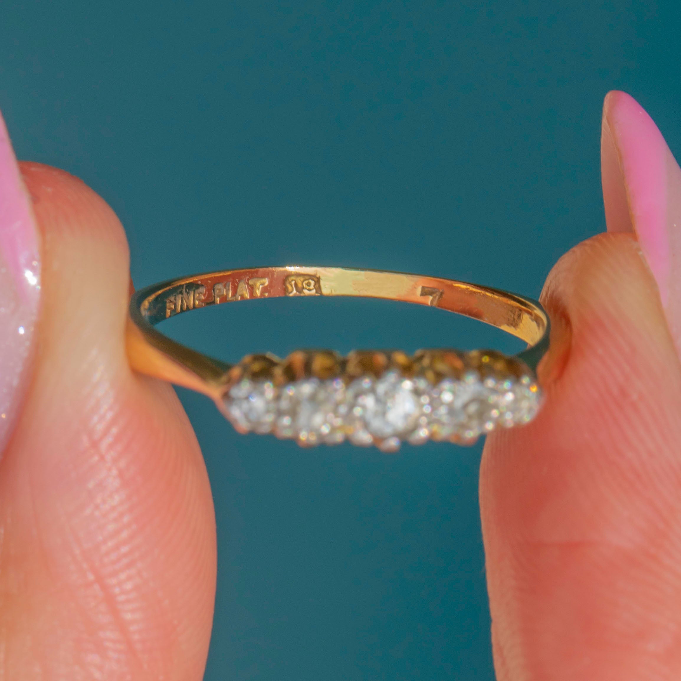A classic Art Deco five-stone Diamond ring set in Platinum with a buttery 18ct Gold band. The bright, well-matched Diamonds are claw-set across the finger, their sparkle beautifully complemented by the warm yellow Gold band.