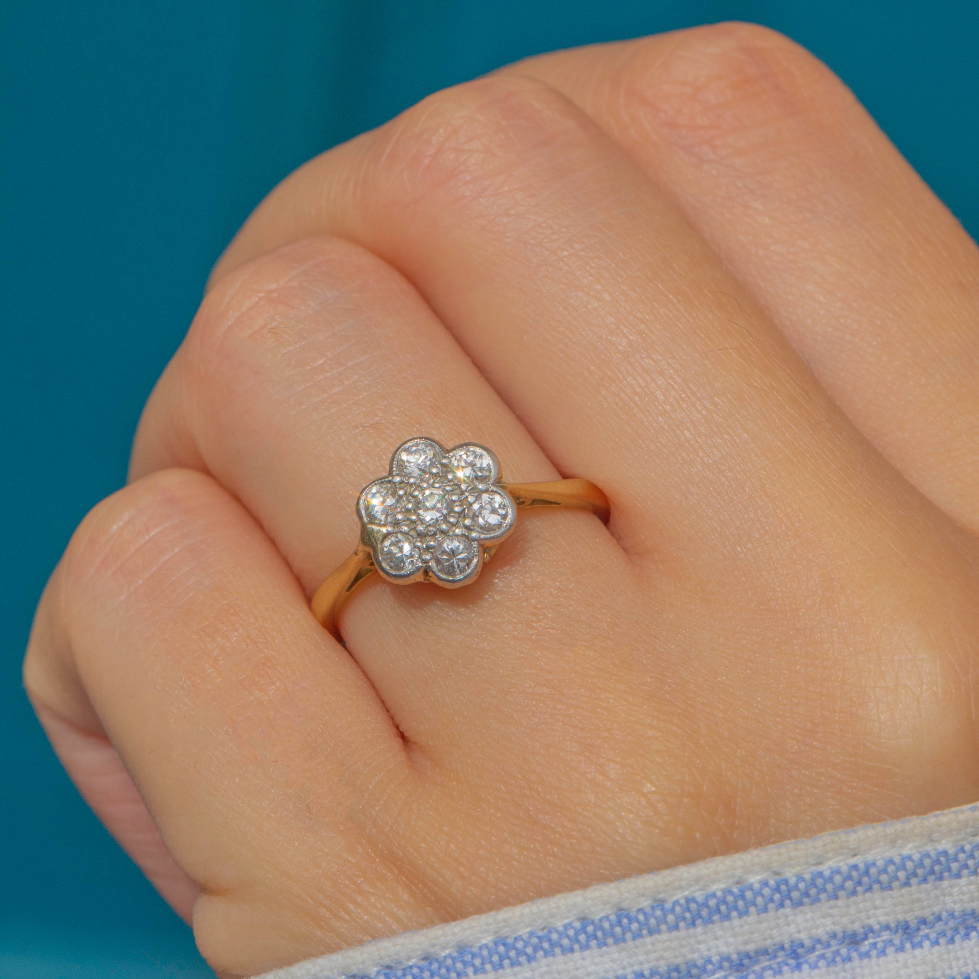 A charming Art Deco Diamond flower cluster ring in 18ct Gold and Platinum, c.1920. The ring features seven natural Diamonds set in a delicate flower-shaped cluster, with each Diamond nestled in a Platinum bezel. Together, they create a soft sparkle and a timelessly romantic motif that has been loved for generations.
