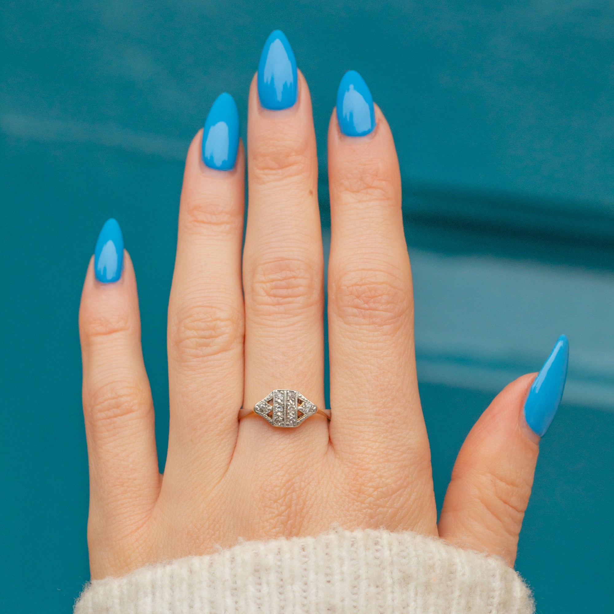 Plucked from the most glamorous era, this Art Deco 18ct Gold & Platinum Diamond lozenge cluster ring would make a fabulous choice for a unique engagement ring! The bold, geometric lines perfectly capture the aesthetic of Deco design, creating an undeniably striking piece.