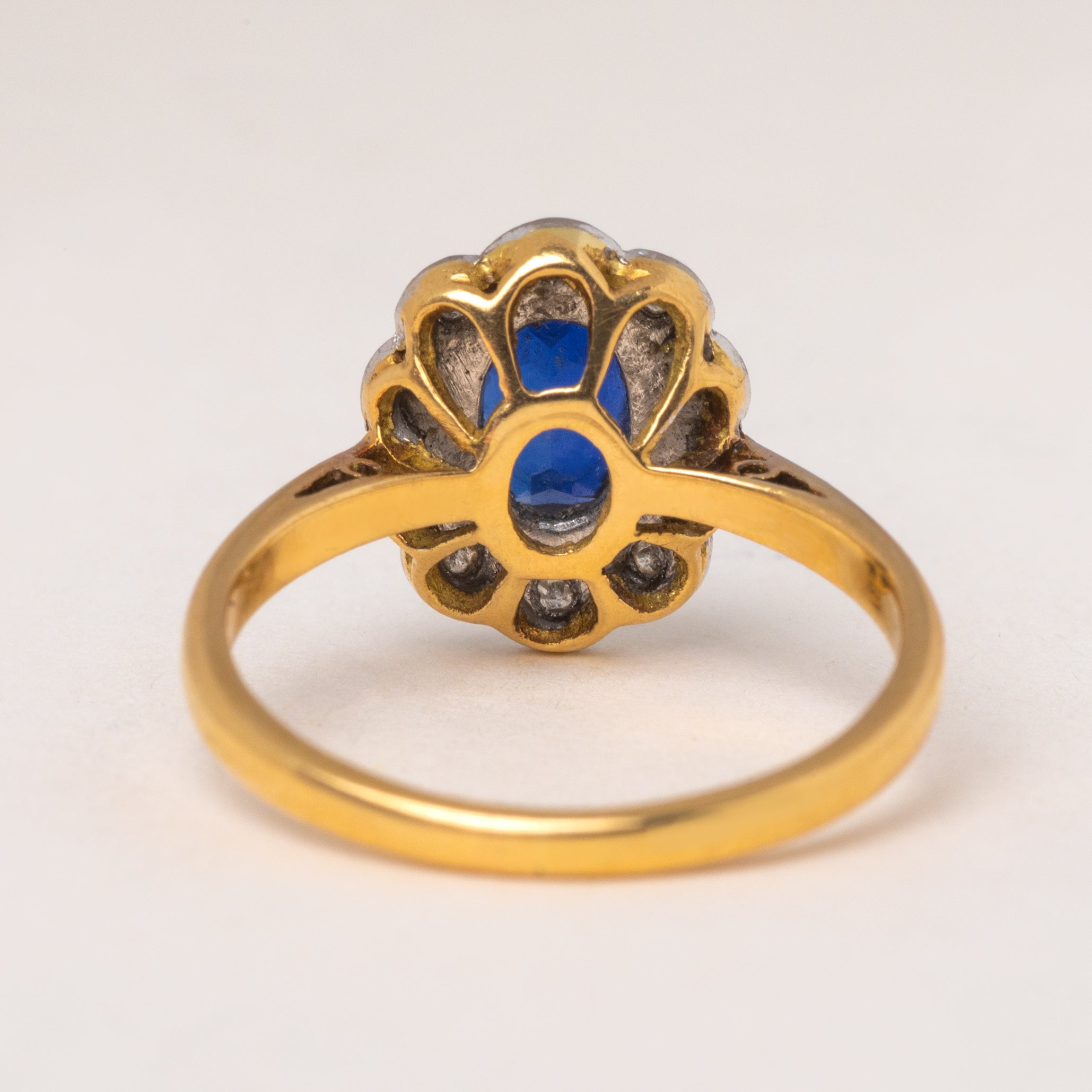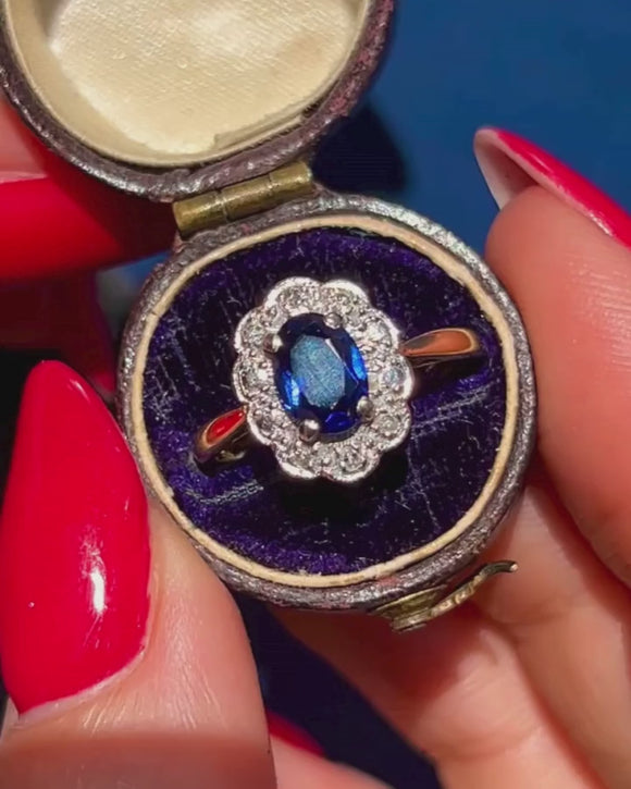 EXCELLENT. This Art Deco 18ct Gold Sapphire Diamond cluster ring is in wonderful condition throughout. The 0.65ct Sapphire is secure in its setting and free of any wear and the Diamonds are sparkly and sit beautifully within 18ct White Gold. The band has retained its form well allowing you to wear her confidently. With proper care and maintenance, this exquisite Edwardian ring will continue to enchant for generations to come!