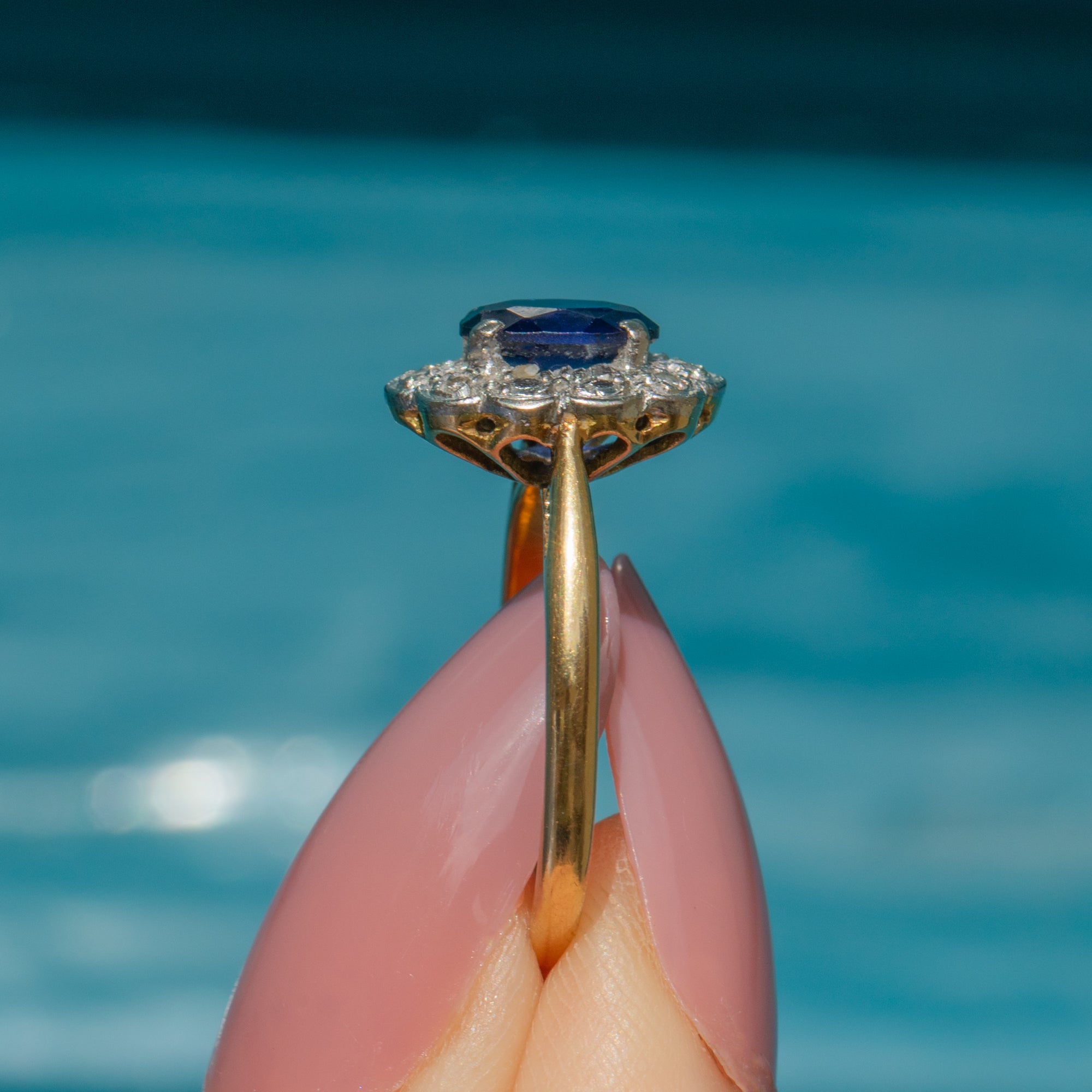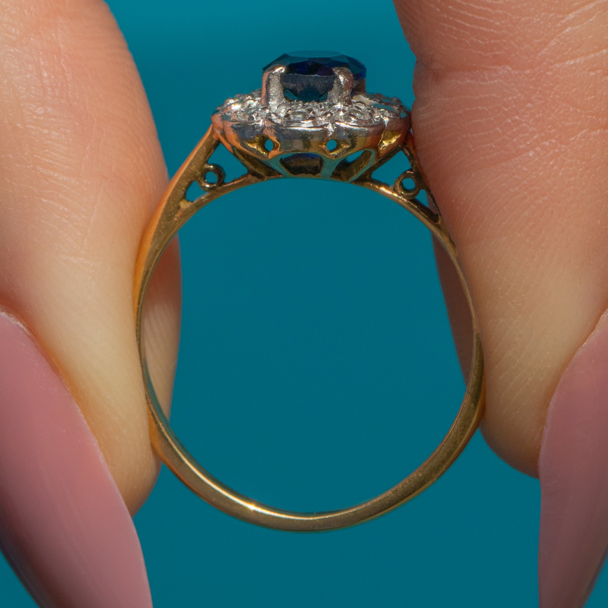 This timeless Art Deco Sapphire Diamond ring has been crafted from buttery 18ct Gold with lustrous white Gold settings; she would make a wonderful choice for a unique antique engagement ring!
