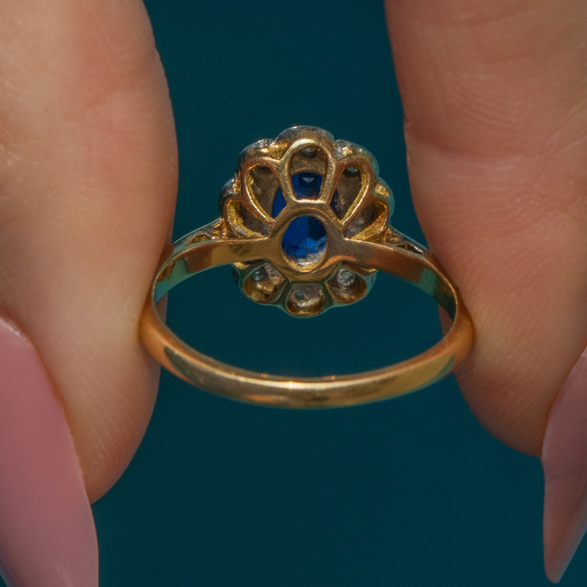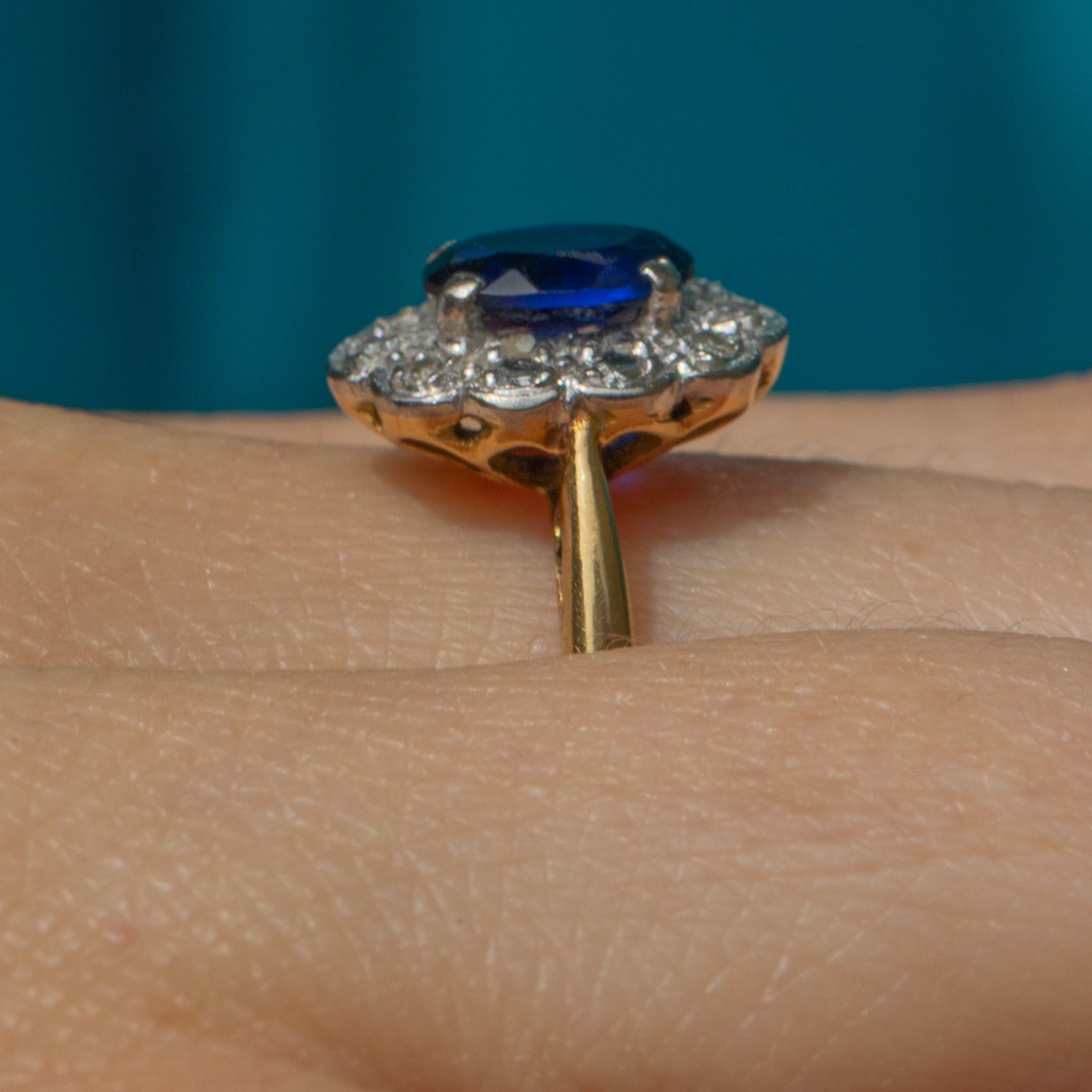 This exquisite Art Deco 18ct Gold Sapphire Diamond cluster ring has been crafted with meticulous attention to detail! The rich velvety hue of the 1.65ct Sapphire is perfectly complemented by six scintillating Diamonds, creating a mesmerising display as they catch the light.