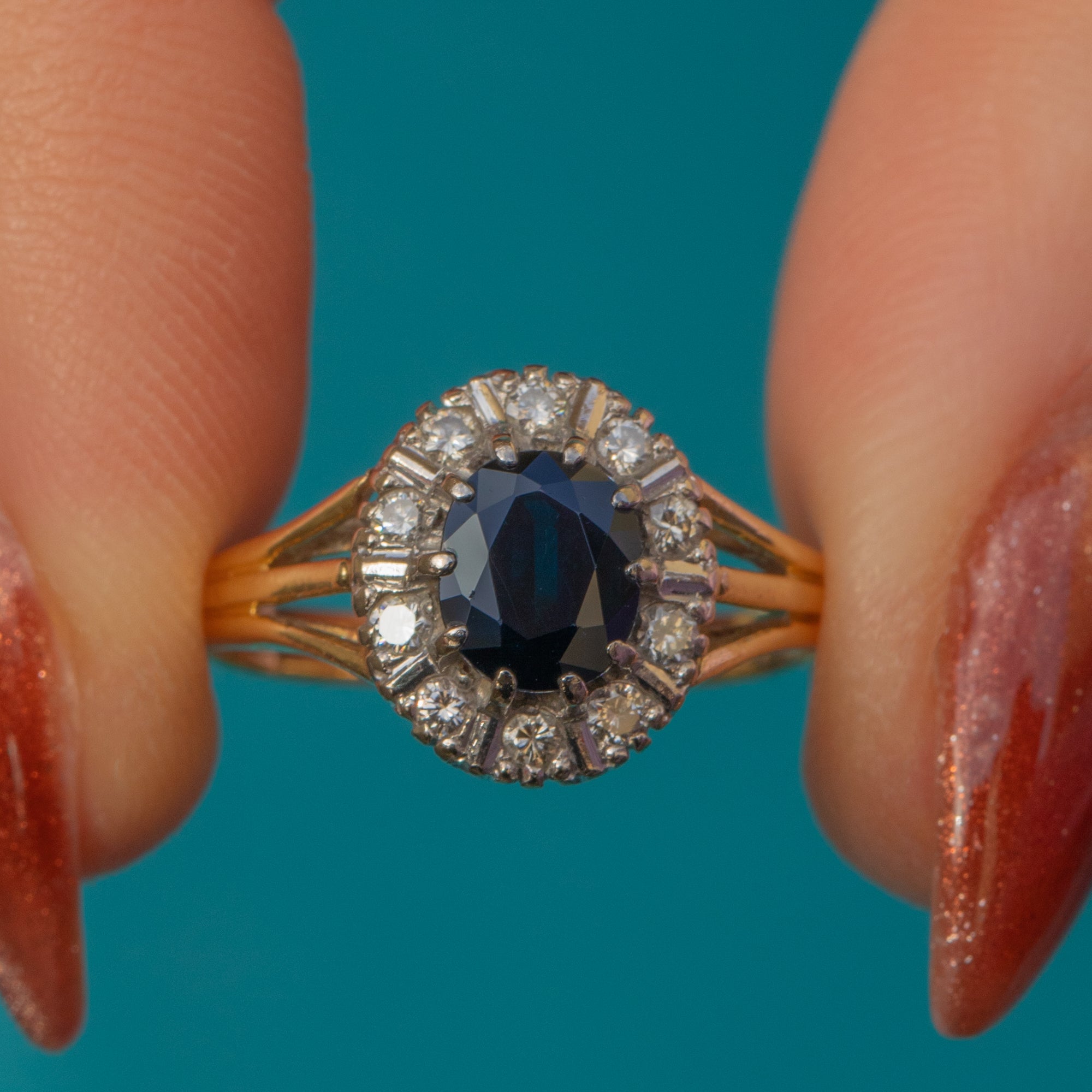 Crafted from sumptuous 18ct Gold, this Art Deco ring features a radiant natural 0.65ct Sapphire in her centre, faceted beautifully to reveal deep midnight blue hues. She is adorned by a celestial halo of scintillating Diamonds, their bright sparkle complementing the richly saturated Sapphire.